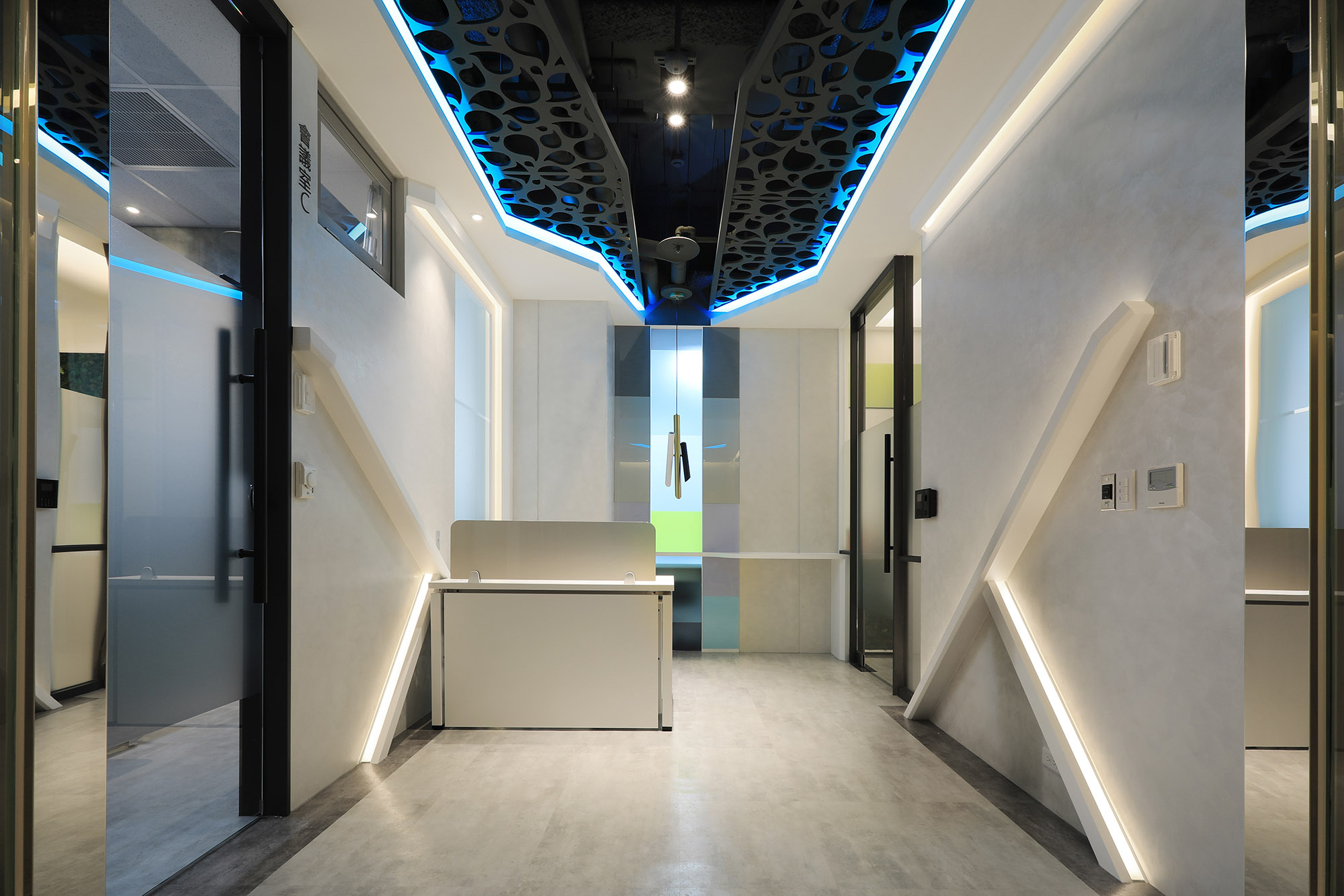 Vertical and horizontal geometries are conducted to further segment the design and layout for connection to all corners in the space. The ceiling in the foyer applied an exposed design with geometric forms and LED lights to accentuate the focus, while the lines continuing down from the wall surfaces are segmented, where the unique paint with the semi-transparent effect of the glass implies the concept of welcome together with the walls on both sides, amongst these, the “入” and “人” shaped lights adopted poison-free eco-friendly paint, offering astonishing visual effects with focus, corresponding to the contemporary environmental protection issues.