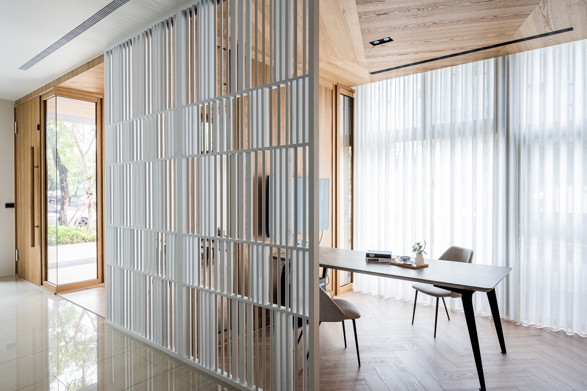 Upon entering, the reception counter replaced gorgeous marble material with eco-friendly grey coating and white artificial stone, which is decorated with a pot of plum tree to demonstrate dignified refreshing sentiment. When looking up, one can see the spatial layout of a small circle and a large circle on the ceiling, which extends downwards to the main discussion area, where the hand-painted art wall is the core image within the space. The discussion area on the right continued with the ingenious vocabularies of the foyer, where the perfect segmentation of the veneer boards structure an alternative sense of layer; the indirect lighting from the French window spreads out along with the lighting of the silky soft veil curtain.