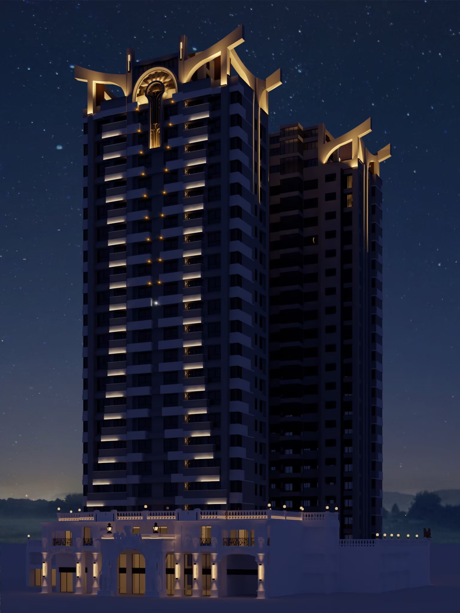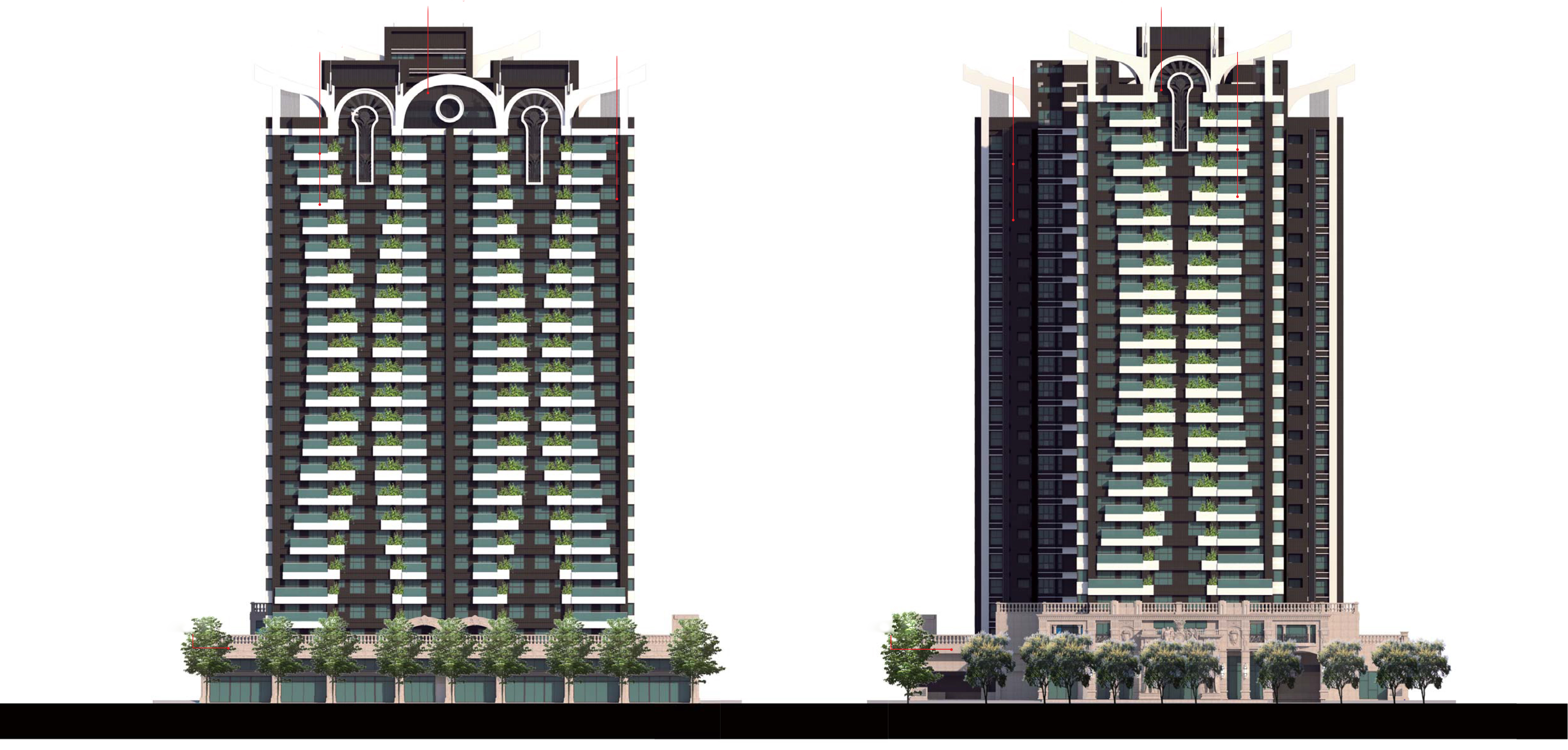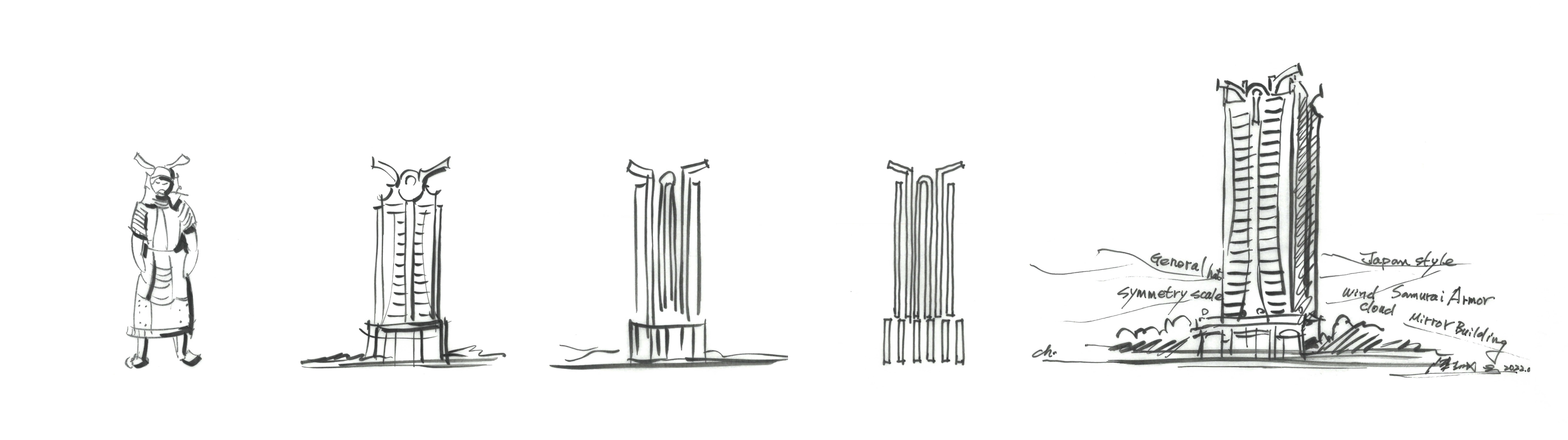 Unlike the lower and upper parts of the structures with traditional elements from Eastern and Western cultures, the middle parts feature a design of modern architecture, with neat, sleek curves reaching up from below. The balconies of the housing units, transformed from the armors of Edo Bakufu, serve to turn modern Japanese architectural lexicon into sustainable vertical greenery on the façades of the buildings, adding greenness and life to the black-and-white floors of the simple buildings. Where the East Meets the West is a combination of Eastern and Western aesthetics that also blends the traditional and the modern, thereby ingeniously constructing new-era structures with a mix-and-match style and multiple imagery. Thus a unique exemplary landmark is born, imbued with aesthetics and tastes rooted in diverse cultures.