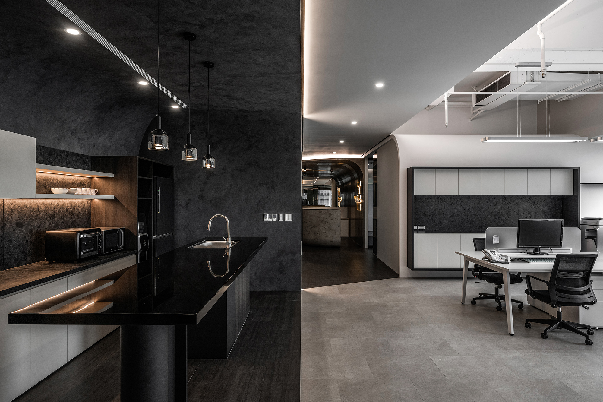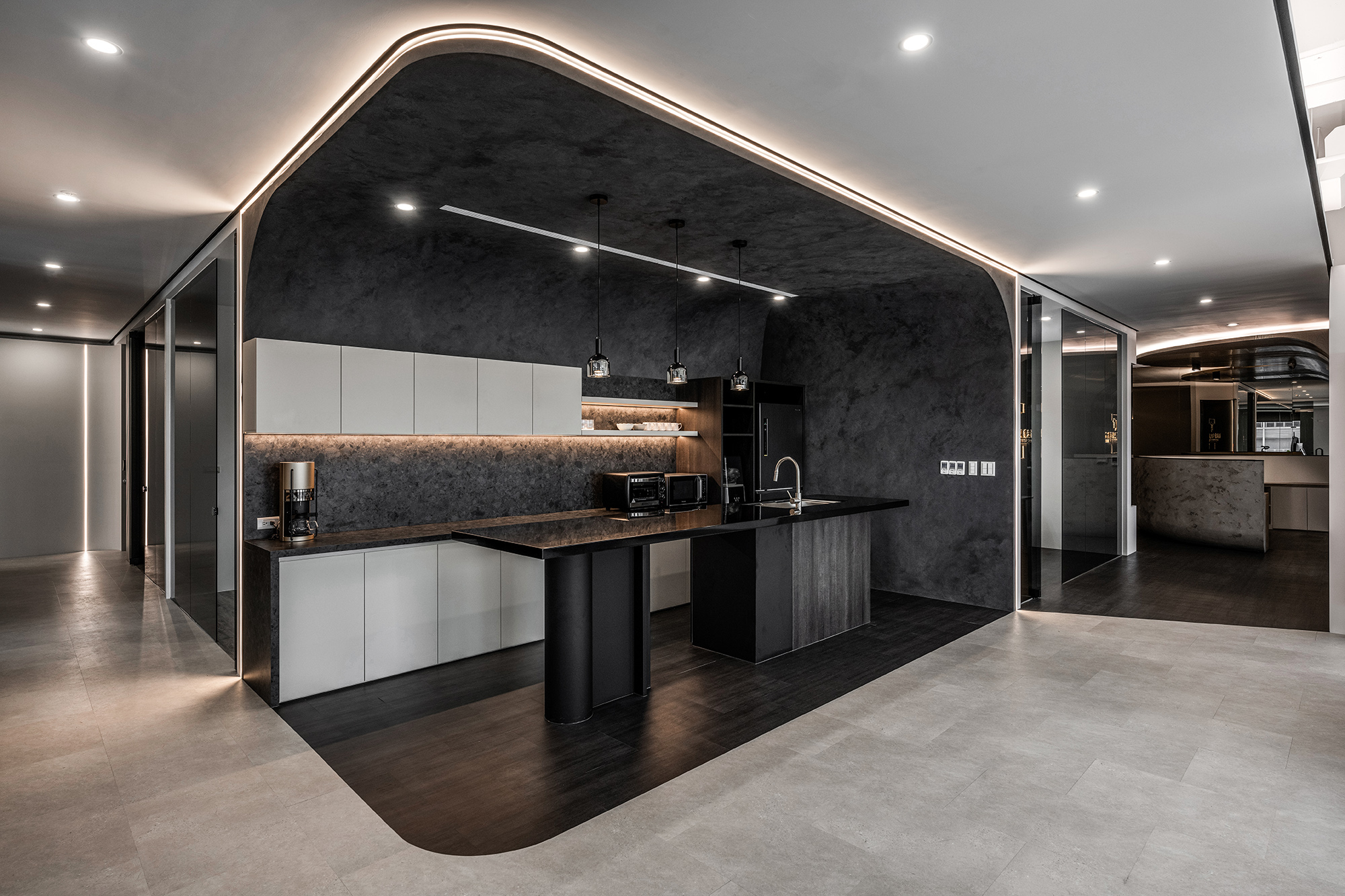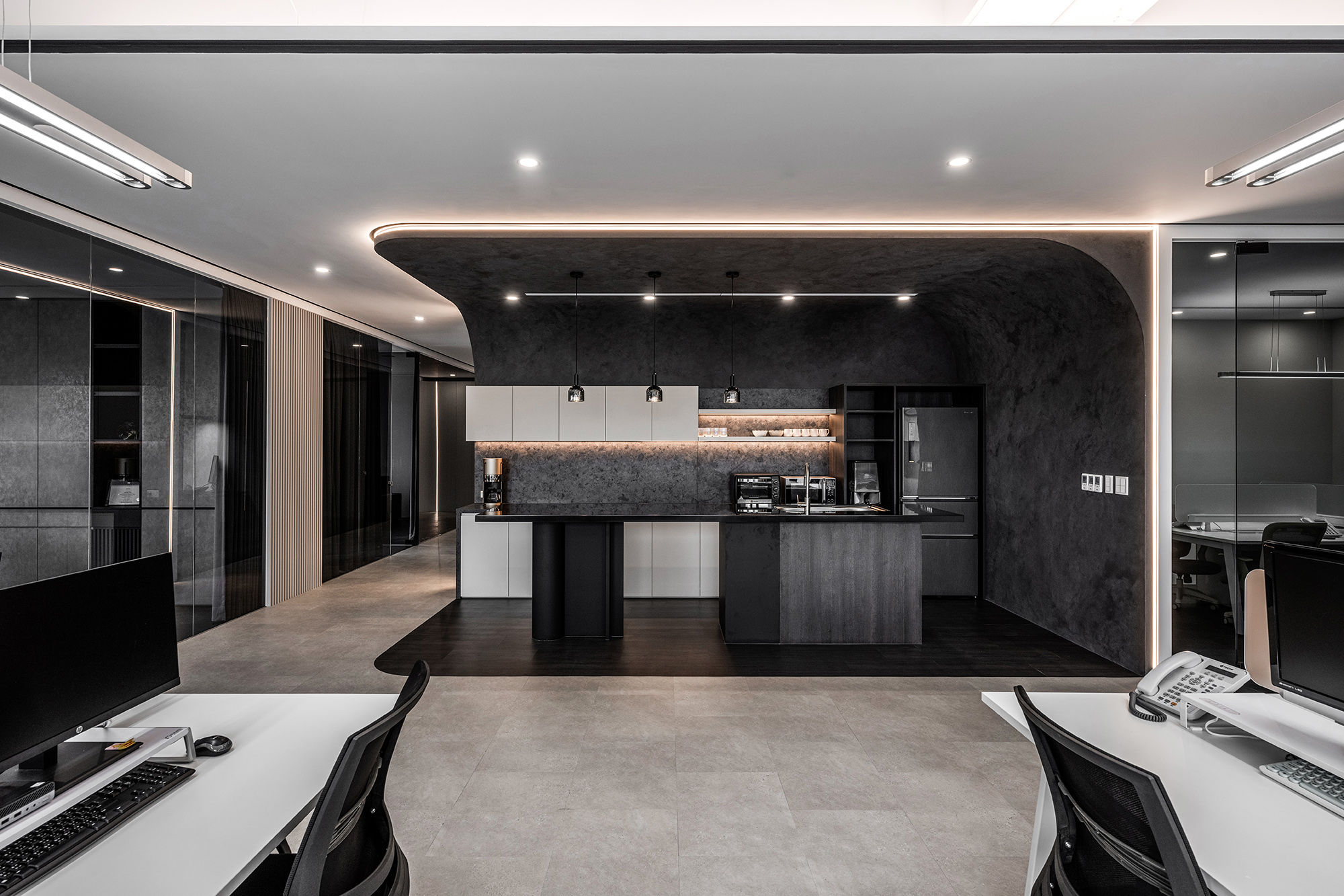 The richness of black palette pantry sits in the middle of the work space as the center at the corner, making a vivid contrast with the bright and white open-plan working area. The dark glow allows workers to relax from intense thoughts, offering a corner to interact and building interpersonal relationships in the work team. The rounded, curved frame shines with its fluid, linear, embedded lighting, reflecting on the tinted glass panels of the opposite private office, which creates a symmetrical aesthetic between the reflective world and the reality.
