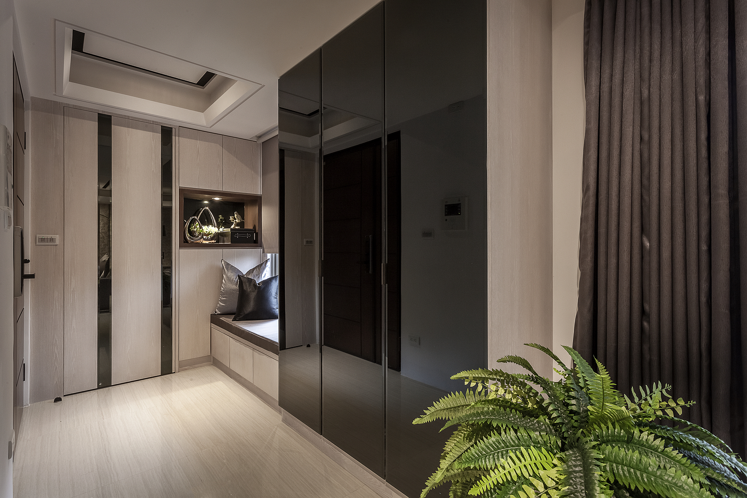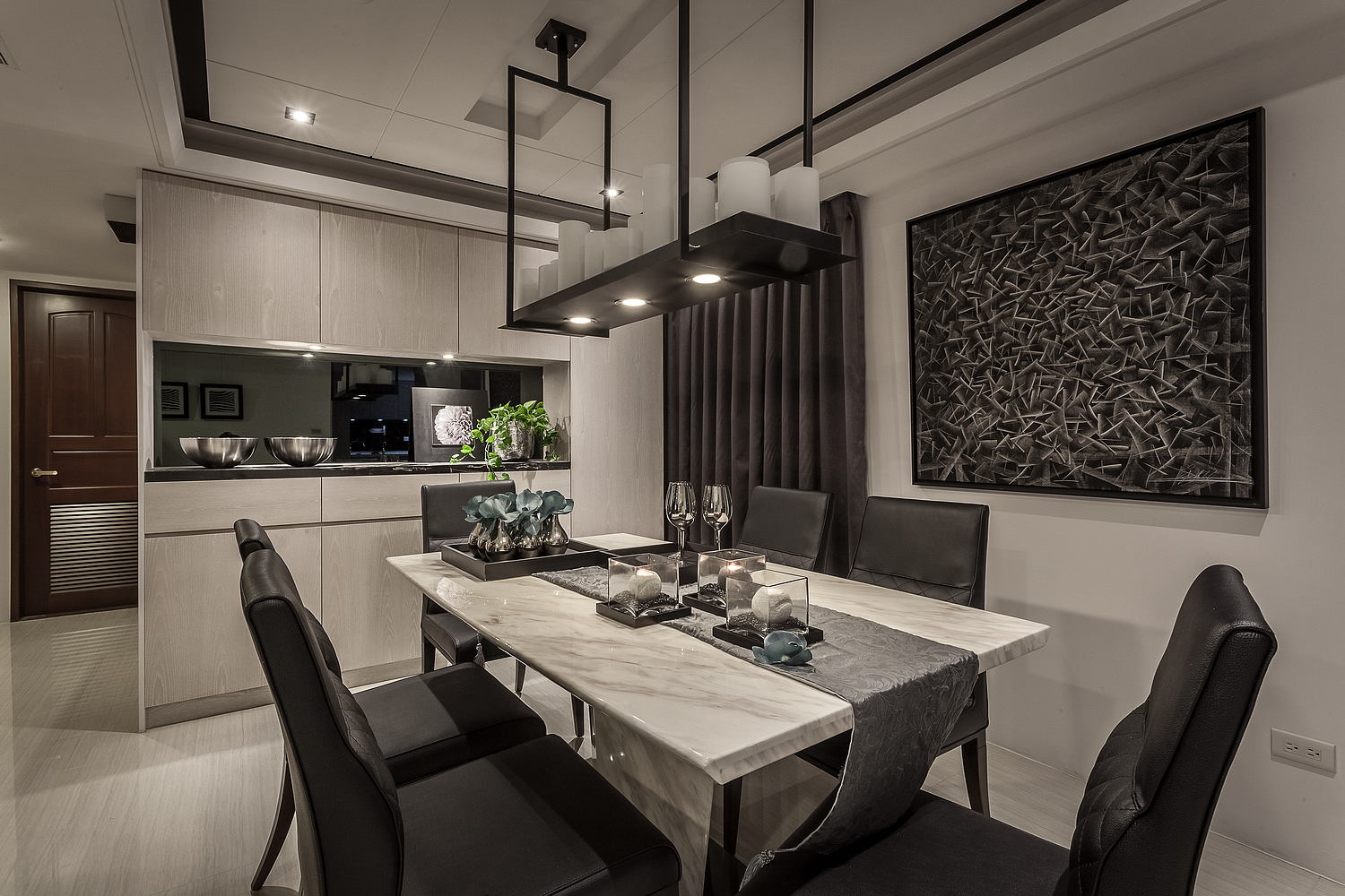 On the contrast to the light wooden grains, the black cabinet displays the modern style and strengthens the characteristics of space. In the living room, the classical wallpapers and colors elegantly manifest the quality of “modern classic.” Through the grilles, the visual contact easily reaches the dining room whereabouts the metal materials interact accordantly with the steel staircase.