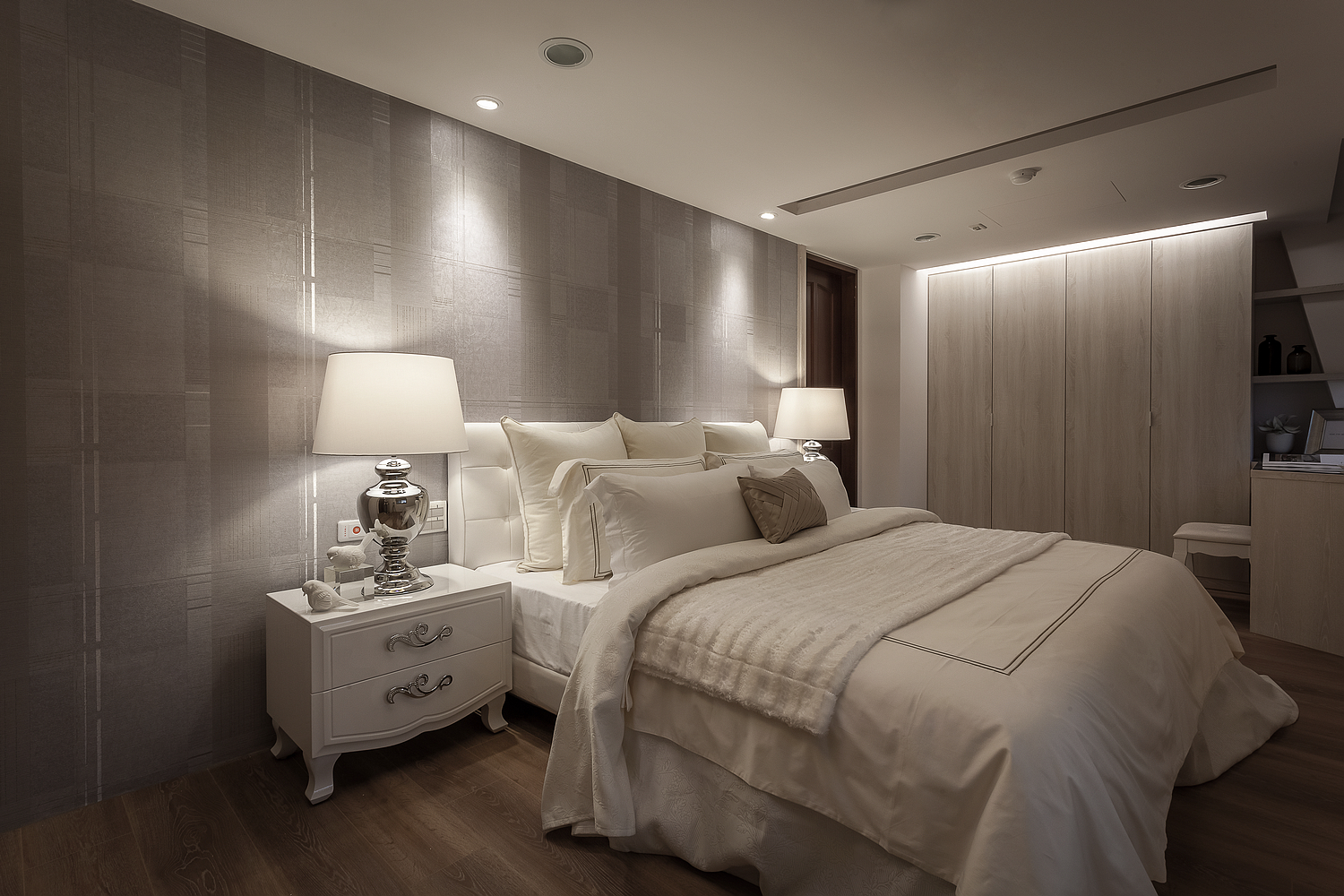The mezzanine space is planned for the main bedroom and kids’ room. The crystal chandelier presents the beloved classical style by the hostess. The pure white bed and furniture are consistent with the philosophy of designer, quoted “the design idea relieving stressful life style has left the space in the residence telling the story for the family.”
