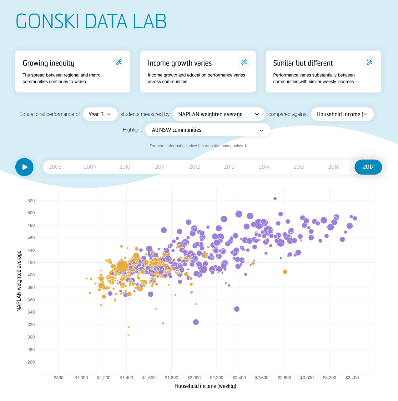 The mission of the Gonski Institute for Education is to address growing inequality in Australian education. The institute wanted to provoke questions about the effect of social influences and policy changes on student performance, and turned to Small Multiples to create a dashboard that would combine different data sources to give a big picture. The aim was not to draw inferences about cause-and-effect, but to present the data in a way that encourages further exploration of the facts. The tool allows users to visualise and correlate multiple variables (location, income, and youth unemployment levels for example) with various educational results (e.g. NAPLAN average, literacy and numeracy).