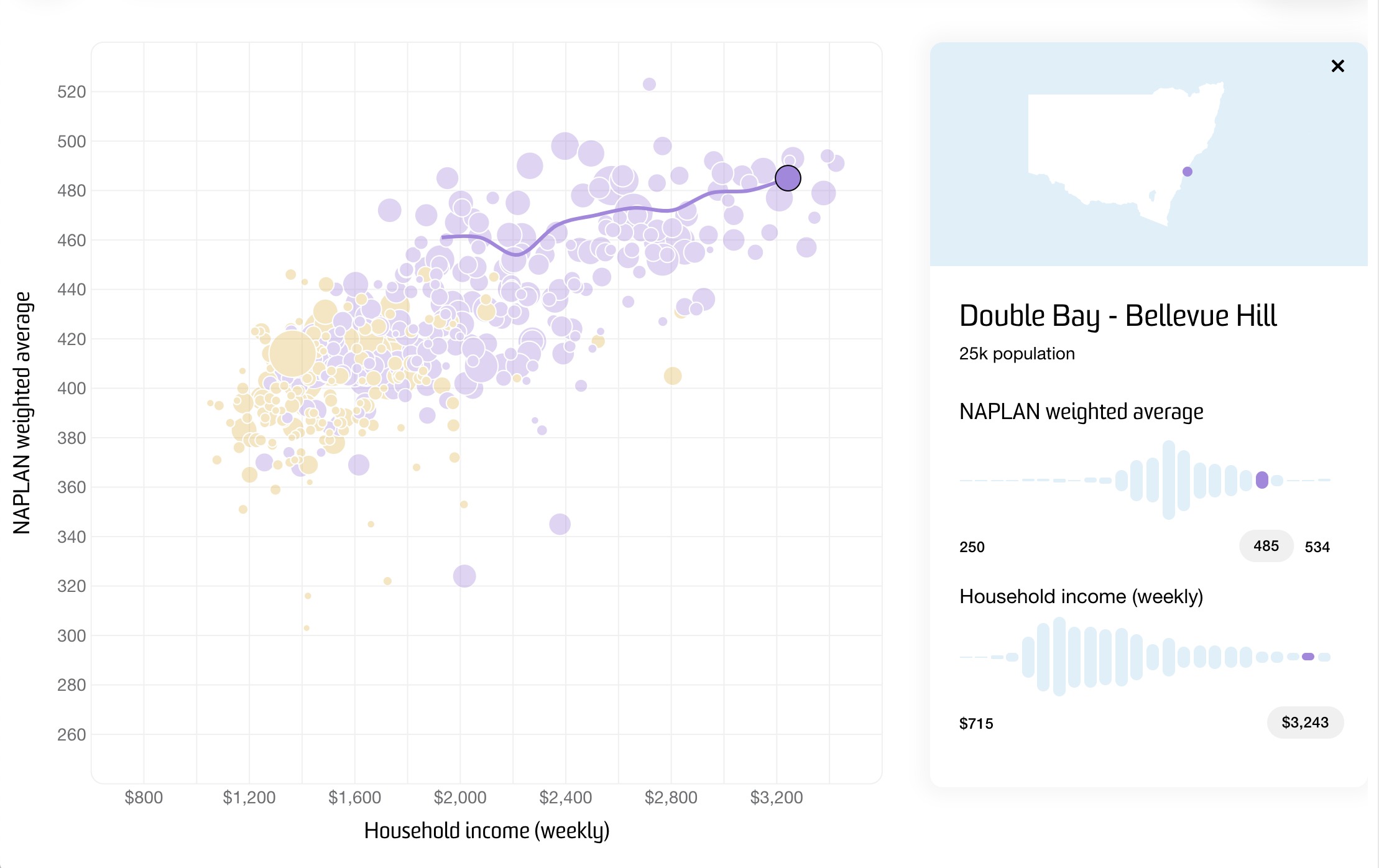 The project was recently featured in a Sydney Morning Herald article, where the tool itself was also embedded for people to use. The piece received tens of thousands of page views and high engagement times, reflecting the public need for this information. "Money can’t buy good grades, state-wide NAPLAN data reveals": https://www.smh.com.au/national/nsw/money-can-t-buy-good-grades-naplan-data-reveals-surprises-20210215-p572j6.html.