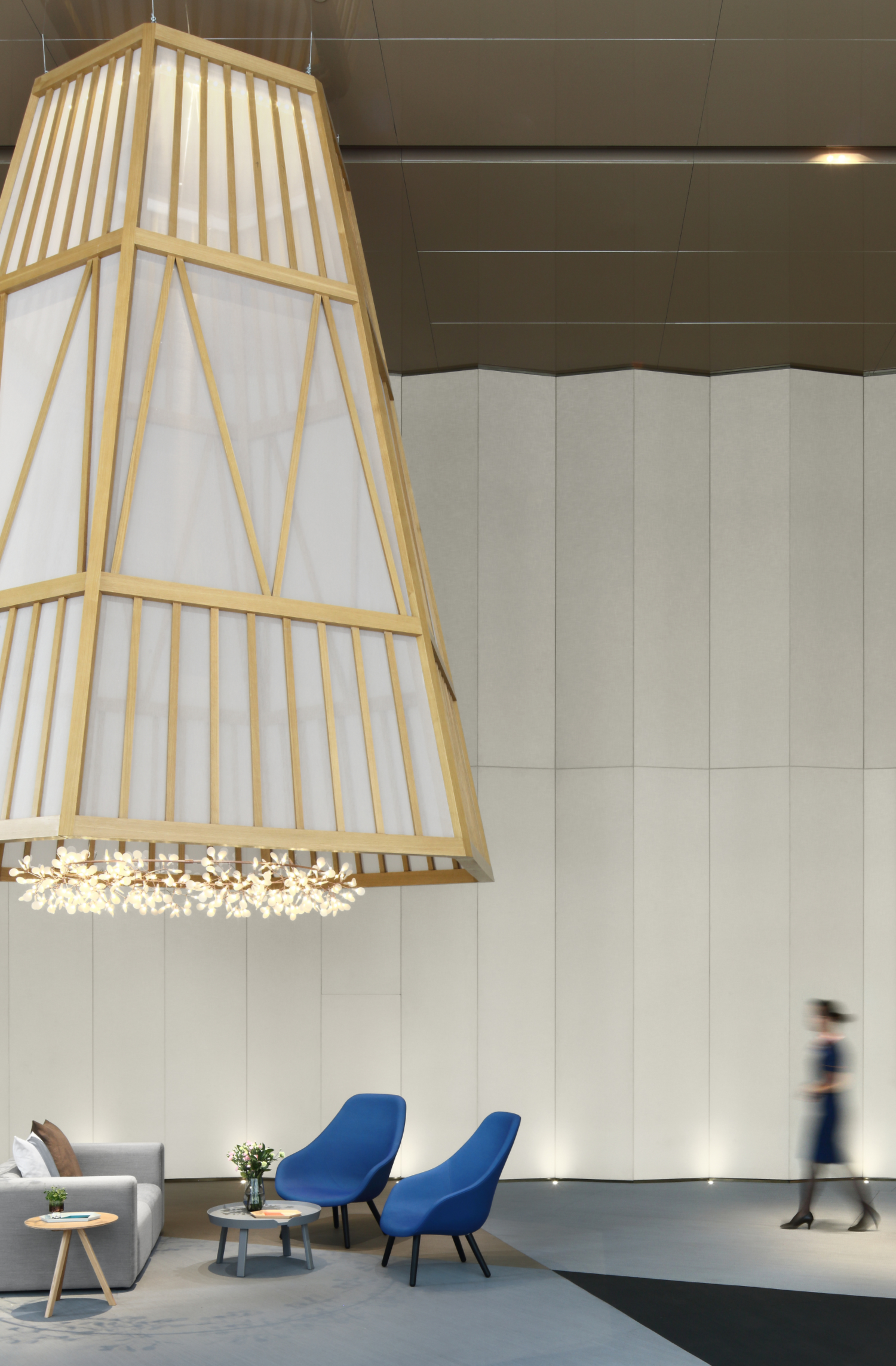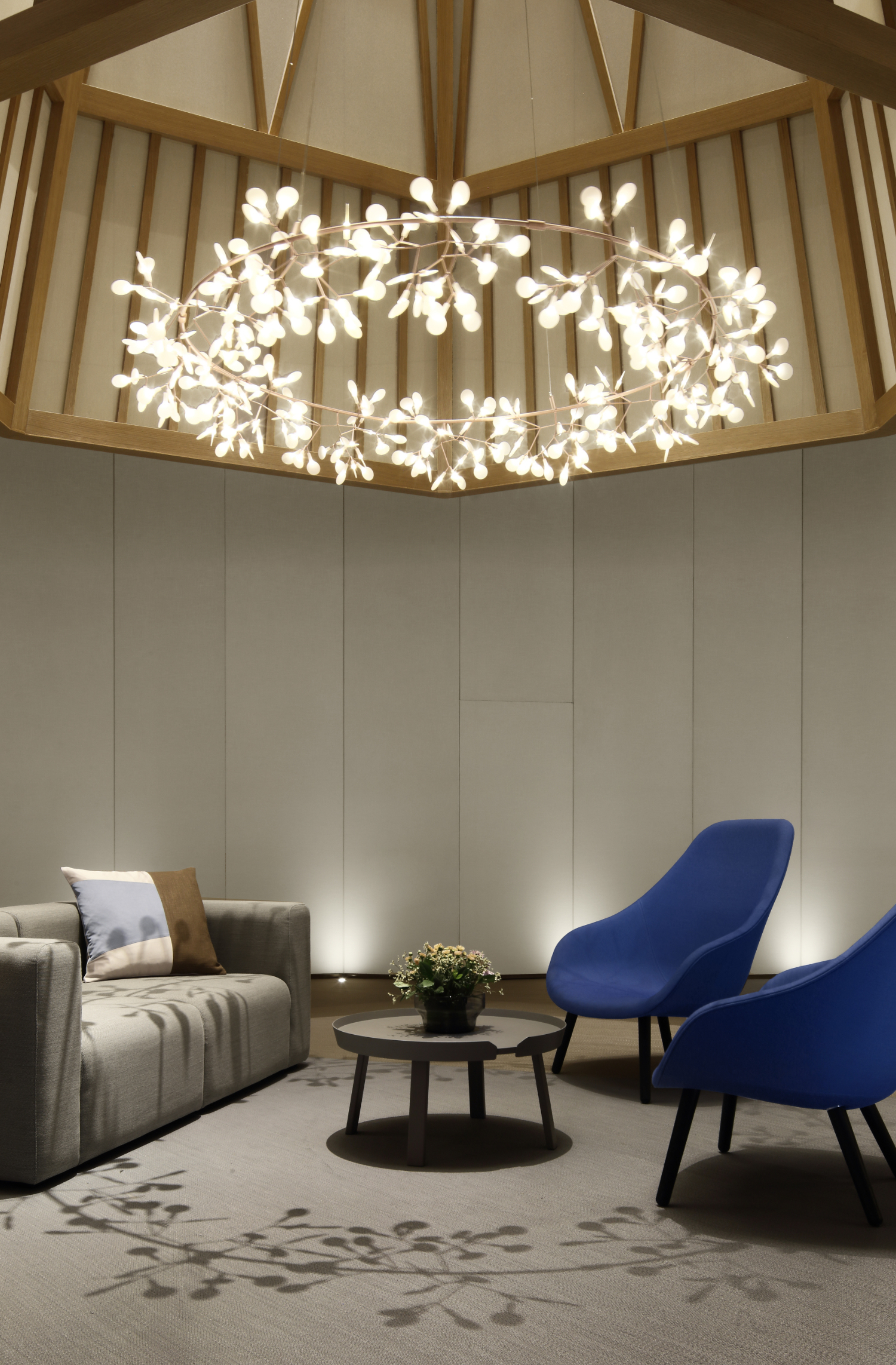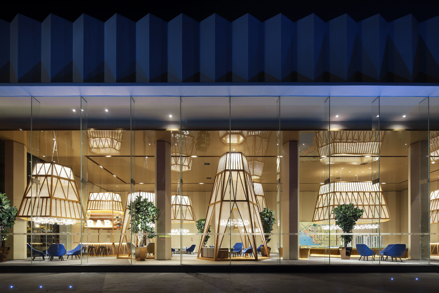 Circular artistic lighting is set at the bottom of each pavilion, light up the darkness inside. You will find yourself as if exposed at a serene night with a universe of stars, to capture those fascinating scenes of dreamland. Incorporating imported furniture and accessories, the space appears delicately unsophisticated and distinctive. The interior wall parallel to the glass wall has been applied the same Origami shape, coming up with an unaffected ambiance of co-existence. Other supplementary spaces hide behind the wall and are connected by a passageway. Anteroom, women/men’s room and rooms on the higher level are accessible through the passageway individually.