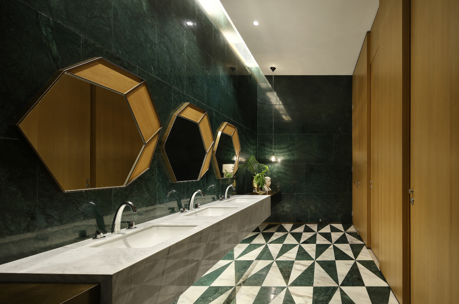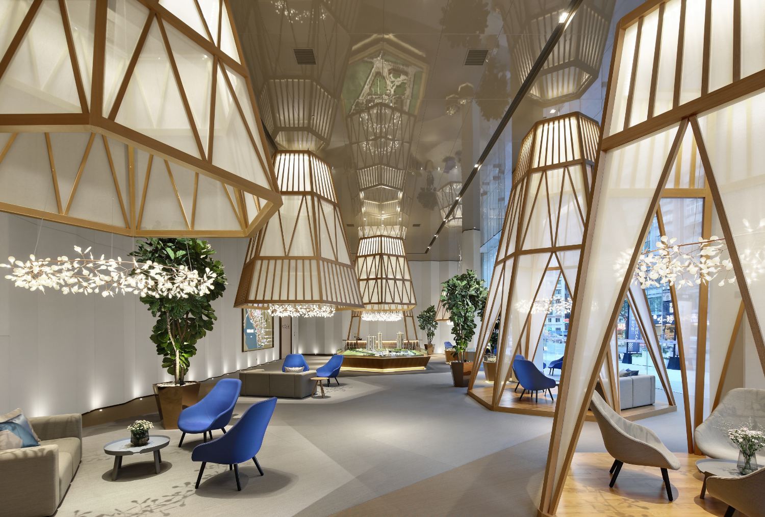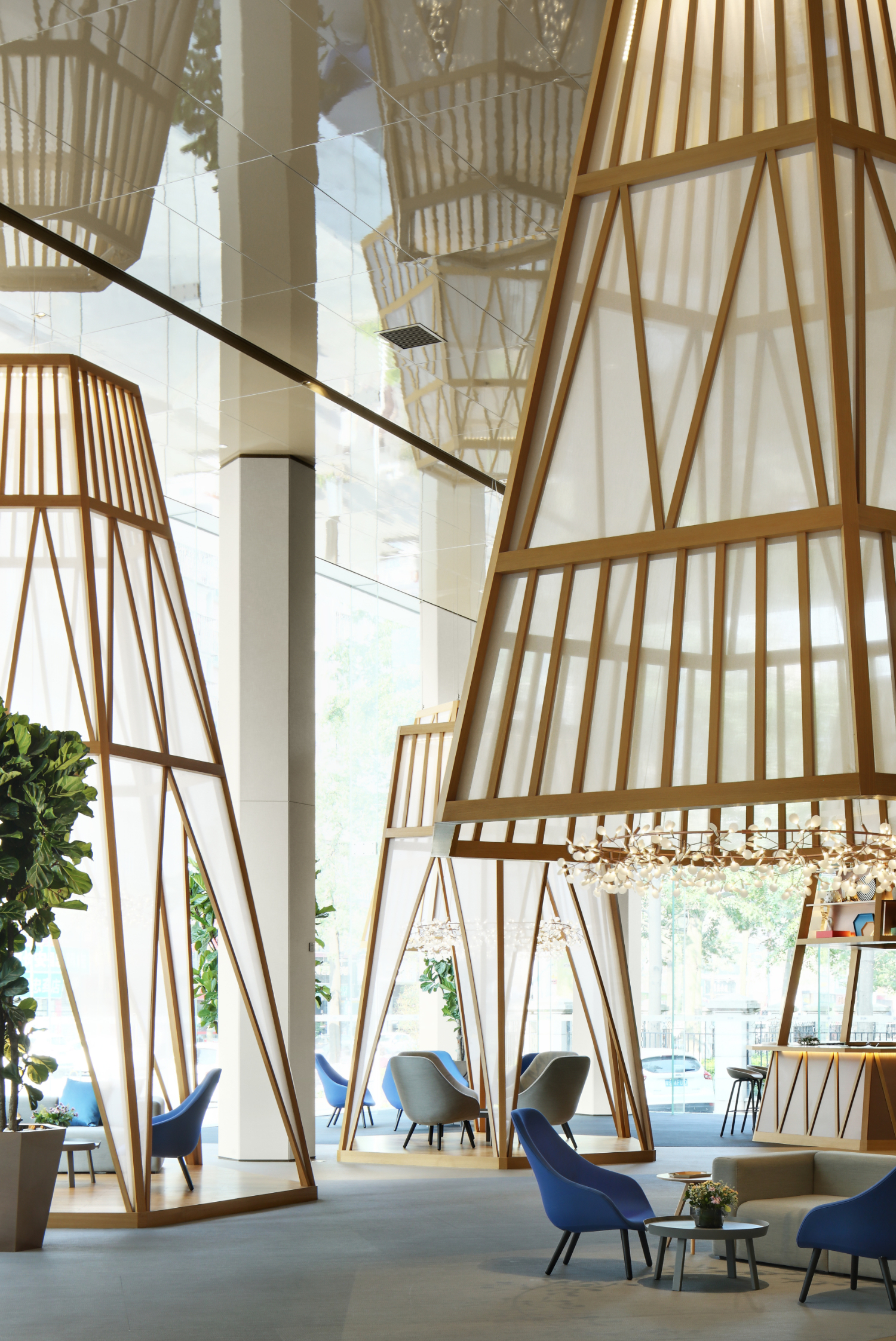 Circular artistic lighting is set at the bottom of each pavilion, light up the darkness inside. You will find yourself as if exposed at a serene night with a universe of stars, to capture those fascinating scenes of dreamland. Incorporating imported furniture and accessories, the space appears delicately unsophisticated and distinctive. The interior wall parallel to the glass wall has been applied the same Origami shape, coming up with an unaffected ambiance of co-existence. Other supplementary spaces hide behind the wall and are connected by a passageway. Anteroom, women/men’s room and rooms on the higher level are accessible through the passageway individually.