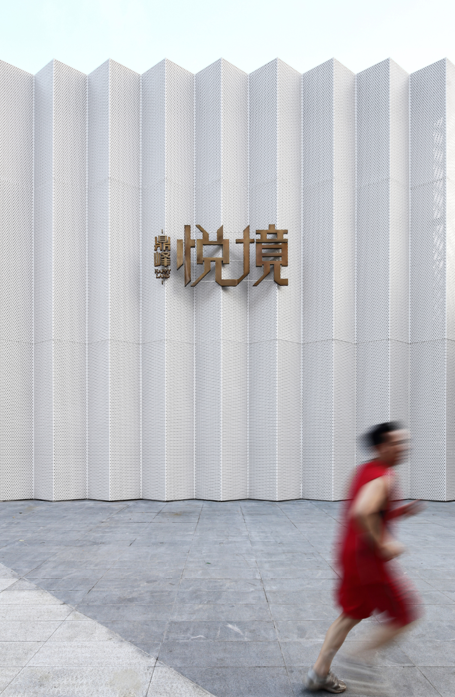 HappyLand Sales Office is located in Chang‘ an Downtown and strews at random in high buildings nearby. Because of its intervention, this grew old town marches forward under its sparkling presence. Perforated silver aluminum panels, adhering to the façade, covers this square-like site and work as an effective medium to keep the air circulating while decreasing a part of noise outside. But concise Origami-shaped vertical skin increases the area of contacting air while making the gigantic dull ‘box’ dynamic instantly, as if rippling on the water and causing an ambience of co-existence between movement and still while contrasting with raucous street beside; the square placed in front of the building strengthen the atmosphere of dignity and grace, auxiliary to the sales office as a steady fortress to defend external invasion.