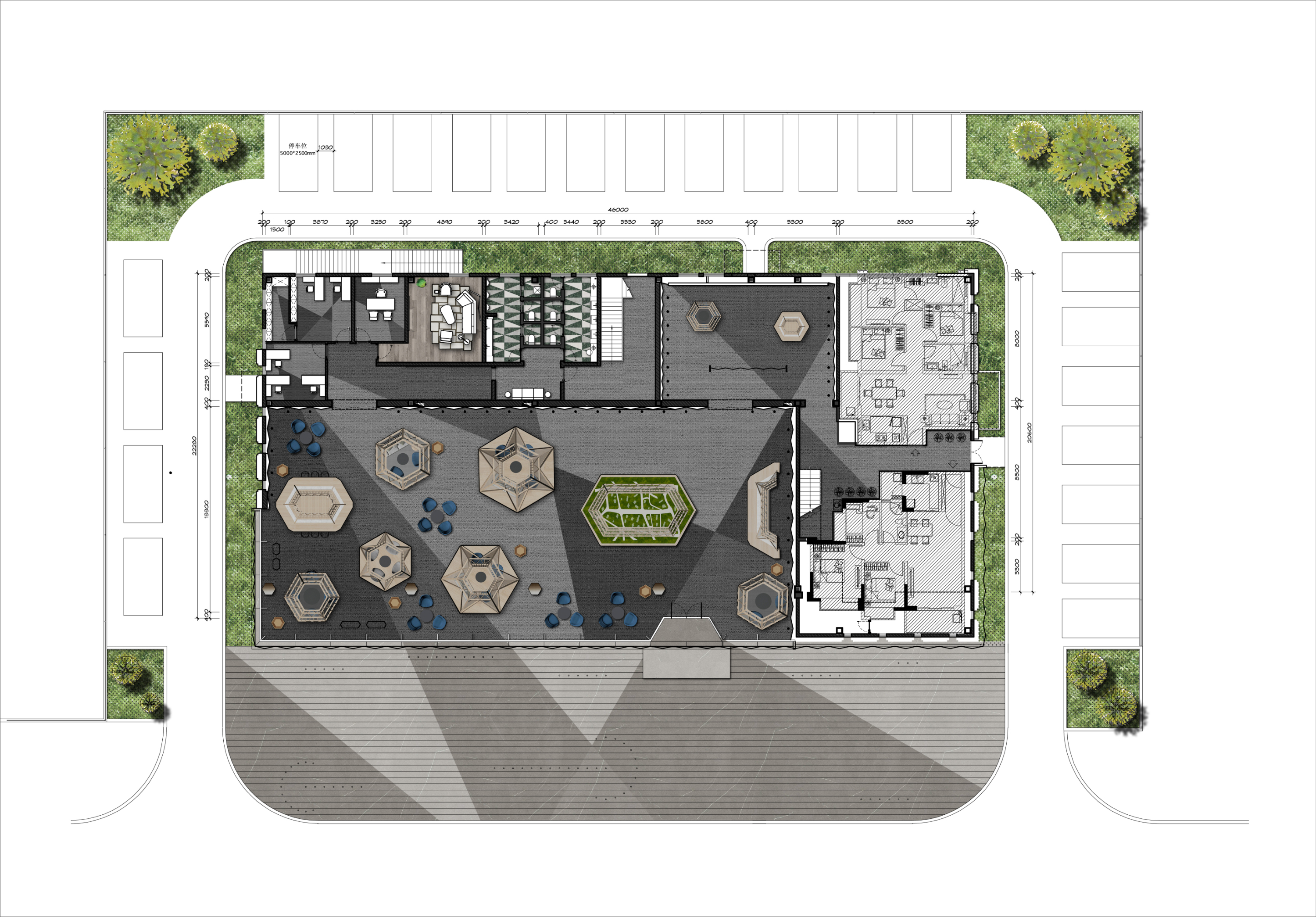The single volume was divided into various functional sections through the simple and orderly arrangement. The barrier-free sight experience in all directions brings a balanced transition between inside and outside, apparently natural and harmonious. For the reason to partition distinct functional areas, the architect created several small-scale oak installations parallel to a pavilion and managed to utilize them in the planned layout. Indeed, it breaks a new ground of itself, and well-proportioned arrangement adds great vitality to the entire space.