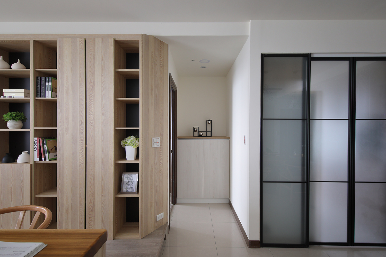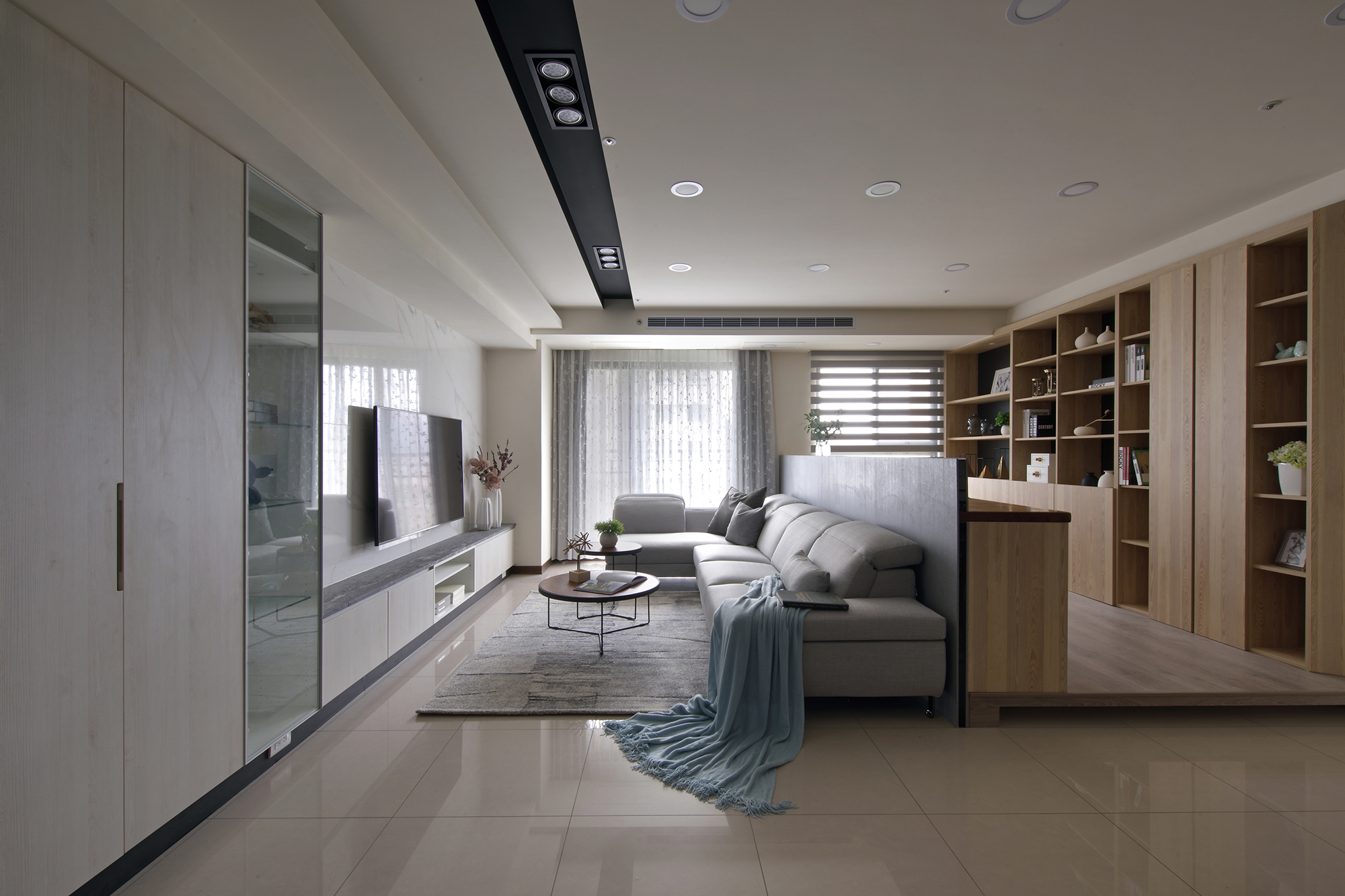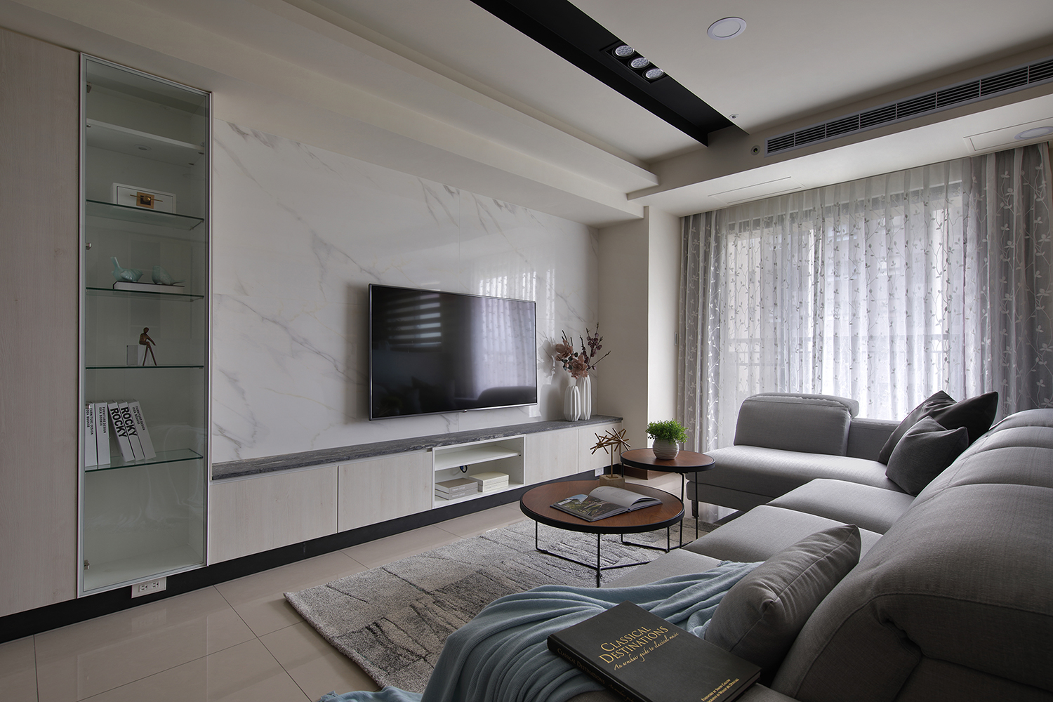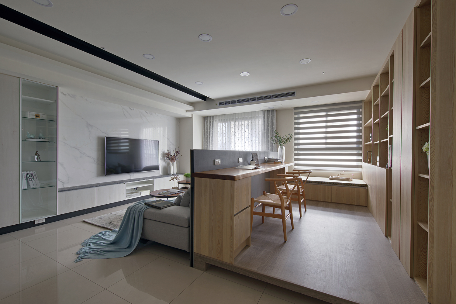 The living room furnished with the neutral-shade marbles and white ceilings develops the graceful impression. The study area, a public space right hind the couch in the living room with a lower wall, is spread with abundant sunlight on the side, and is ornamented with an exhibition wall on the back.