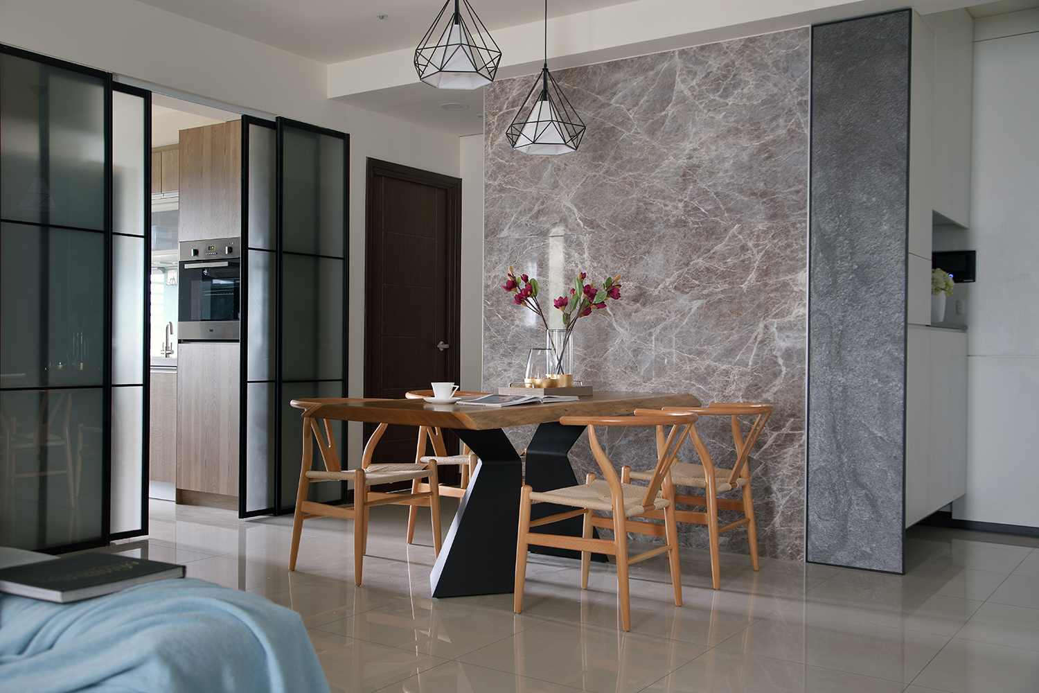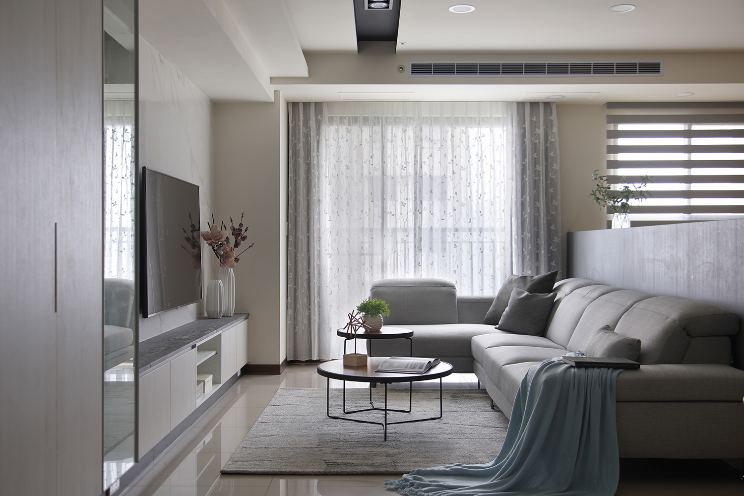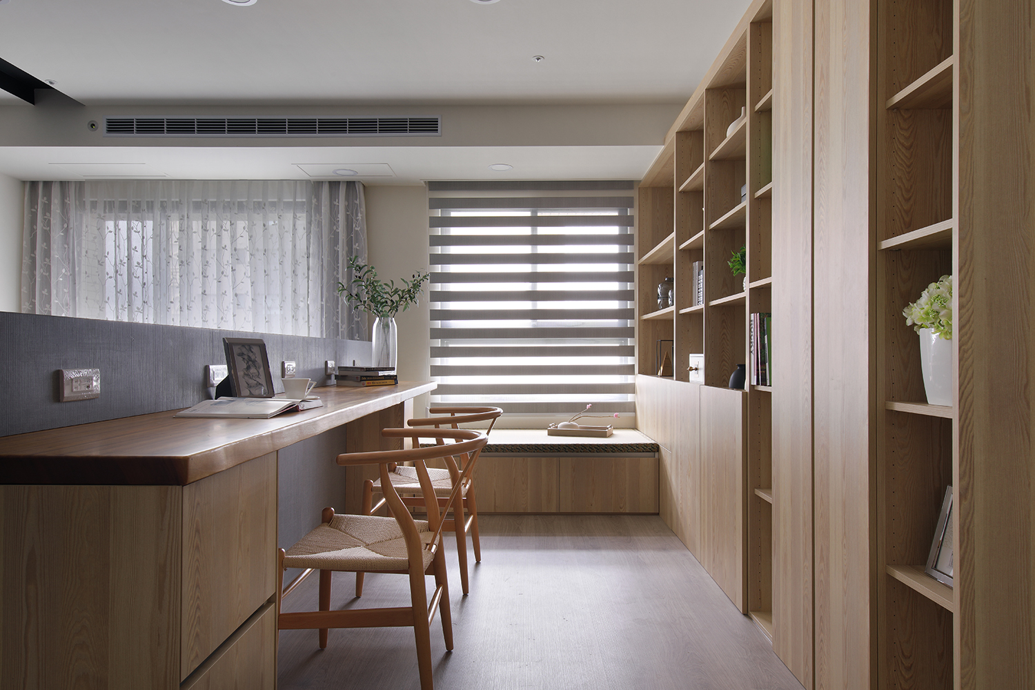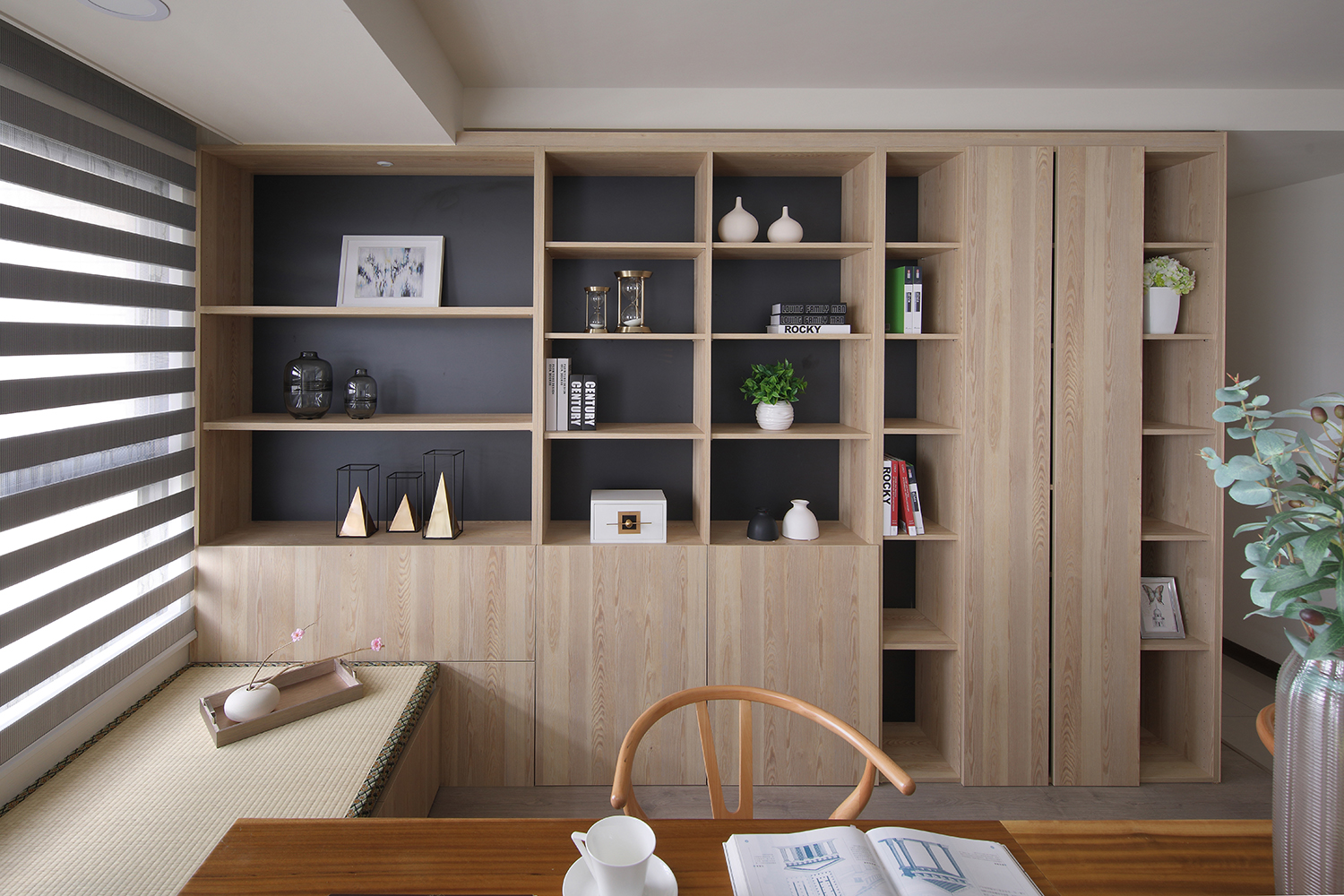 The living room furnished with the neutral-shade marbles and white ceilings develops the graceful impression. The study area, a public space right hind the couch in the living room with a lower wall, is spread with abundant sunlight on the side, and is ornamented with an exhibition wall on the back.