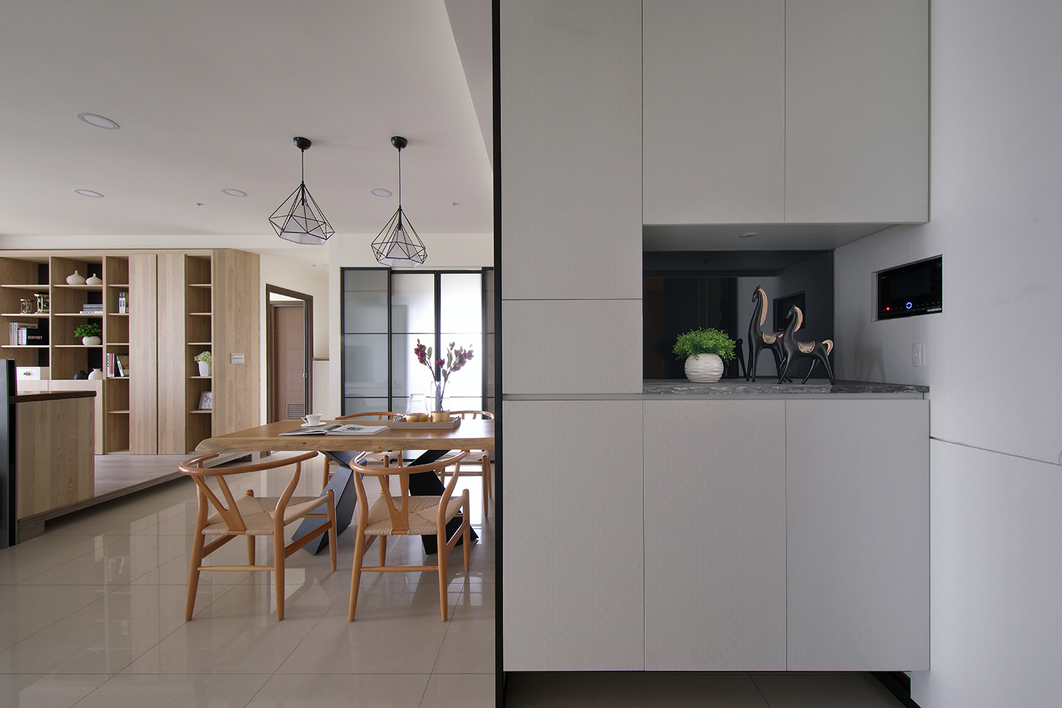 The dining room, on the other side of living room, is decorated with pink marble walls, delicate log dining table and chairs, and exquisite ceiling lamps displays the delightful atmosphere, while sustaining the smooth traffic flows meanwhile. The black string adornments, recessed on the white ceilings in the public area, craftily sustain the consistency of space characteristics, which are plain and exquisite.
