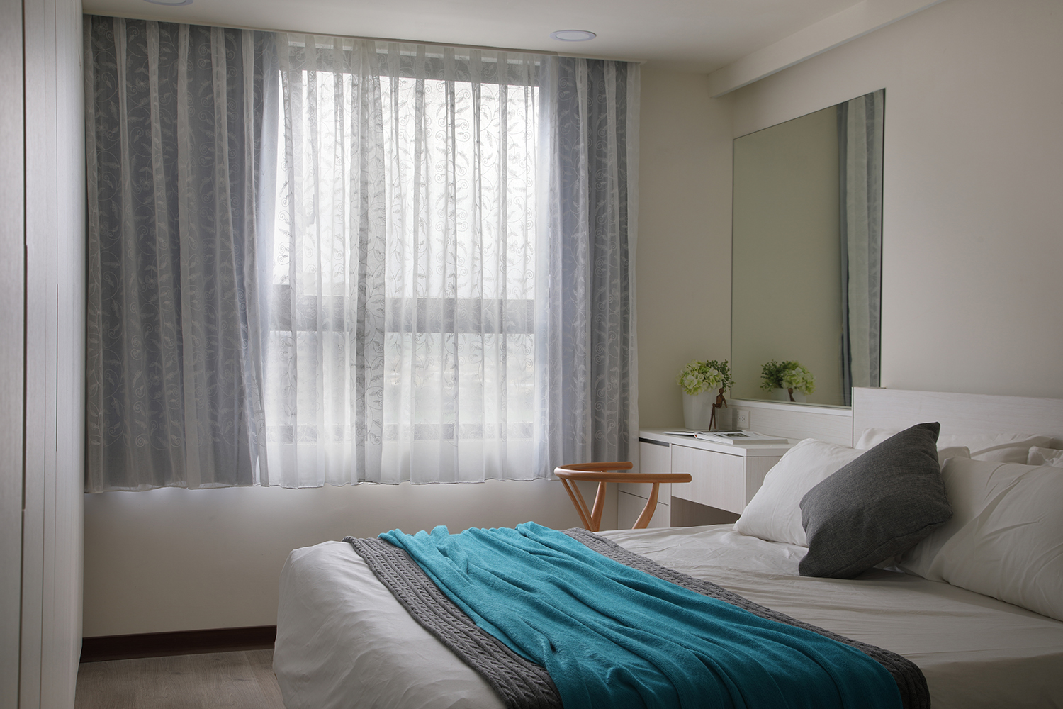 The bedroom decorated extensively in taupe reveals the pleasant aura, of which the applications of woods and stones distinctively luster in textures, and the accommodating layouts accordantly balance the functional and aesthetic features as well.