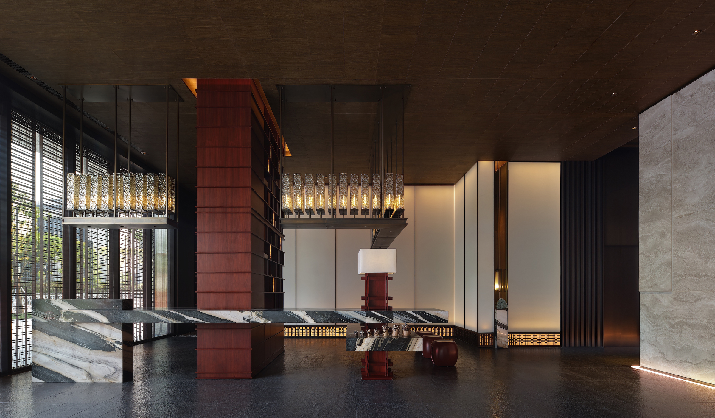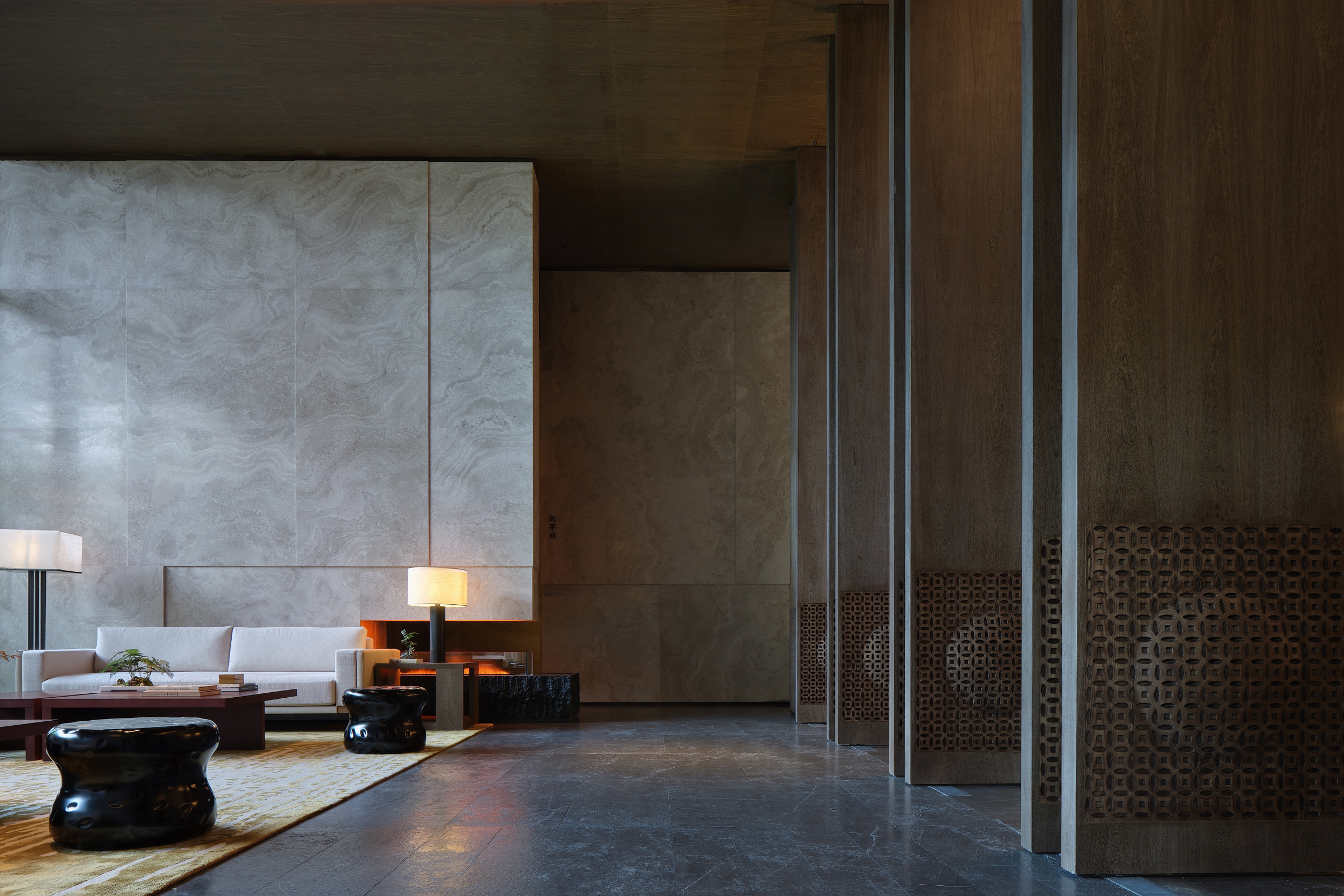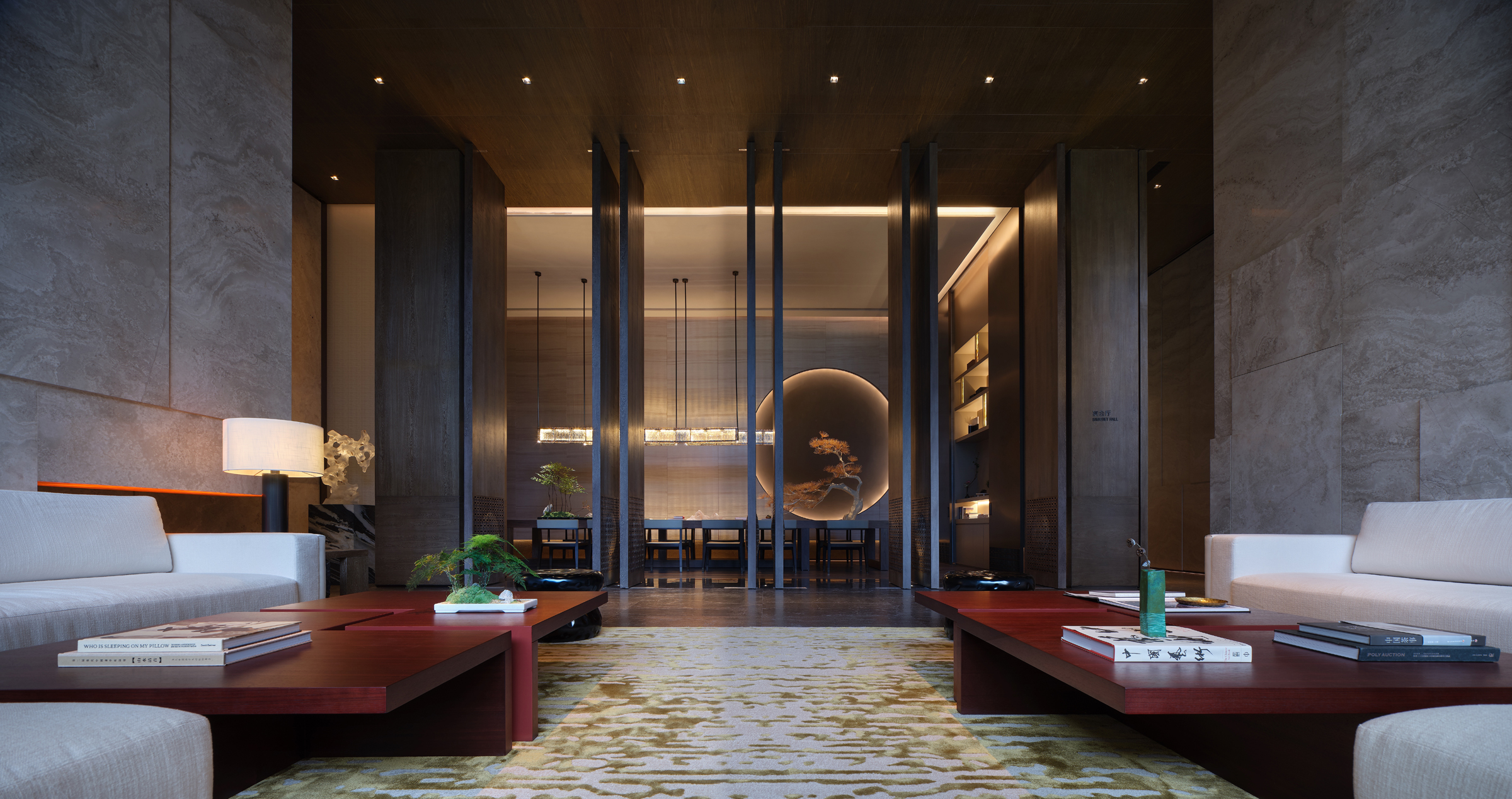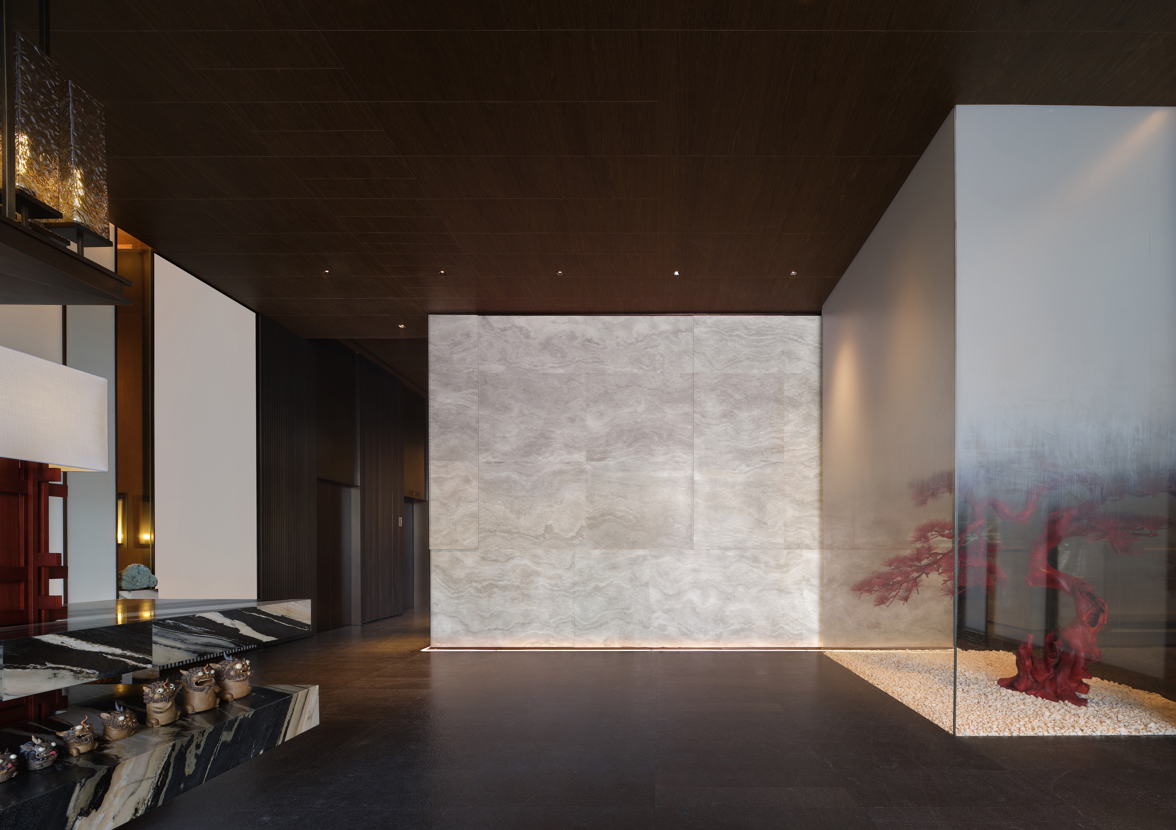The entire mansion has sinuous beauty based on the smooth flow of lines. Visitors often cannot experience the entire beauty at a time and are attracted to explore more. Starting from the welcome hall, a few ancient meanings are painted by a large area of mahogany color. And the gentle texture of the marble shadow wall is like a slowly spreading landscape painting which looks like the twilight, the rain, and the continuous mountains. The texture of modern materials is so ingeniously connected to the emotions of space while the architectural vocabulary is naturally used like antelope hanging horns. It is appropriate to understand the main purpose of eastern aesthetics which "Ideal conditions are integrated into the feelings and the landscape into the subjects." Here, you can feel certain ancient charm, some meditation and more leisure as if there are feelings beyond the scenery, voice beyond the words and the ideal condition beyond the picture. A rosewood fake pine in the corner is the best silent commentary for this poetic picture.