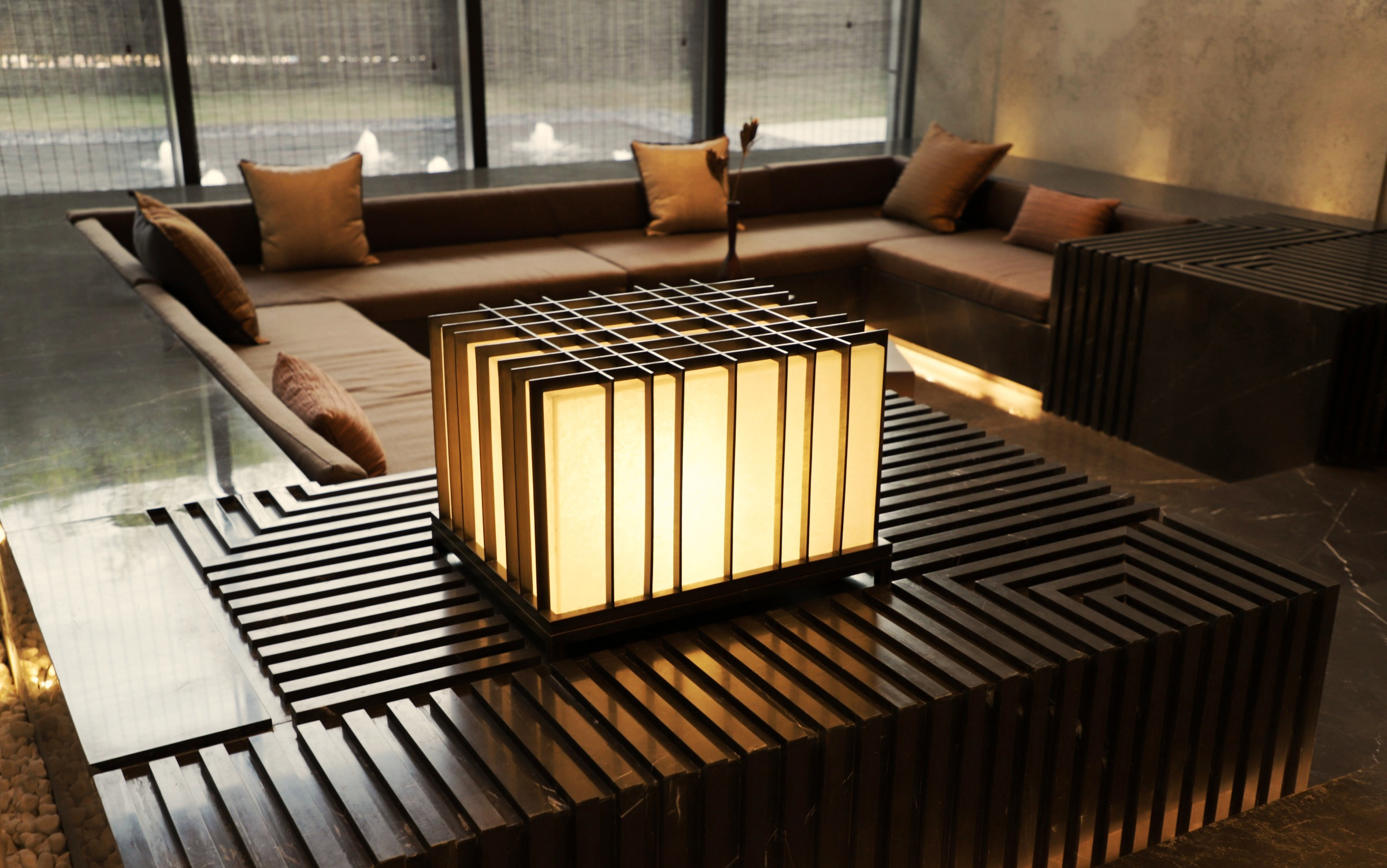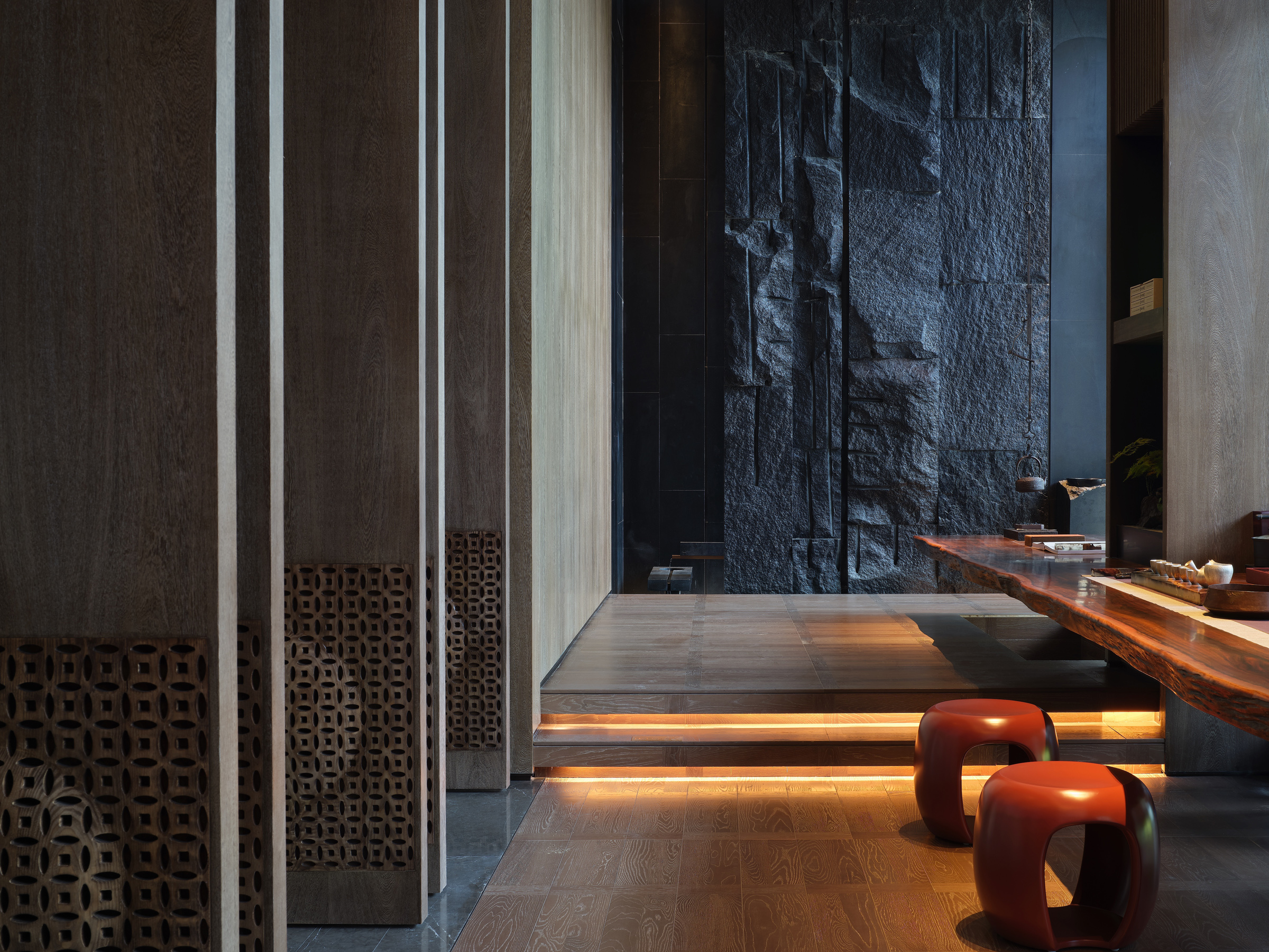 As a homage to Italian prominent designer Carlo Scarpa, the sunken talking pit shows the poetic rhythm by abstracting the smooth lines. It reflects a unique beauty with the intersection of space and structure in a limited space is explored and geometric prototypes and lines reorganized.
