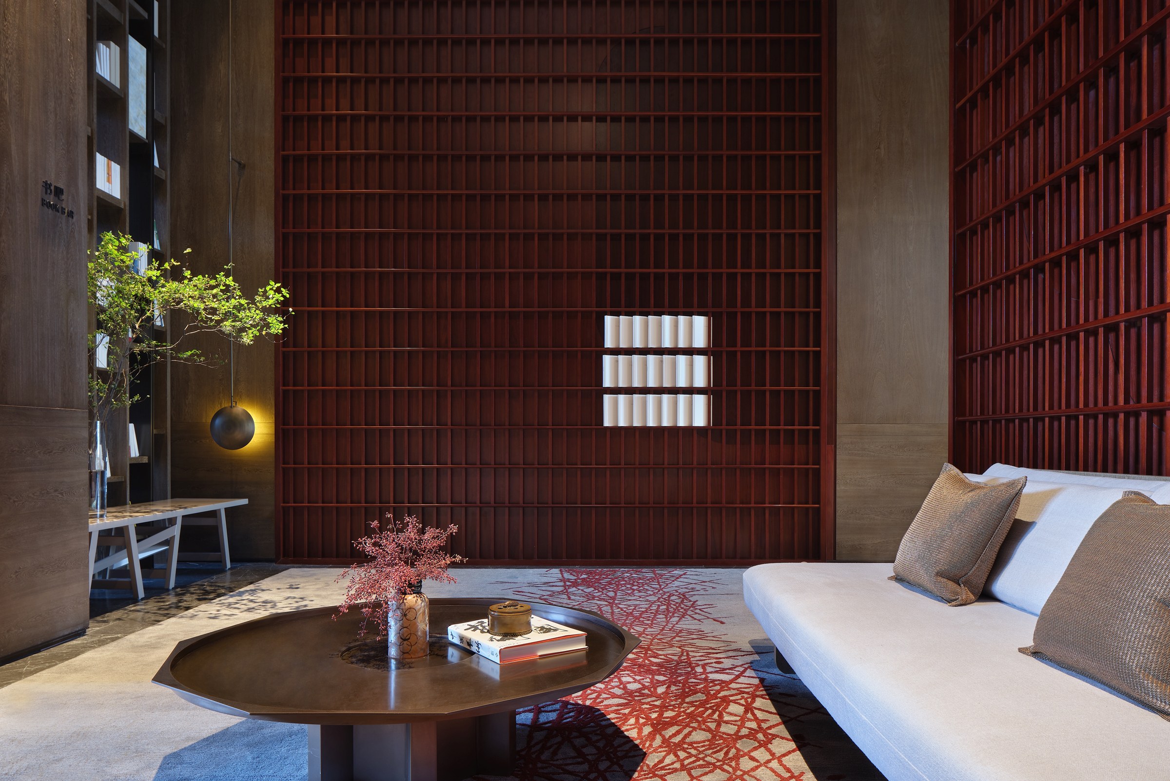 In a closed and open space, the designer consciously combines humanities with nature, focusing on creating a perfect ideal conduction with scenery here. The display wall outside the book bar is filled with all kinds of art, which can naturally introduce a fragrance of book into the room from the outside. In the book bar, a thin wooden fence is used as a partition, as that it continues to the external space in order. The texture of the carpet and the fine wooden fence partition seamlessly blend together, and the visual extension on the plane expands the depth of the space. As a result, visitors produce imagination about appreciating the ancient and the modern.