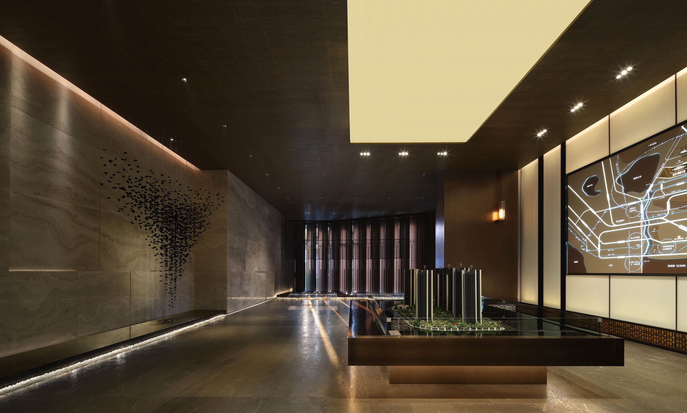 Jinzhong Kylin Mansion Hushan Art Gallery, with its unique design perspective and new expression form, boldly integrates Chinese aesthetics with modern architectural techniques. In the name of poetic Oriental, the designer tries to use the ancient simplicity and calm demeanor of oriental aesthetics to inject a touch of grace and elegance into the modern lifestyle. The sales center will be transformed into a theme club of book bar in the later period. The designer also fully considered the response to the functions of the later club when designing this case in order to reduce the costs of secondary design and transformation. For emphasizing the comfortable and tranquility of east life, the designer refers to the theory of flowing space by Smith Van Der Rohe, and minimized the partition of the blocking space, so that the space is simply and necessarily divided instead of being divided into independent individuals according to functions.