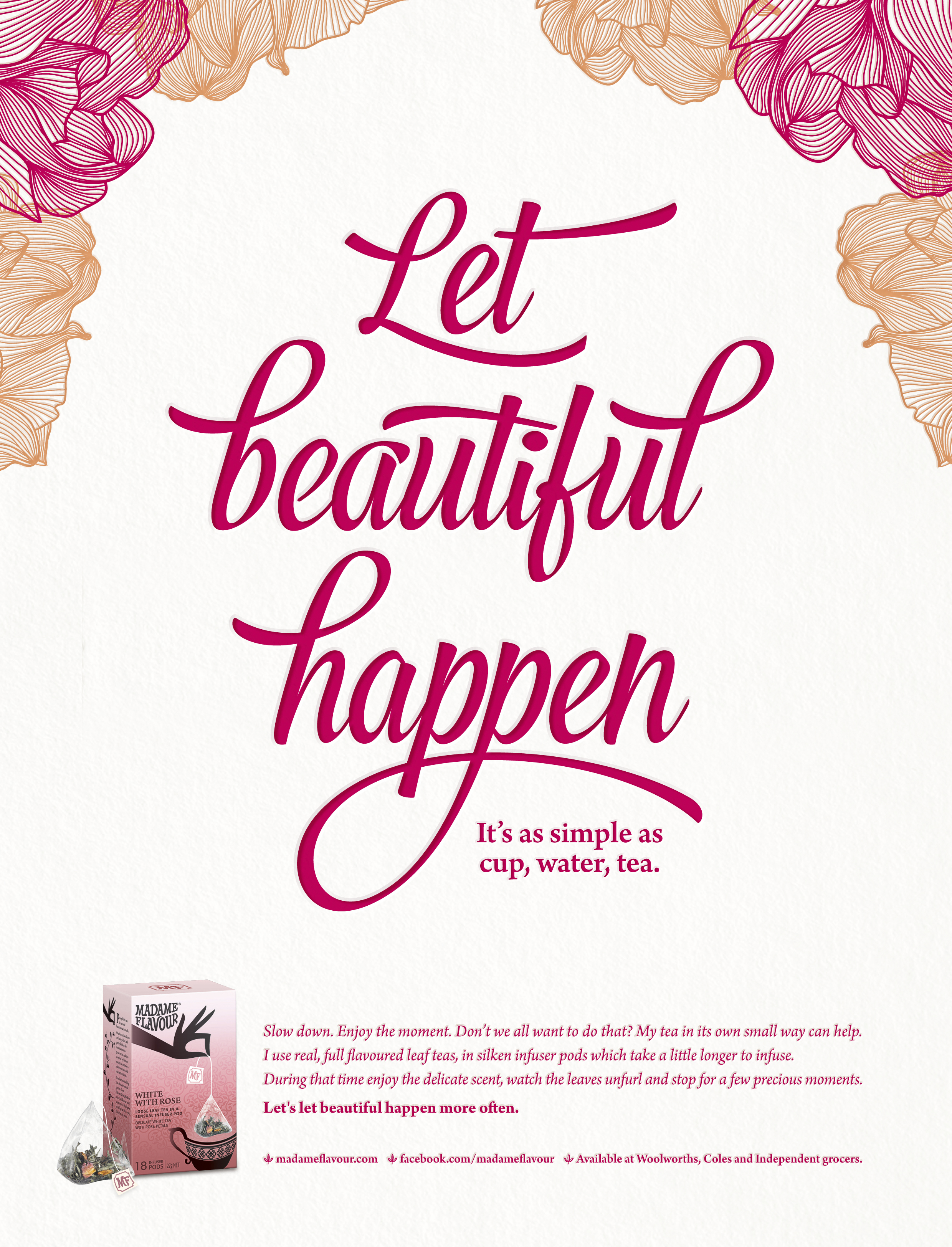 For Madame Flavour the the beautiful is the unfurling of the tea leaves and inhaling their scent - a beauty that needed to be captured in the advertising. A little gift of beauty and some time out to yourself