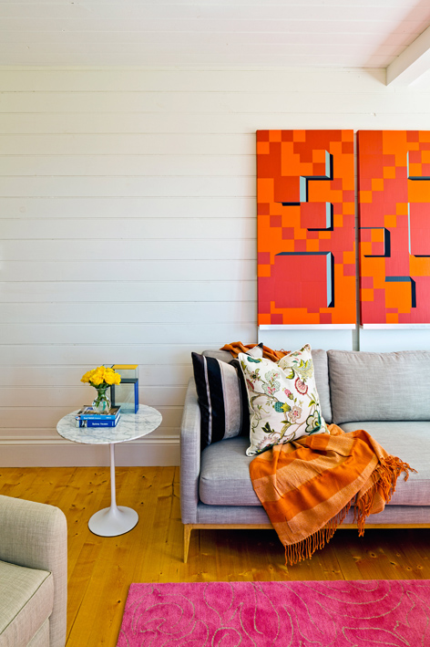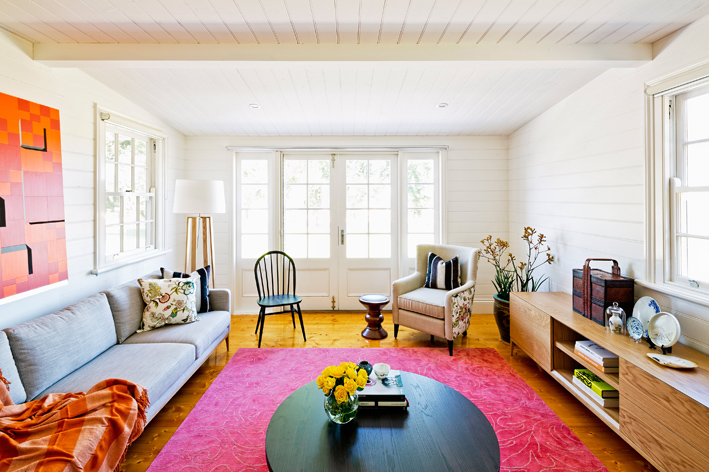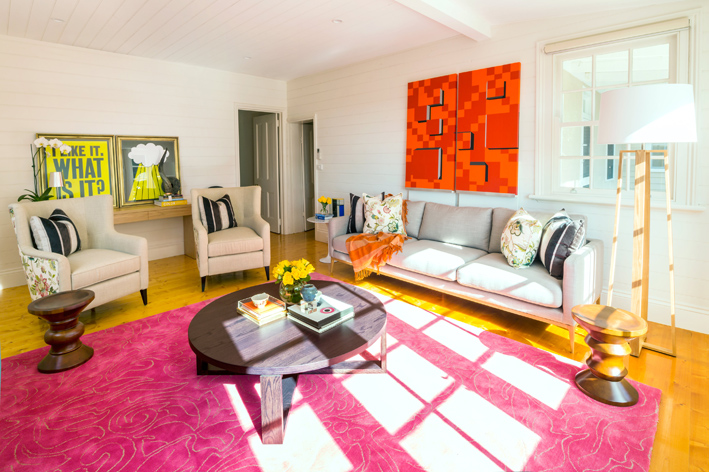 The large scale furniture and rug create the sense that the rooms are larger than their actual size and a modern perception of scale. The bold coloured rug emphasizes the overall white on white paint that was used in every room.