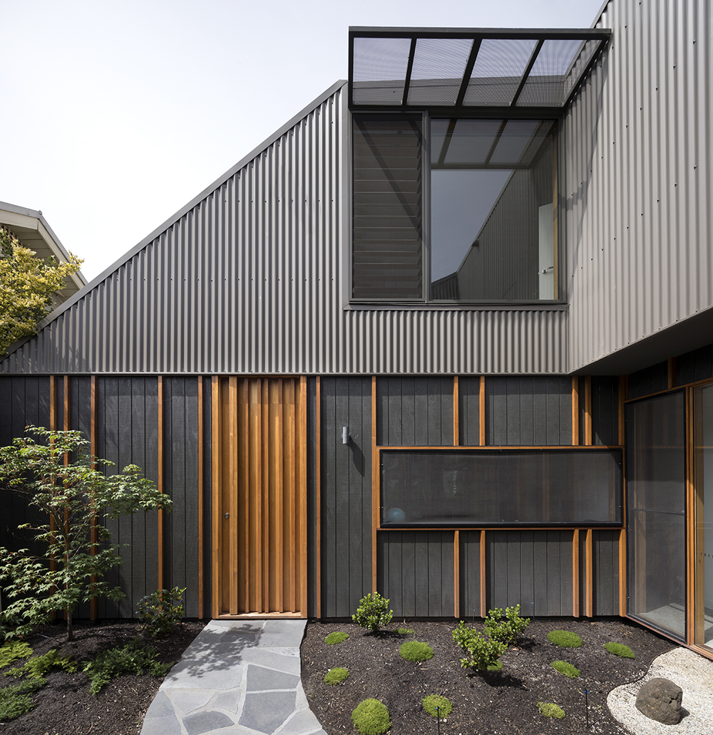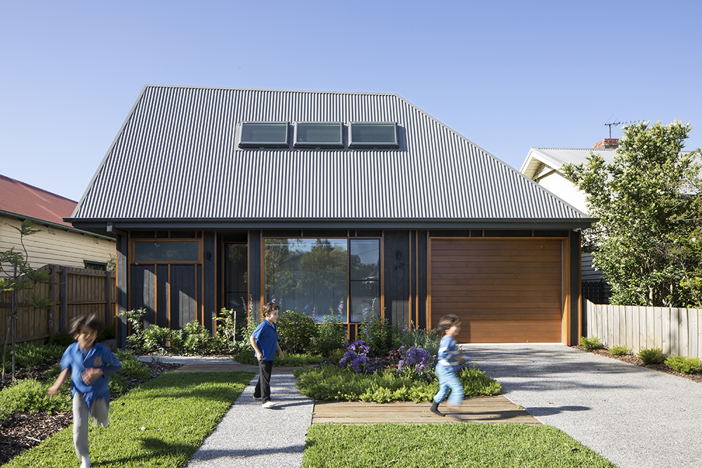 The project is firmly embedded in the scale, materiality and form of its context both in its overall expression and detailing. The building references and reinterprets the roof forms and lightweight cladding of adjoining properties. The pitched roof form is immediately recognisable as a distorted version of neighbouring roofs. Where adjacent properties employ cover strips to conceal cladding joints, the Thornbury house utilises hardwood battens that conceal joints in the cladding and add texture to the façade. The result is a house that is simultaneously referential and divergent from the prevailing street character.