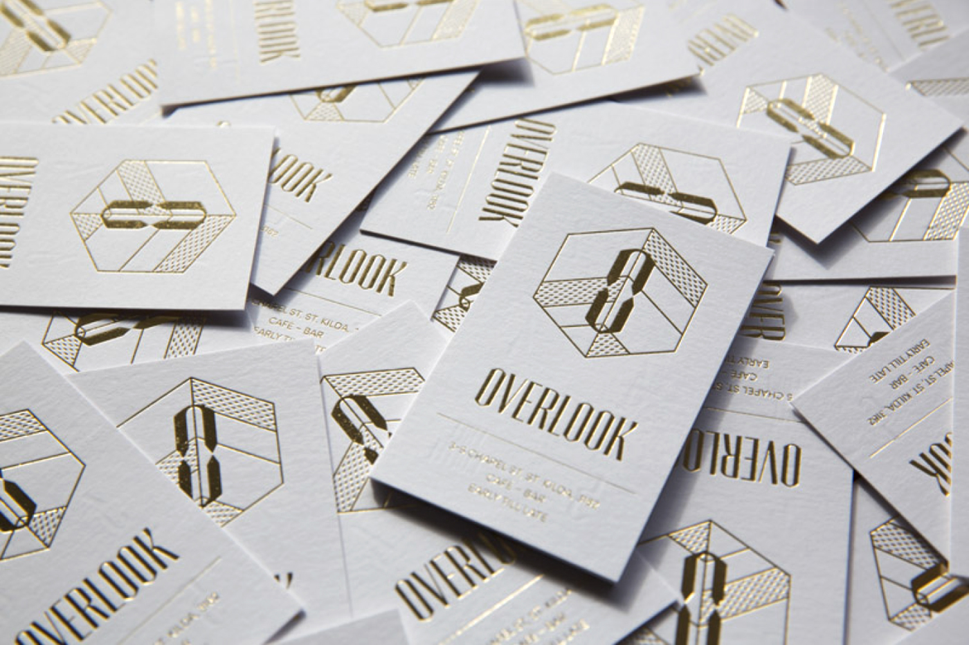 The brand was used across a myriad of touchpoints that can be viewed throughout the experience of dining at Overlook. Large gold signage elements donned the exterior windows which looked on to Chapel Street. Coffee loyalty cards were created with the addition of a themed, bespoke embossing stamp and menus were designed with textured paper and gold foiling to show the essence of opulence.