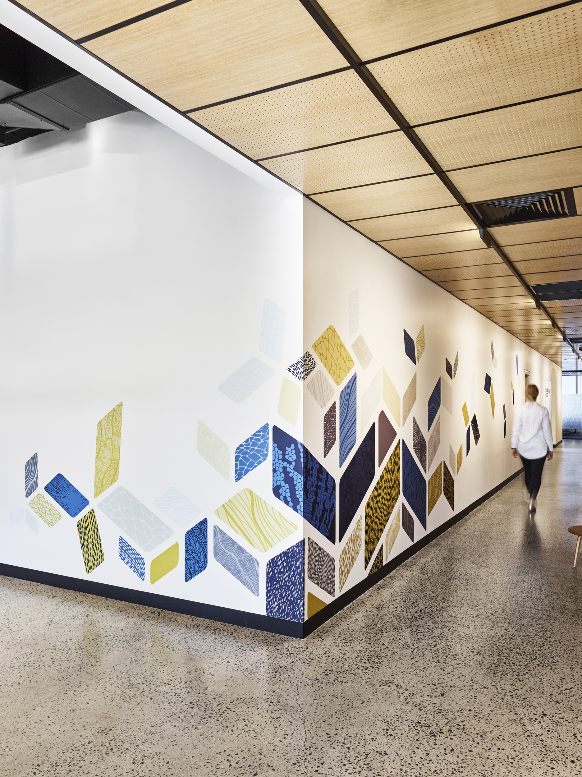 Corridors are enlivened with coloured geometric designs, that draw the eye, conceptually representing the growth and release of the transformation process. These corridors act as ‘streets’ referencing a regular university campus and connecting gathering areas to individual learning space destinations.