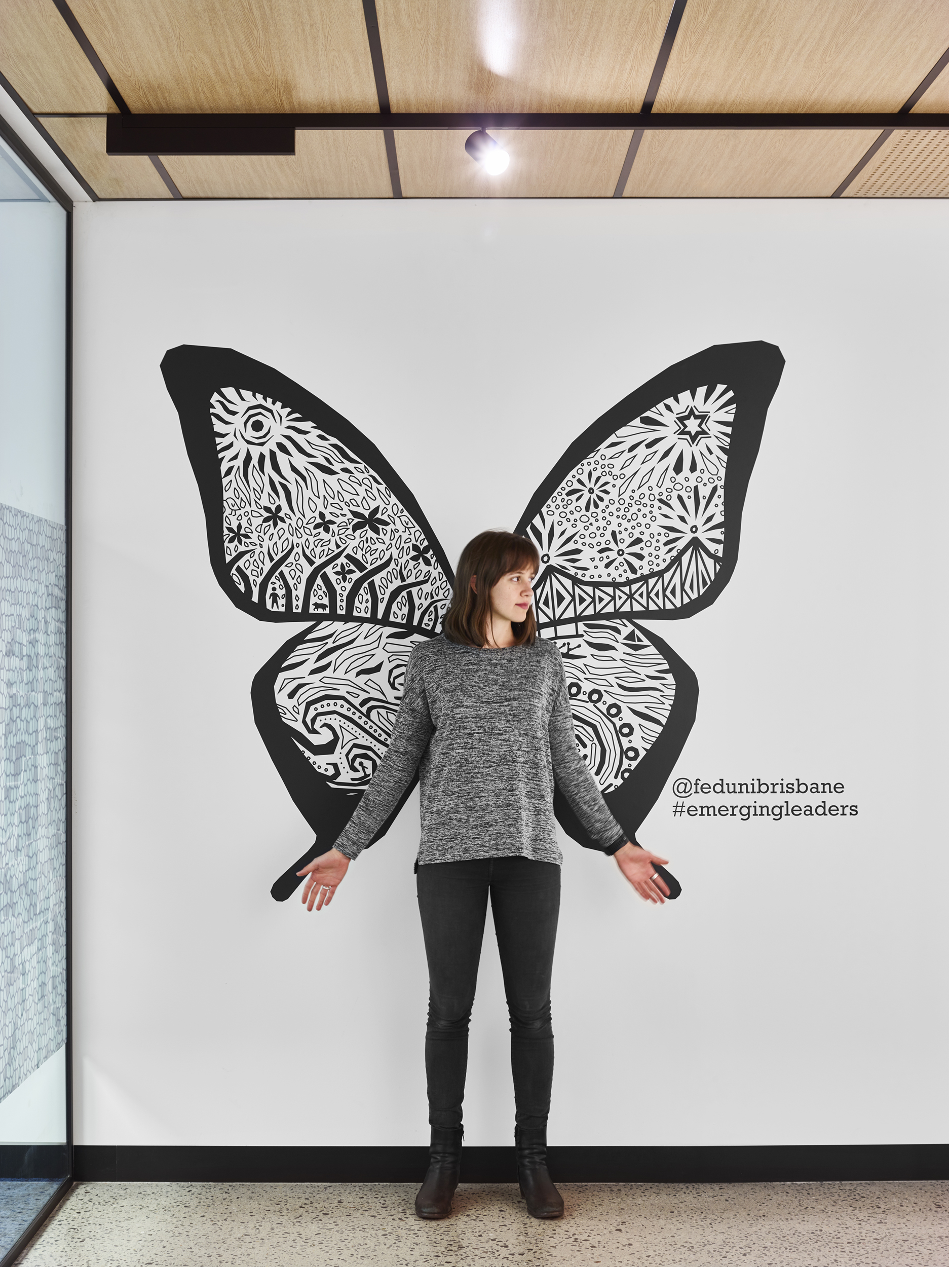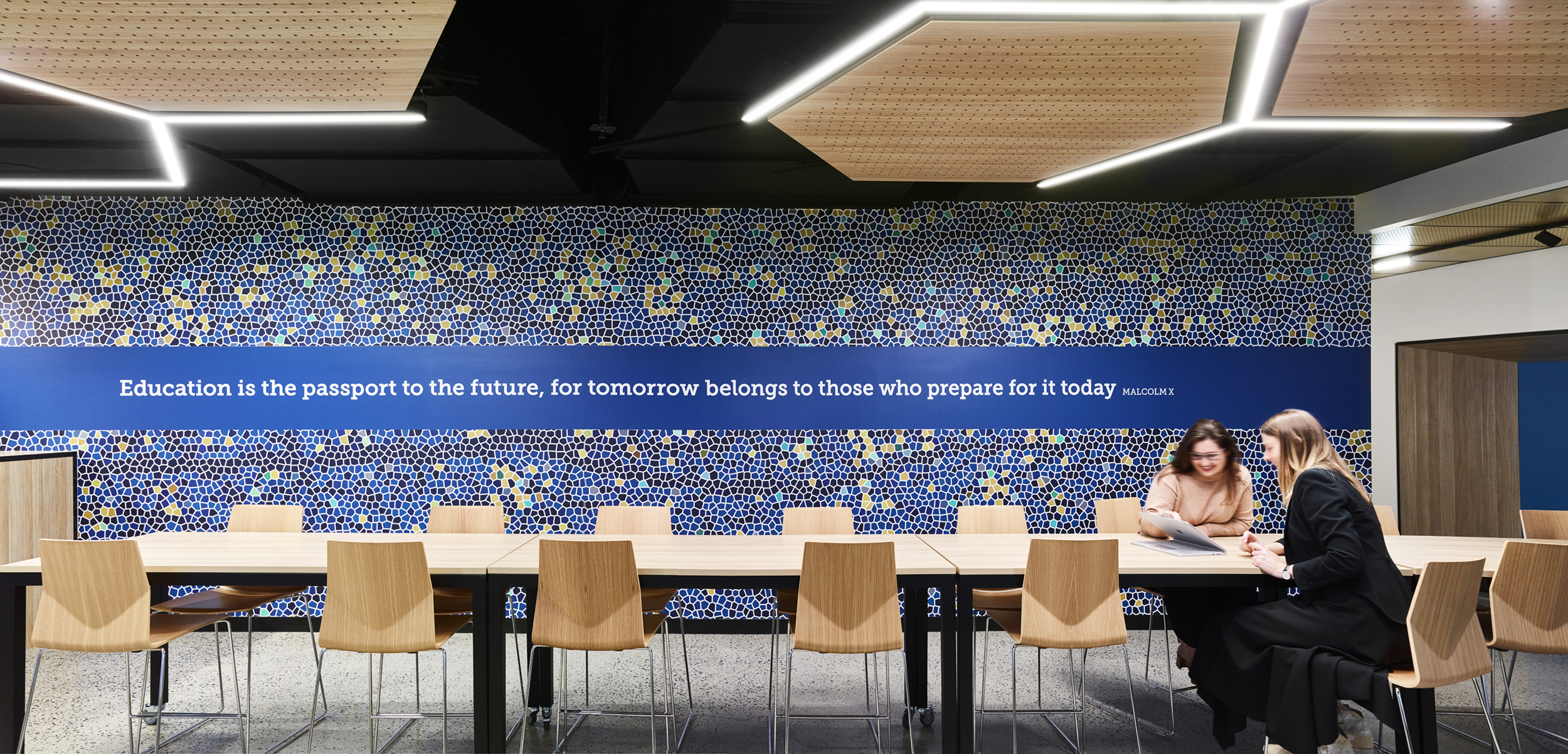 Identity and placemaking graphics were key elements in the design of Federation University’s new campus, spanning three floors of a Brisbane city office building. The aspirational, contemporary graphics compliment the interior fit-out and express the power of learning to transform lives, acknowledging the metamorphic nature where students emerge changed from their experience.
