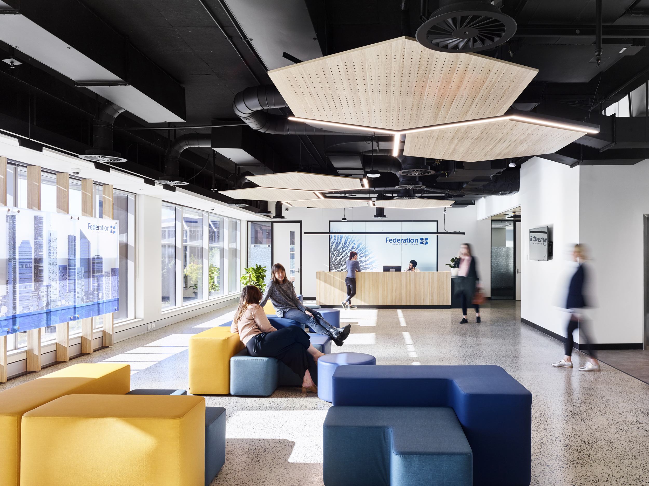From threshold graphics in the lift core, visitors alight into an open space with expansive views grounded by Federation University branded imagery paired with a stylised city skyline. This element doubling as a backdrop for formal photos and gatherings.