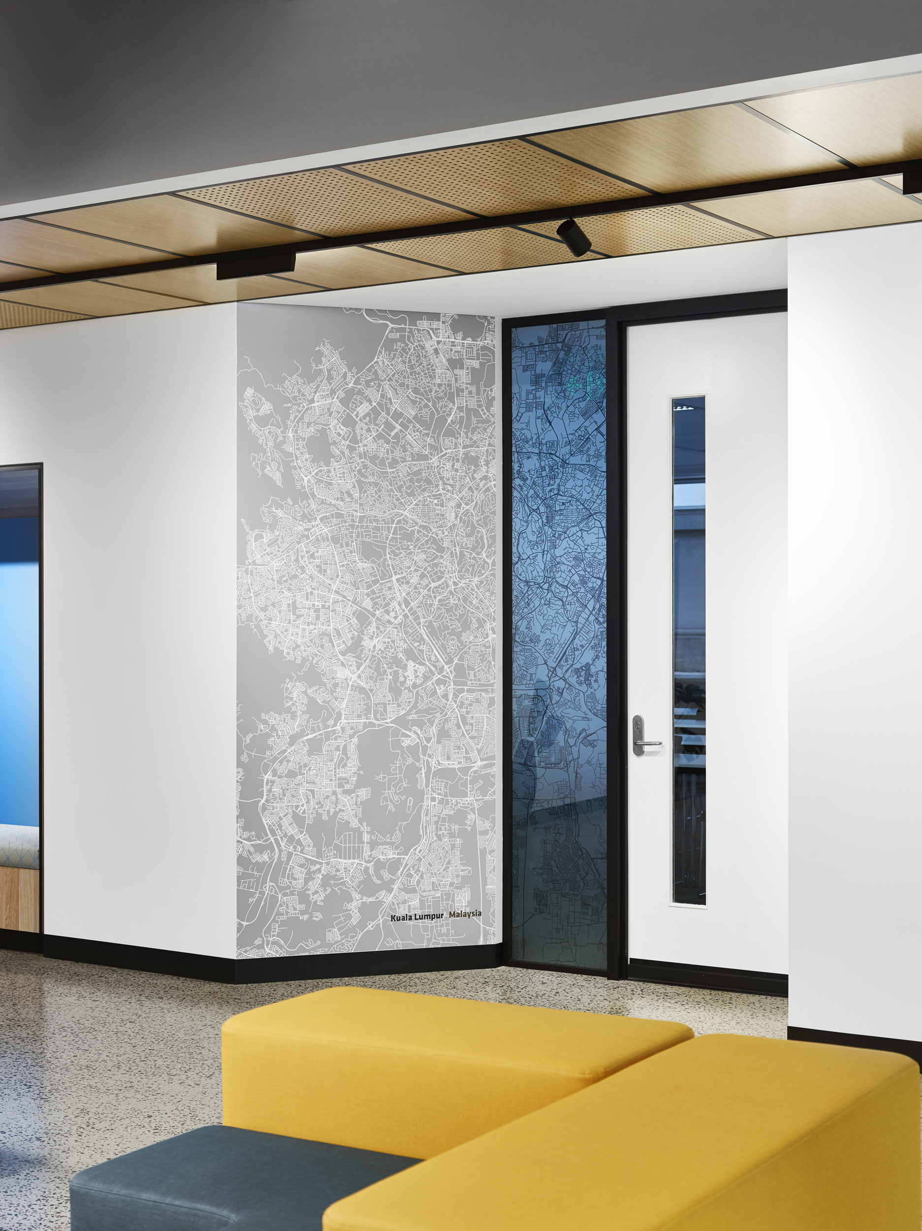 Learning spaces are signposted by mirrored street maps of cities, referencing butterfly wing patterns and recognising Brisbane as an international city bringing together students from diverse backgrounds.