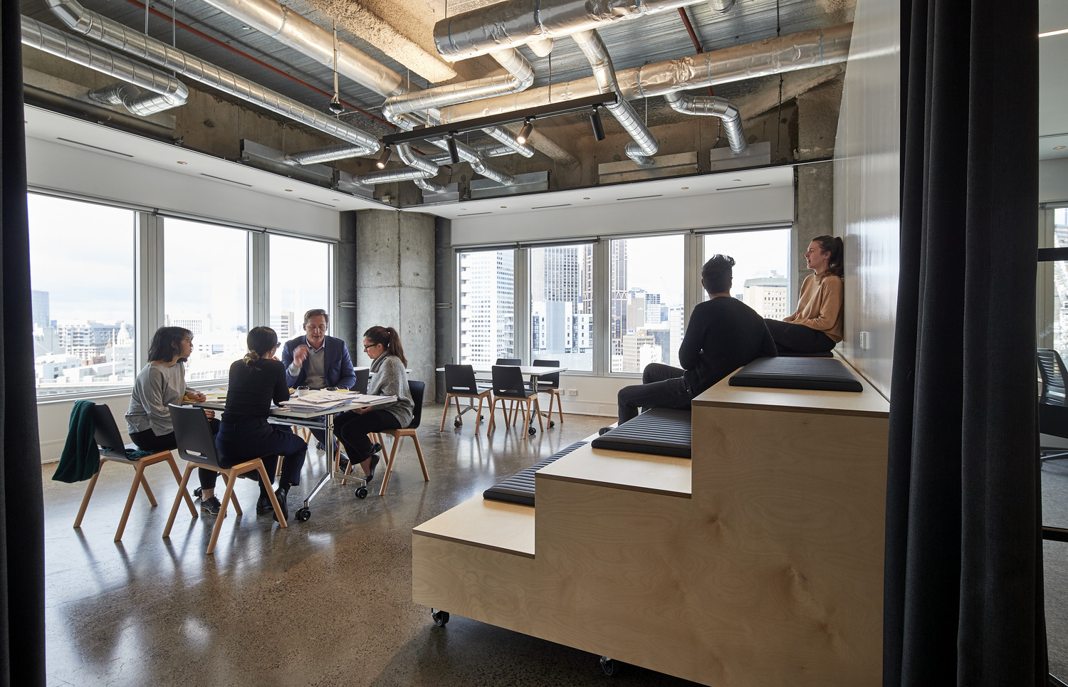- A large multifunctional room with moveable tiered seating providing a new typology of space available in the Space & Co. portfolio.
