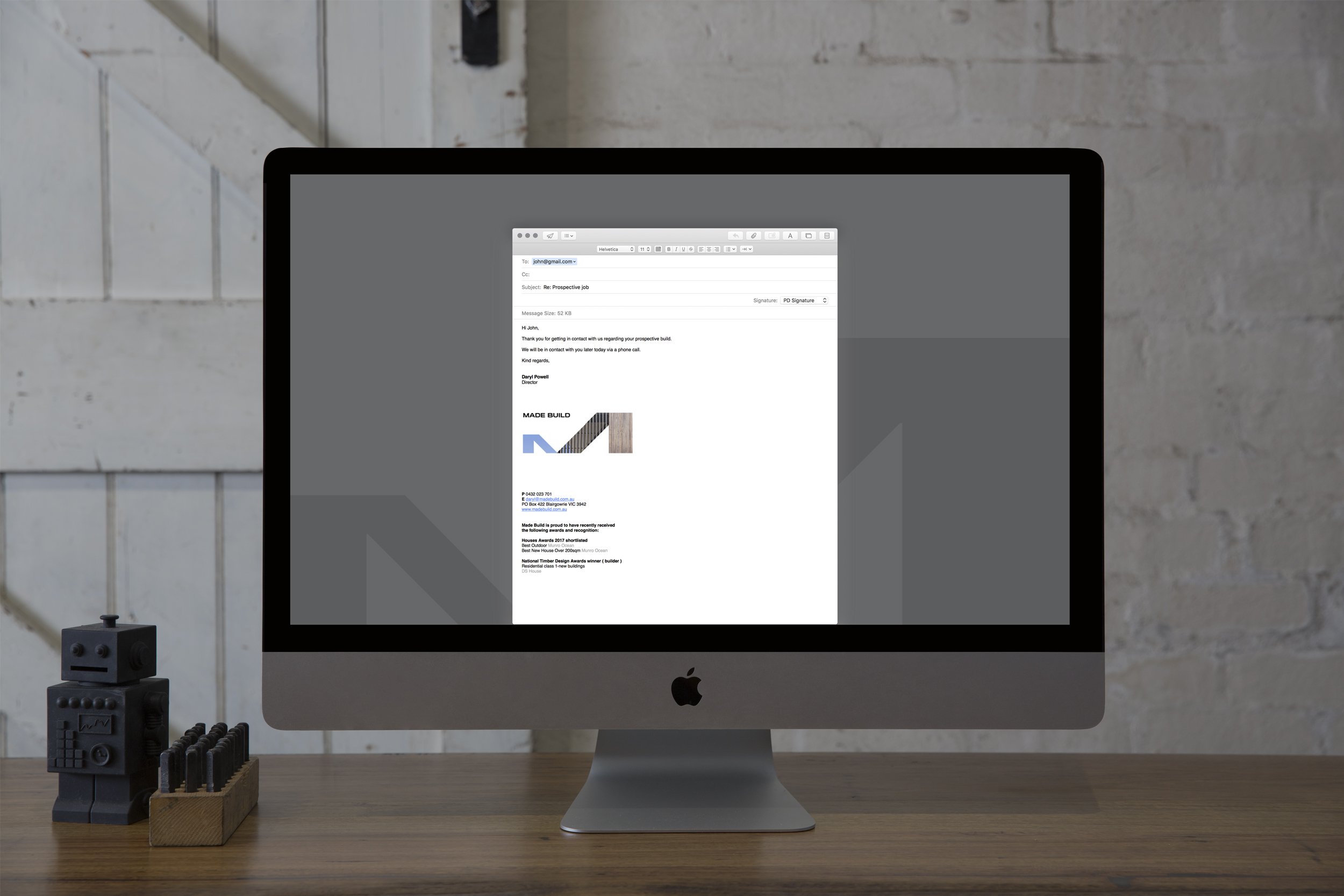 We were engaged by Daryl to assist him in a naming strategy and to create a comprehensive branding suite that perfectly represented his unique service offering which included identity design, digital design, uniforms and a stationery suite. Our strategic design solution for Made Build’s brand mimics the strong, bold and recognisable structures that underpin their physical constructions as well as their professional endeavours. The name and subsequent logo was inspired by the mastery of structure and building, creating a united framework evoking a sense of balance, purpose and integrity. These values were thoughtfully applied throughout the developed letterhead, notepad, business cards, website and signage in combination with a sleek and neutral colour palette of tonal greys, black and white. The digital design outcome showcases Made Build’s premium folio of work with a focus on crisp photography, clean functionality and refined typography, allowing Daryl’s incredible work to truly speak for itself.