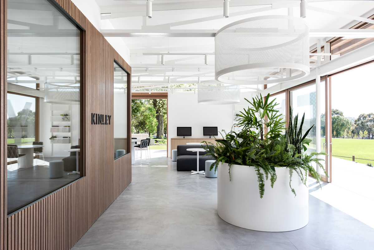 The Kinley Cricket Club project is the renewal of the existing Cricket Club located in the Cave Hill Limestone Quarry heritage listed site. The brief was to design a flexible space that would allow for different uses throughout its lifetime. The client required the space to function as a showroom for a period of time, with the future use to include a cricket club, coffee shop and community space to meet the needs of the developing neighbourhood. It was important to enhance the connectivity with the oval and to create gathering spaces both internally and externally. In doing this, the surrounding external landscaping to the cricket club was incorporated and became integral to the overall design. To the north-east of the building, there is a BBQ area and a croquet lawn to encourage activation and to provide a partially shaded area for gatherings. The building was designed to be opened up towards the oval and connect with its immediate surroundings to create an inviting environment internally and externally for the use of the whole community.