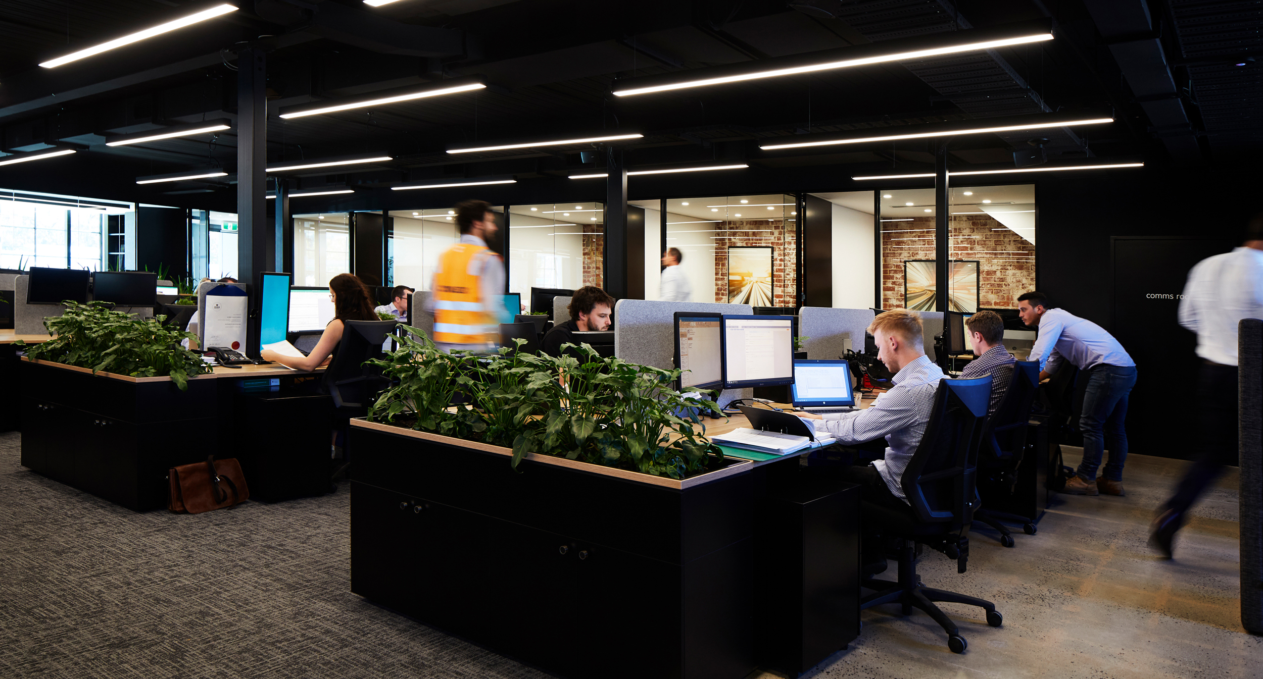 The columns that remained were utilised as points where soft-wiring connected to banks of workstations. The columns were painted black to appear complete as part of the workstation system.