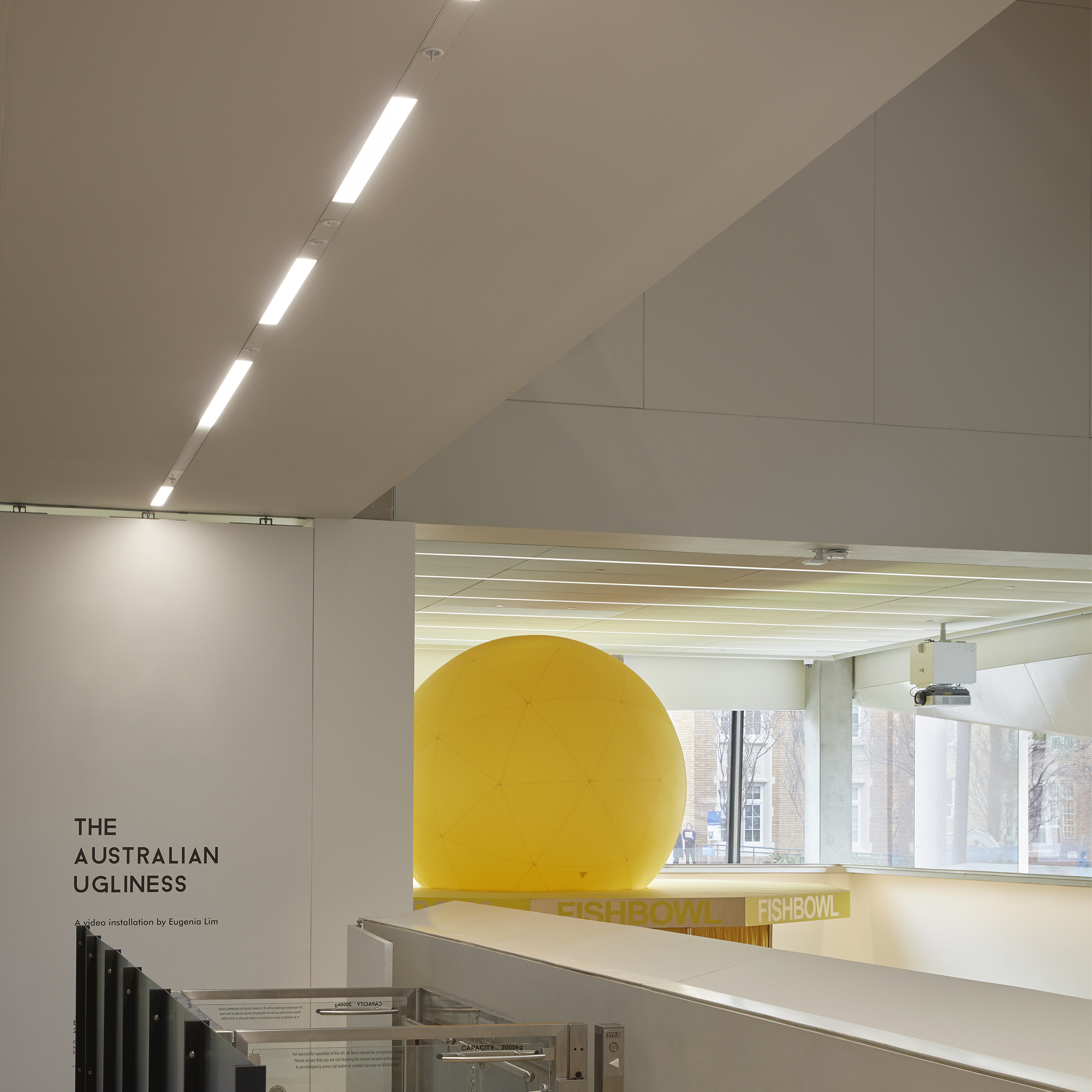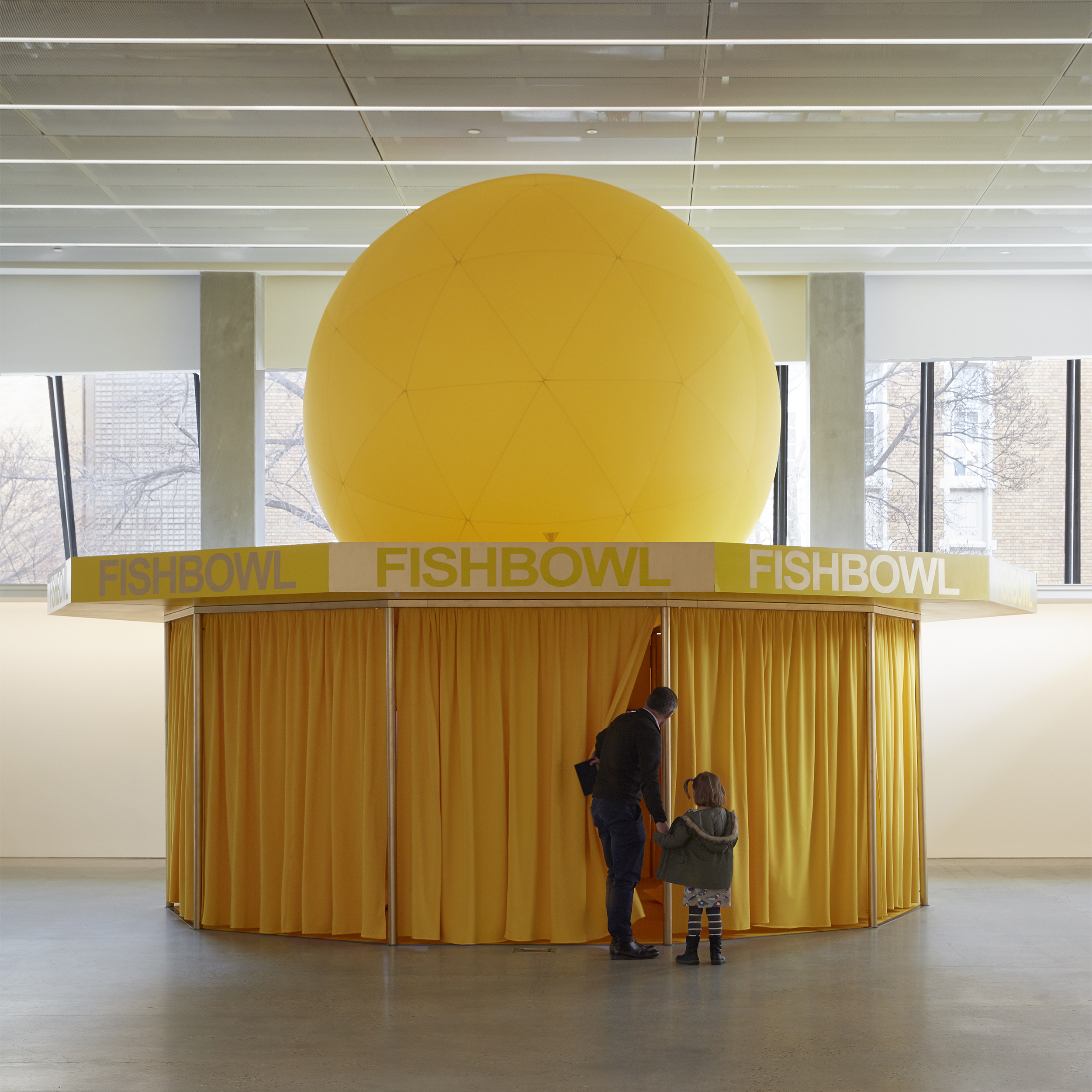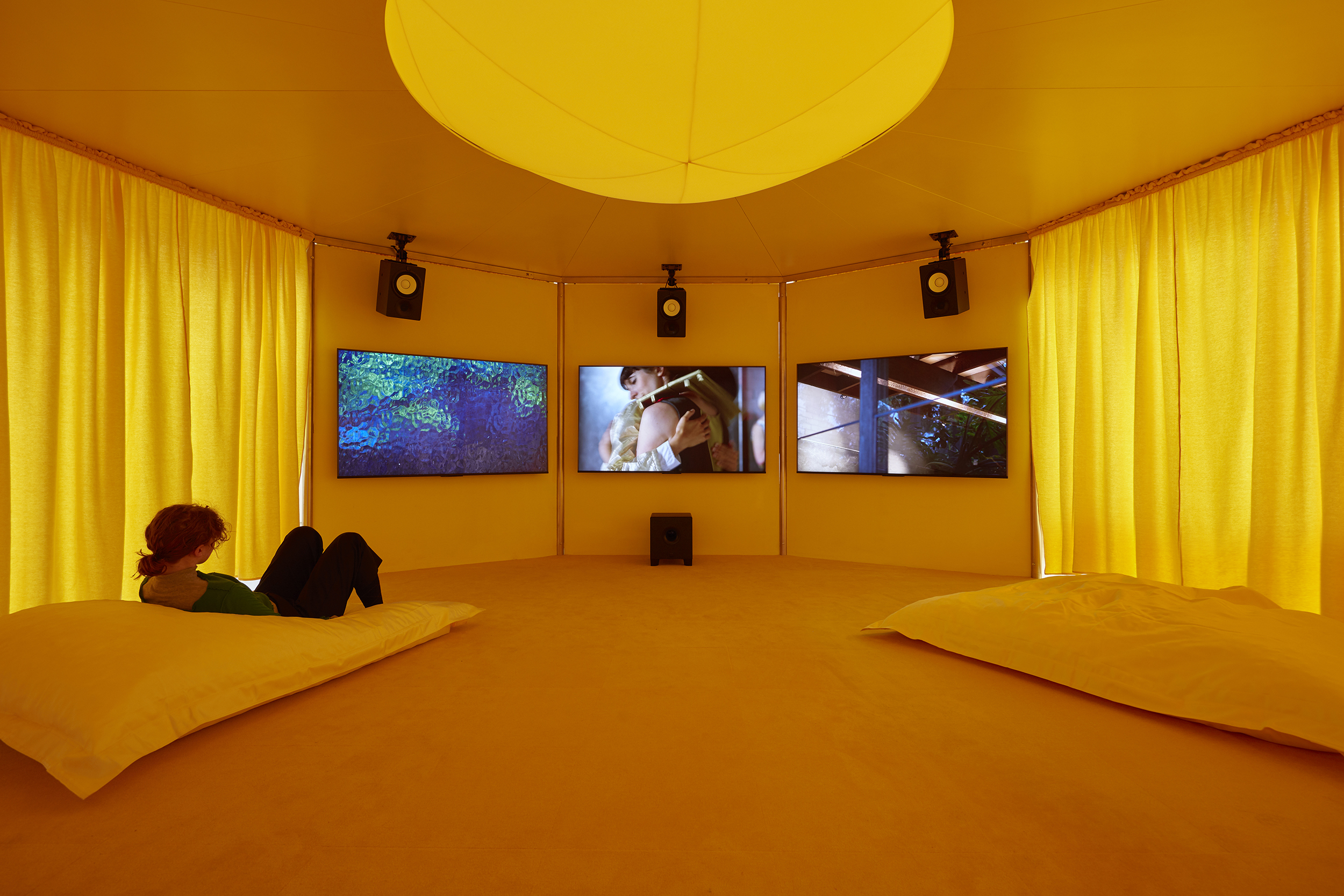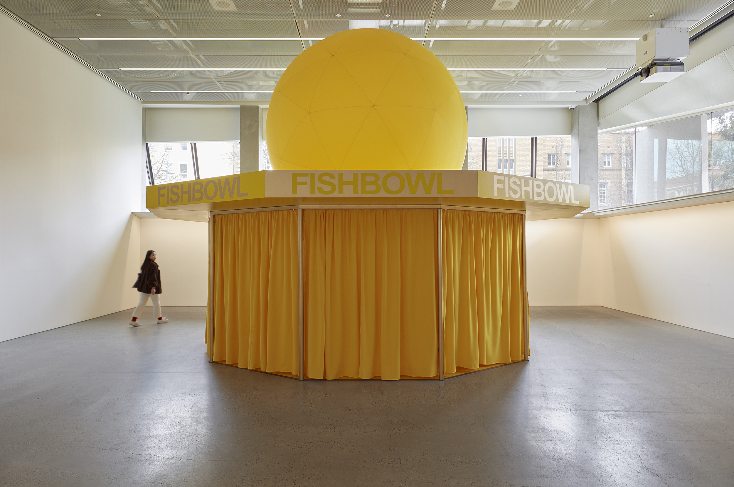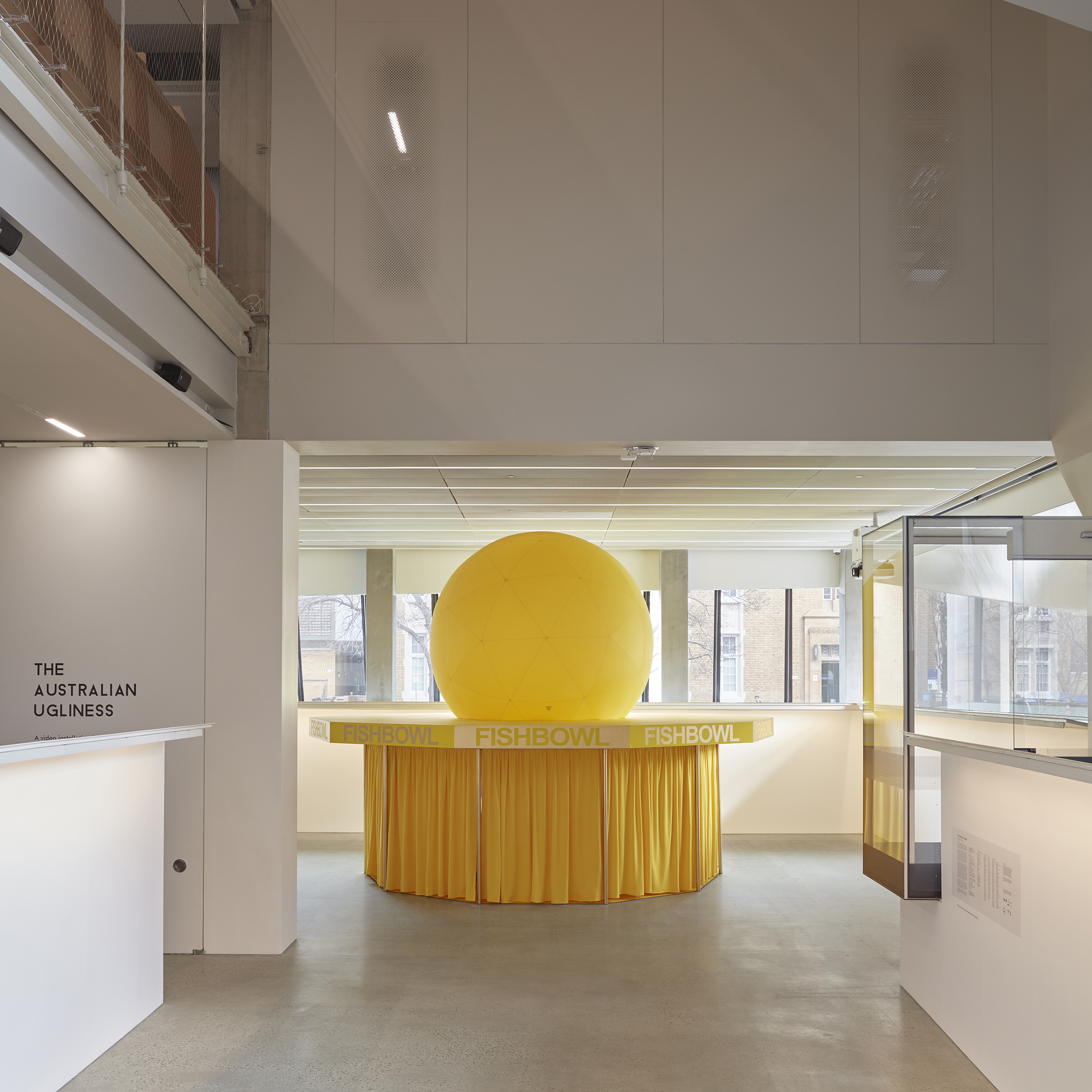 The Fishbowl is an installation designed to house Australian Artist Eugenia Lim’s major new work ‘The Australian Ugliness’ (TAU). TAU is a multi-channel video installation exploring contemporary Australian identity through its Architecture. In dialogue with architect Robin Boyd’s 1960 book of the same name, TAU considers architecture’s role in shaping culture and cultural diversity. The installation consists of a striking yellow silhouette with a soft curtain clad interior catering for intimate screenings of 10 to 20 people that can also be ‘opened up’ to allow larger audiences to gather to view the work.