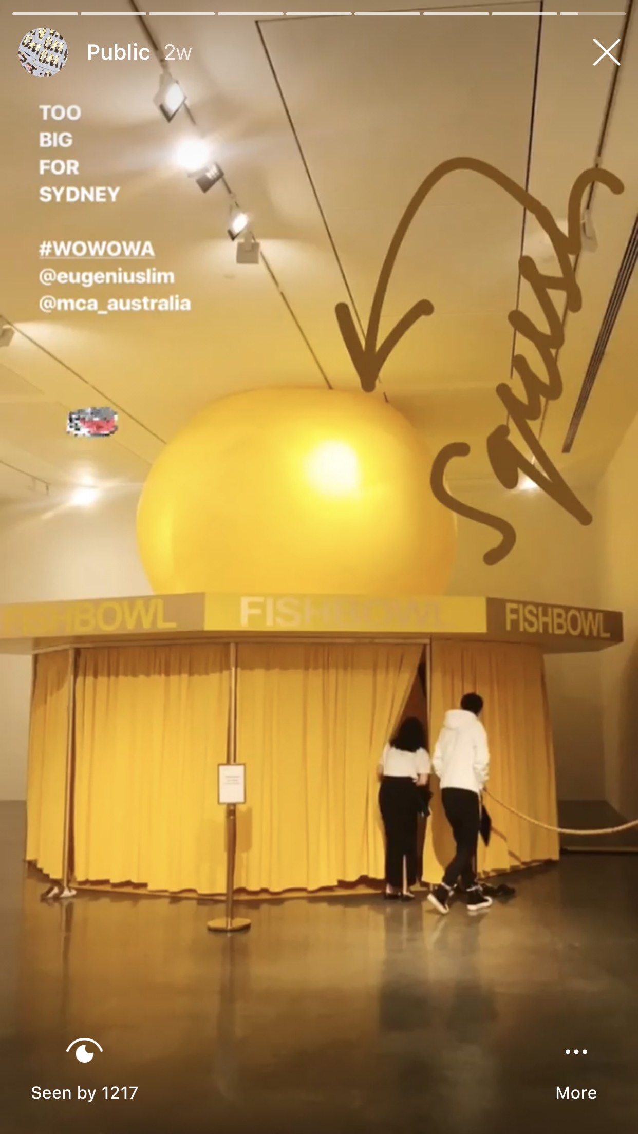 The Instagram story with the captain “too big for Sydney” refers to the inflated sphere squished up against the ceiling of the MCA Gallery. The challenge of exhibiting in multiple locations is the varying dimensions of each space. A design choice was to retain the proportions of the original Fishbowl but utilising an inflatable sphere meant the structure could be literally ‘squished’ to fit smaller spaces rather than compromising the original design.