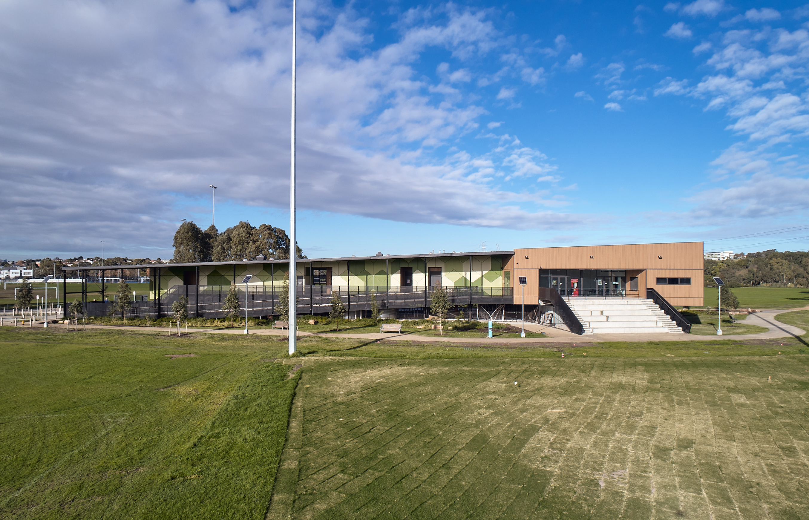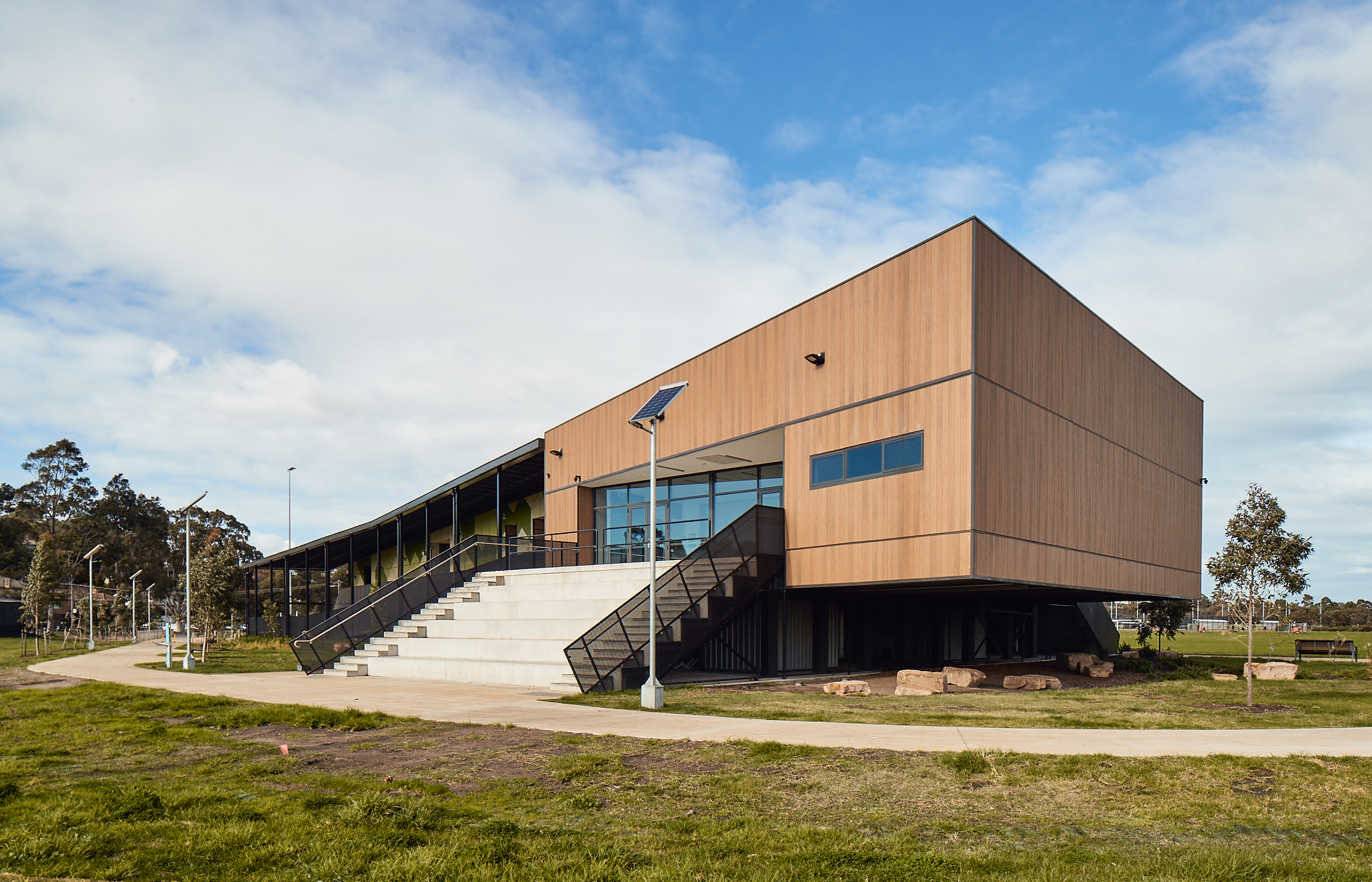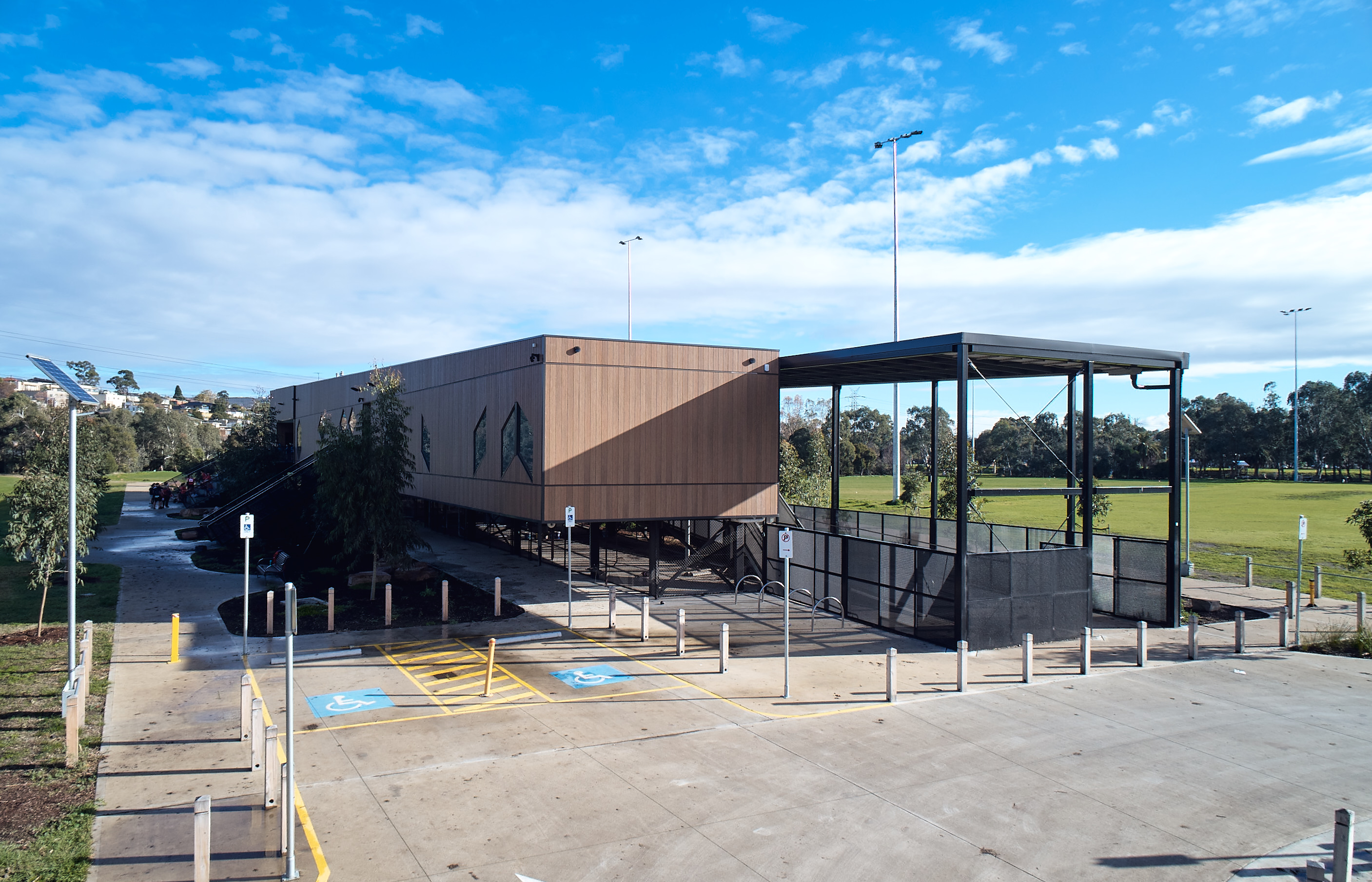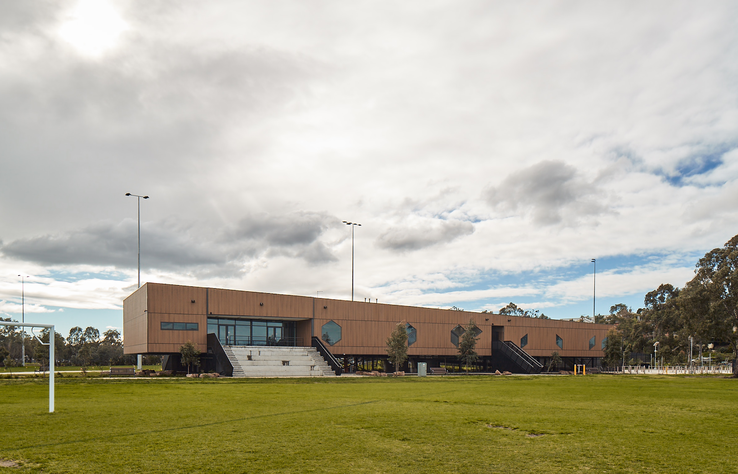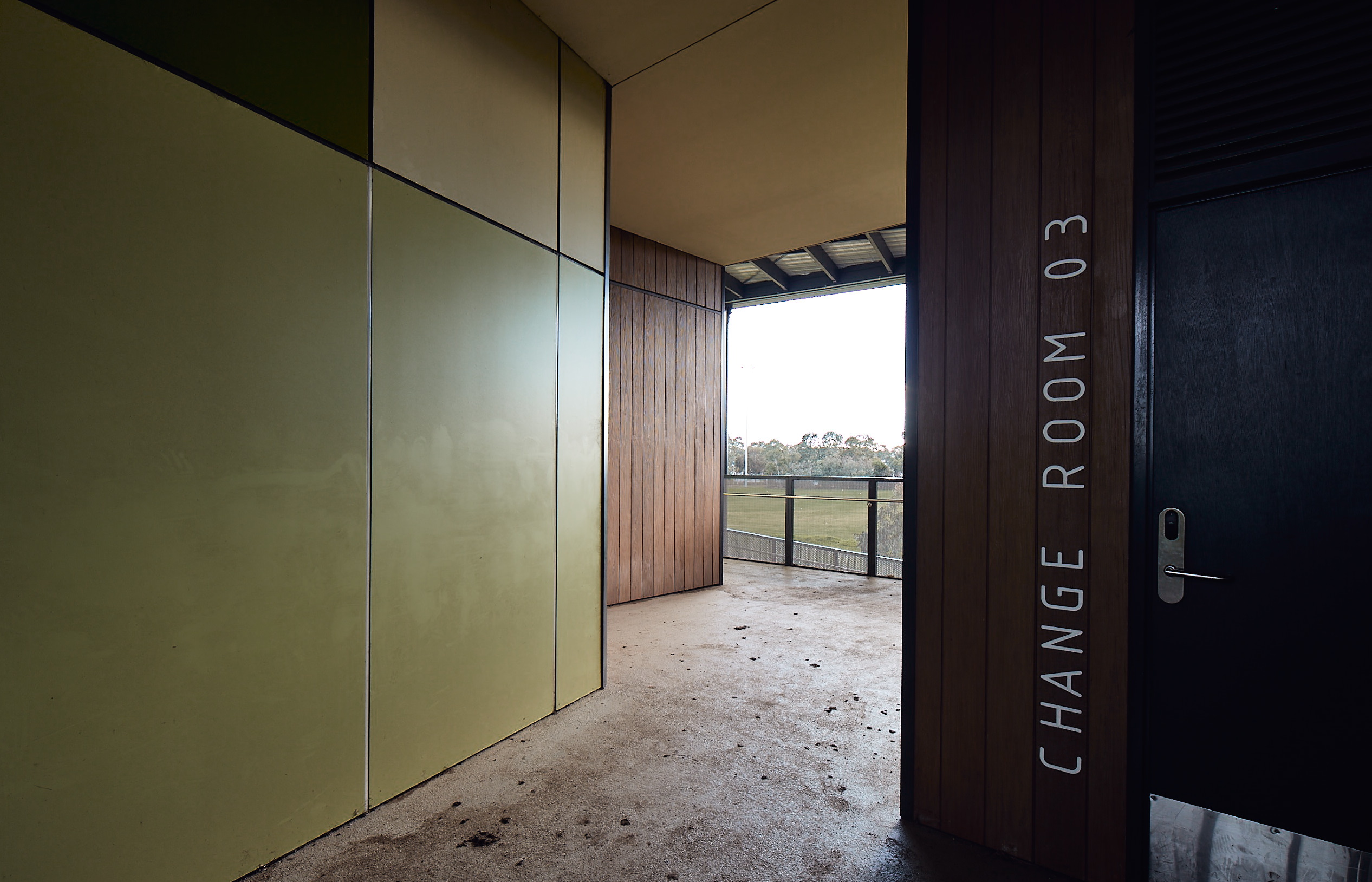 The need to service the adjacent sporting fields required a centralized approach to design and removed the need for a formal front and back or single entry to the building. As a result, the building’s lack of a formal entrance is replaced by a sleek, linear form with a dramatic series of steps cascading either side of the social space. At one end, a ramp leads directly to the first floor social space. Enclosed in a timber screen, the ramp ensures the development is fully accessible to all and replaces the need for a lift. The linear ramp allows access to a timber clad form that hovers above ground and contains change rooms, amenities and storerooms.