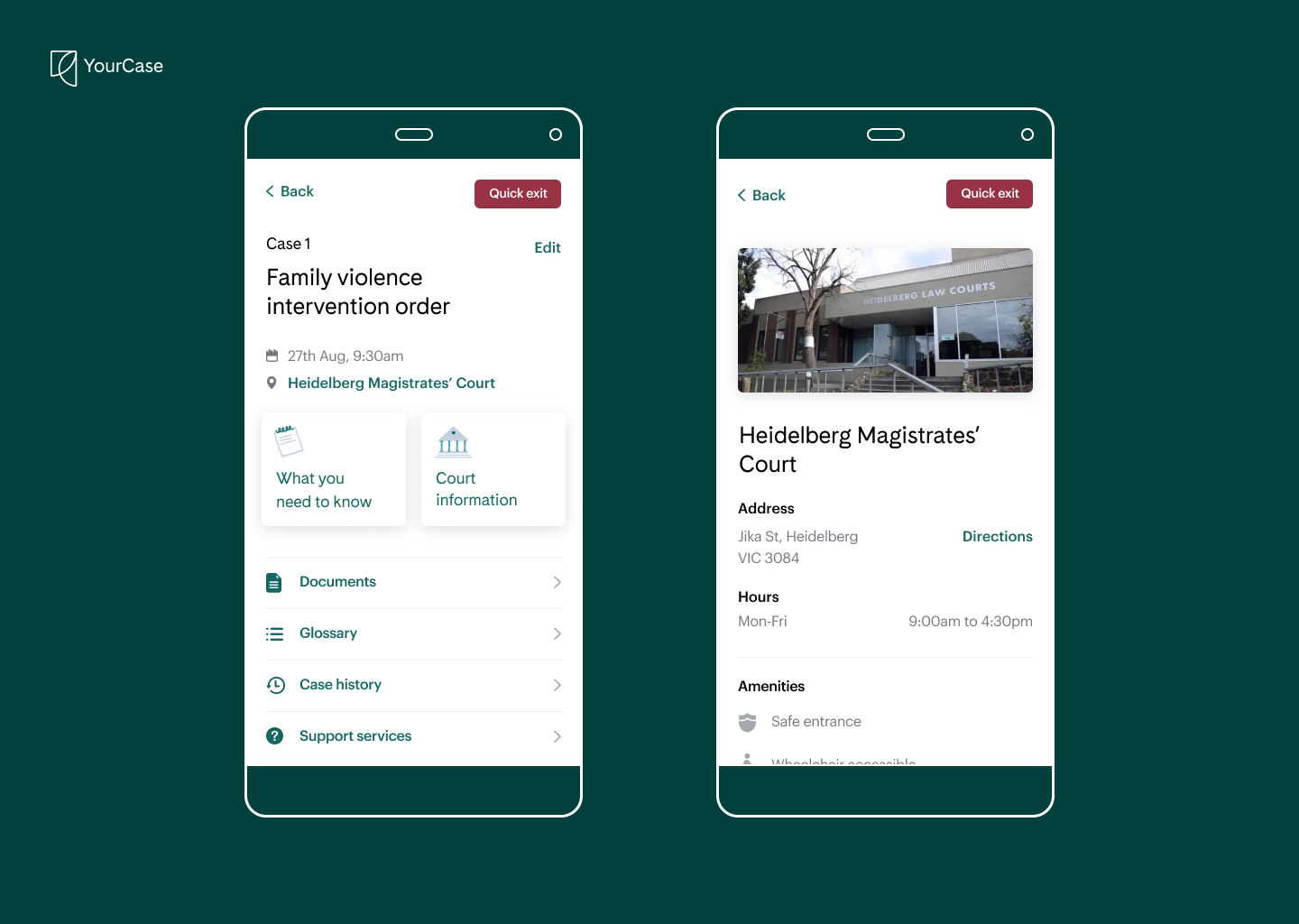 By co-designing the solution with users themselves, testing prototypes and rapidly refining them we were able to ensure that the final result provides users with the best possible experience and meets their needs. YourCase is intended to be a ‘pocket guide’ to for victim-survivors of family violence providing users with a helpful step by step guide and support for attending court.