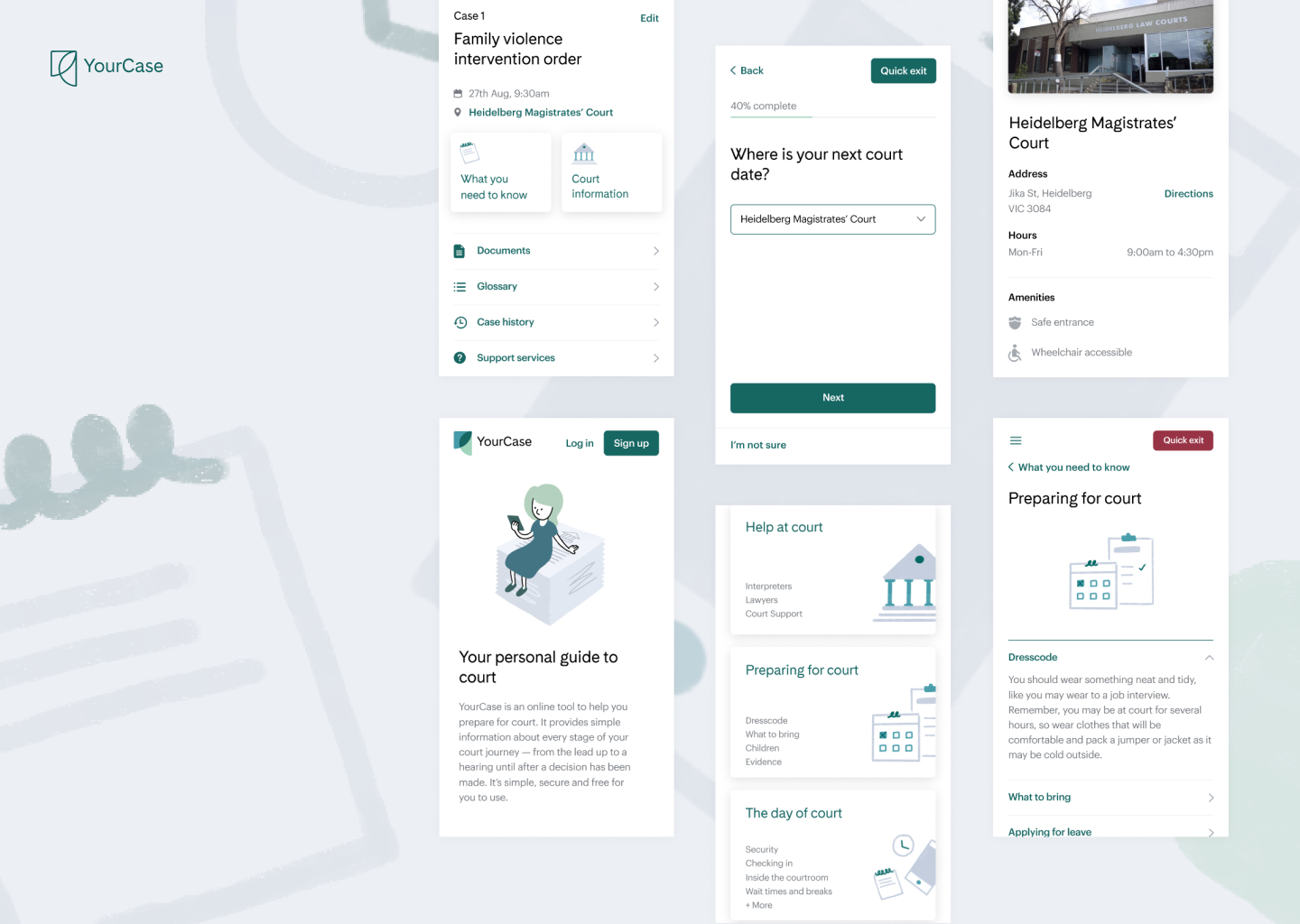 We self-initiated the project by coming up with the original idea and then we sourced and found our own clients and project supporters. YourCases development featured partners that include Victoria Police, the Department of Premier and Cabinet's Public Sector Innovation Fund, Berry Street, Family Safety Victoria, the Sir Zelman Cowen Centre, and the Federal Department of Social Services. His Honour Peter Lauritsen, Chief Magistrate of Victoria, also lent his support to our exploration to improve court events around family violence intervention order cases. The Victim Survivors' Advisory Council was also engaged as a partner to provide the voice of victim-survivors throughout the design process, including Nicole Lee who is featured in the case study video for YourCase (https://youtu.be/ZrFqlGZsNYI). Experience YourCase for yourself here: https://www.yourcase.com.au/ Read more about the project here: https://www.portable.com.au/work/yourcase