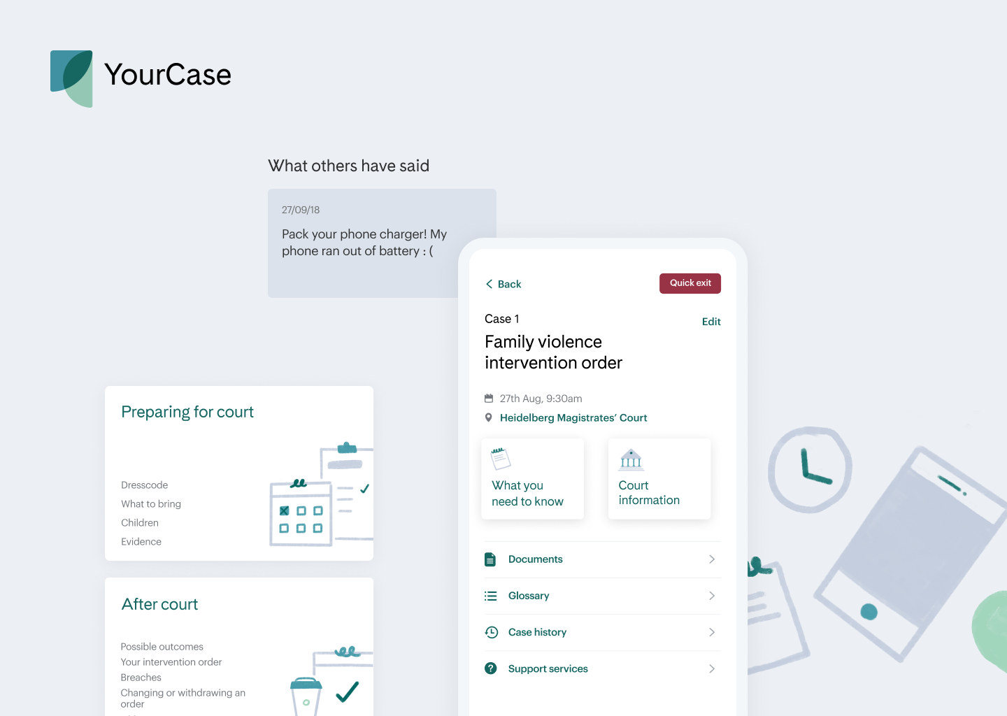 Victim-survivors of family violence are some of the most vulnerable users of our court systems. We wanted to improve their experience of the court system. We co-designed, developed and launched YourCase in February 2020 (https://yourcase.com.au/). YourCase is a digital tool that helps to create a better experience for victim-survivors who are attending court whilst they are going through the process of applying for a family violence intervention order.