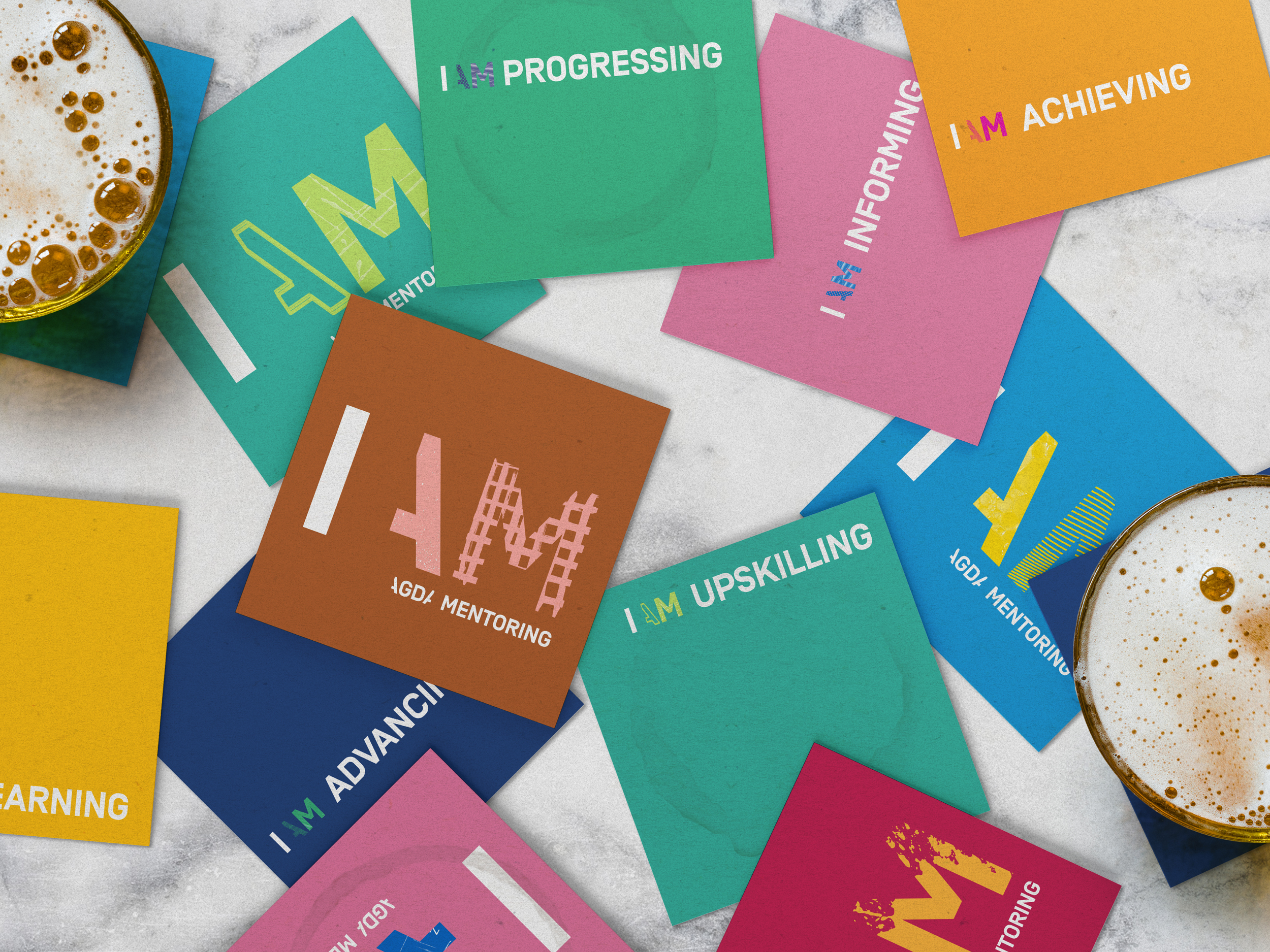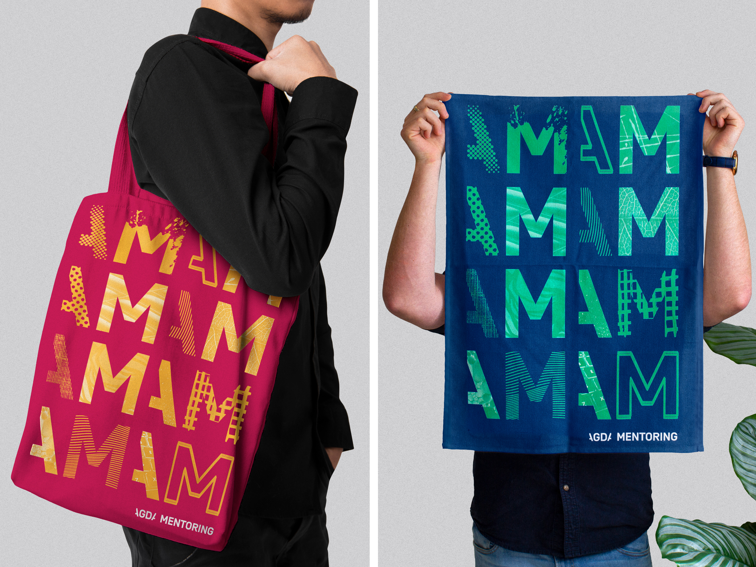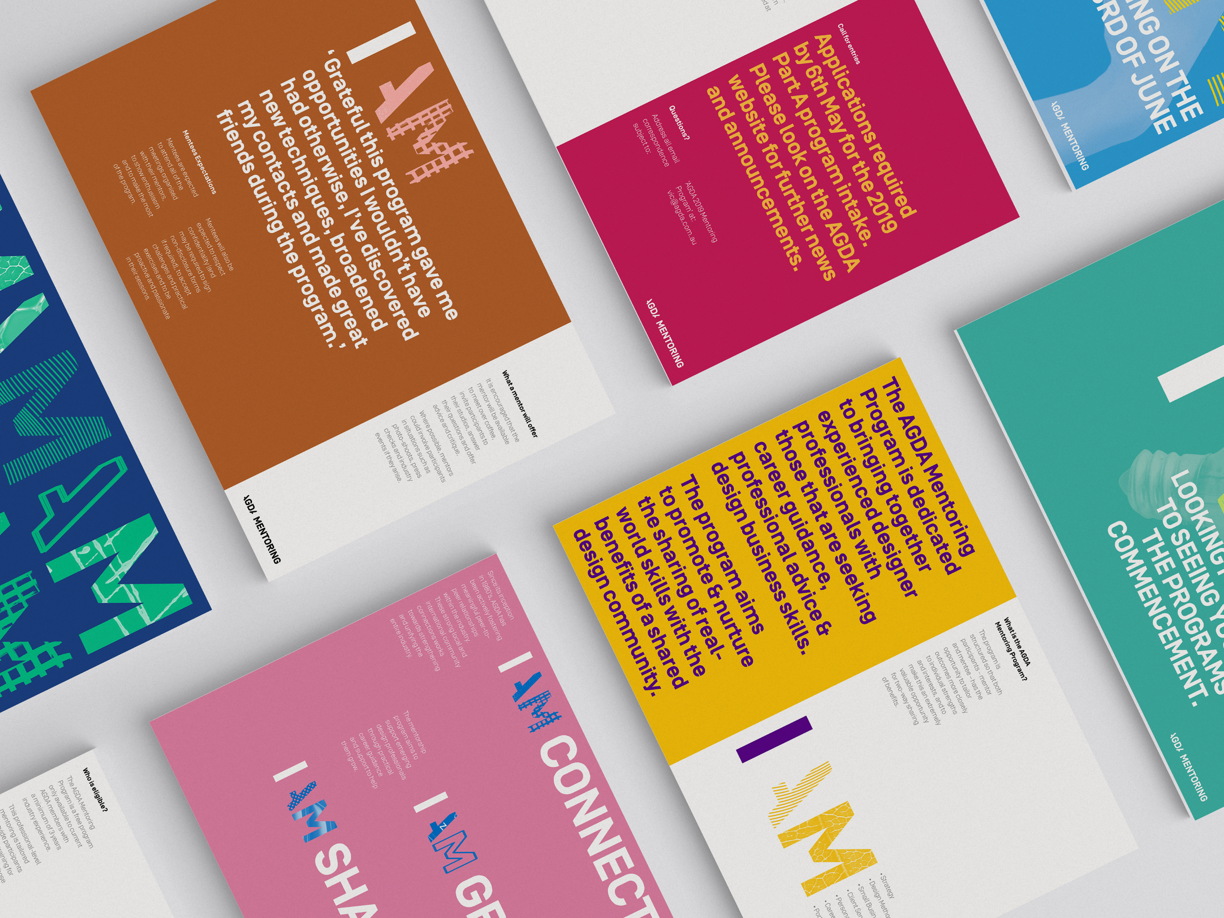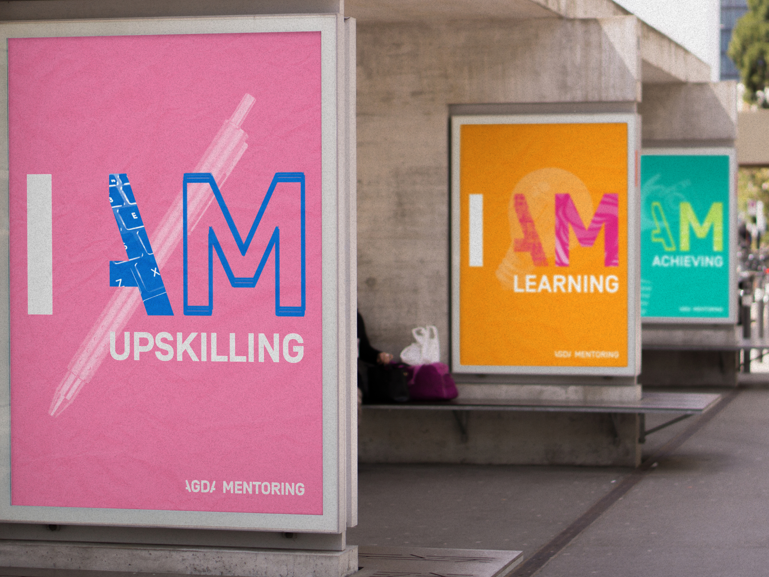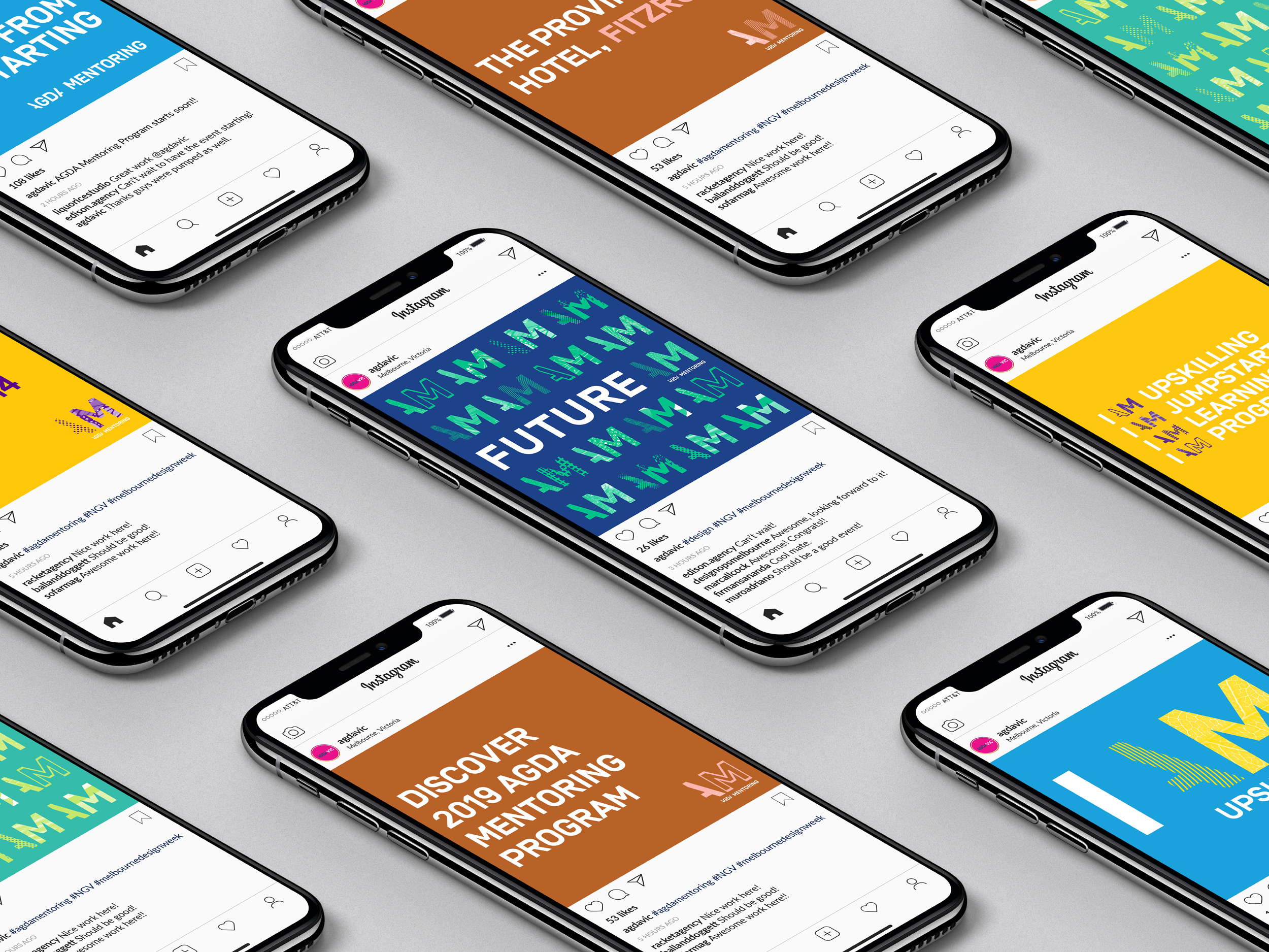 The idea for the new identity system is centralised around using the distinctive asset of AGDA’s iconic ‘A’ and connecting it with the ‘M’ for mentoring to creates a word-mark acronym ‘AM’ -a visually succinct message of self-empowerment. The new design system allows for flexibility in its application – appealing to a broader audience of both potential mentor’s and mentee’s. The “I AM” acronym creates an opportunity for language that directly speaks to the program benefits and has unique visual distinction through its aesthetic simplicity: