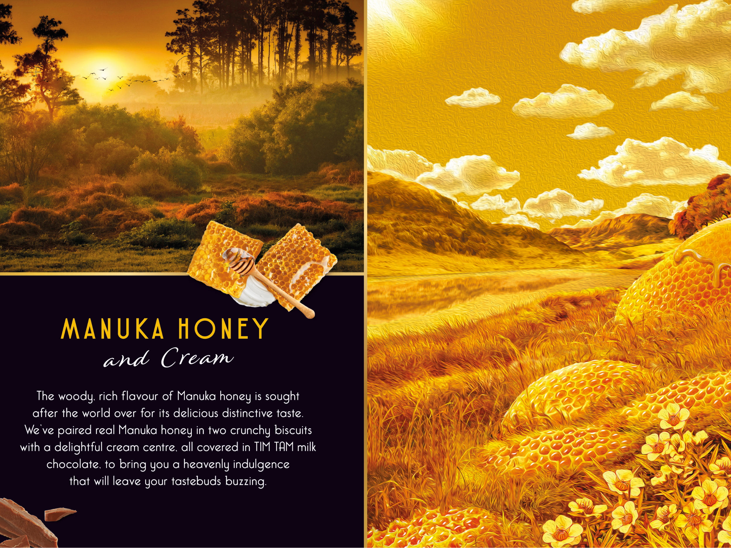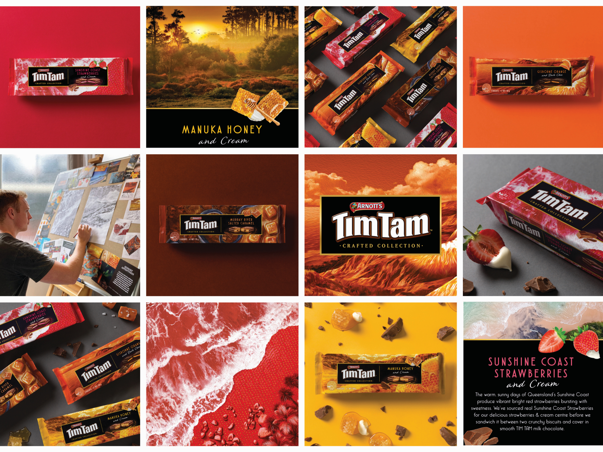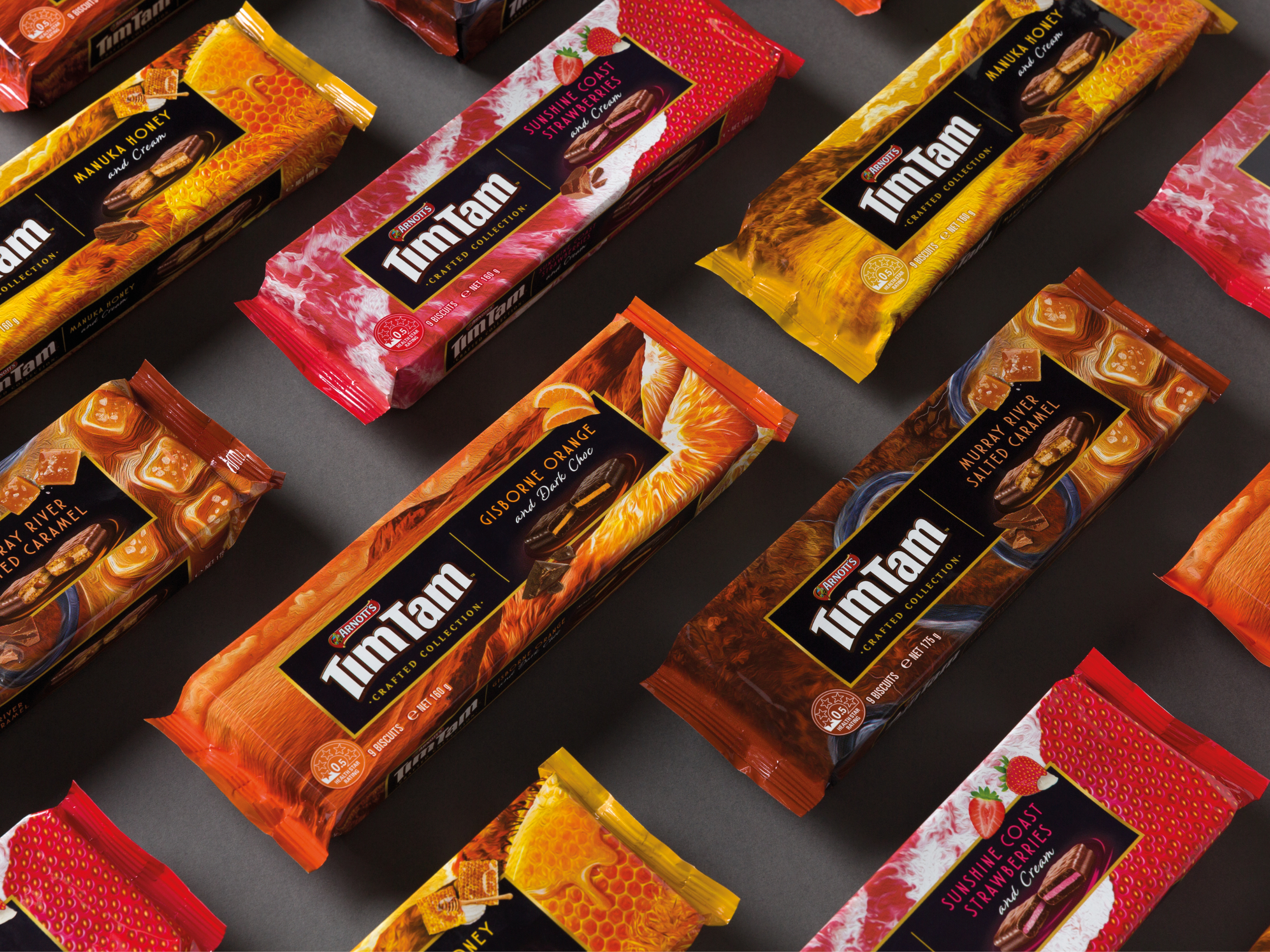 Designed to create an un-missable impact on shelf and a sense of escapism - the Tim Tam CRAFTED COLLECTION fuses regional realism with artistic impressionism to create a range unlike any of its past. The design system showcases the region and ingredients without overshadowing with traditional on-pack clutter - keeping it simple and letting the flavour do all the work.