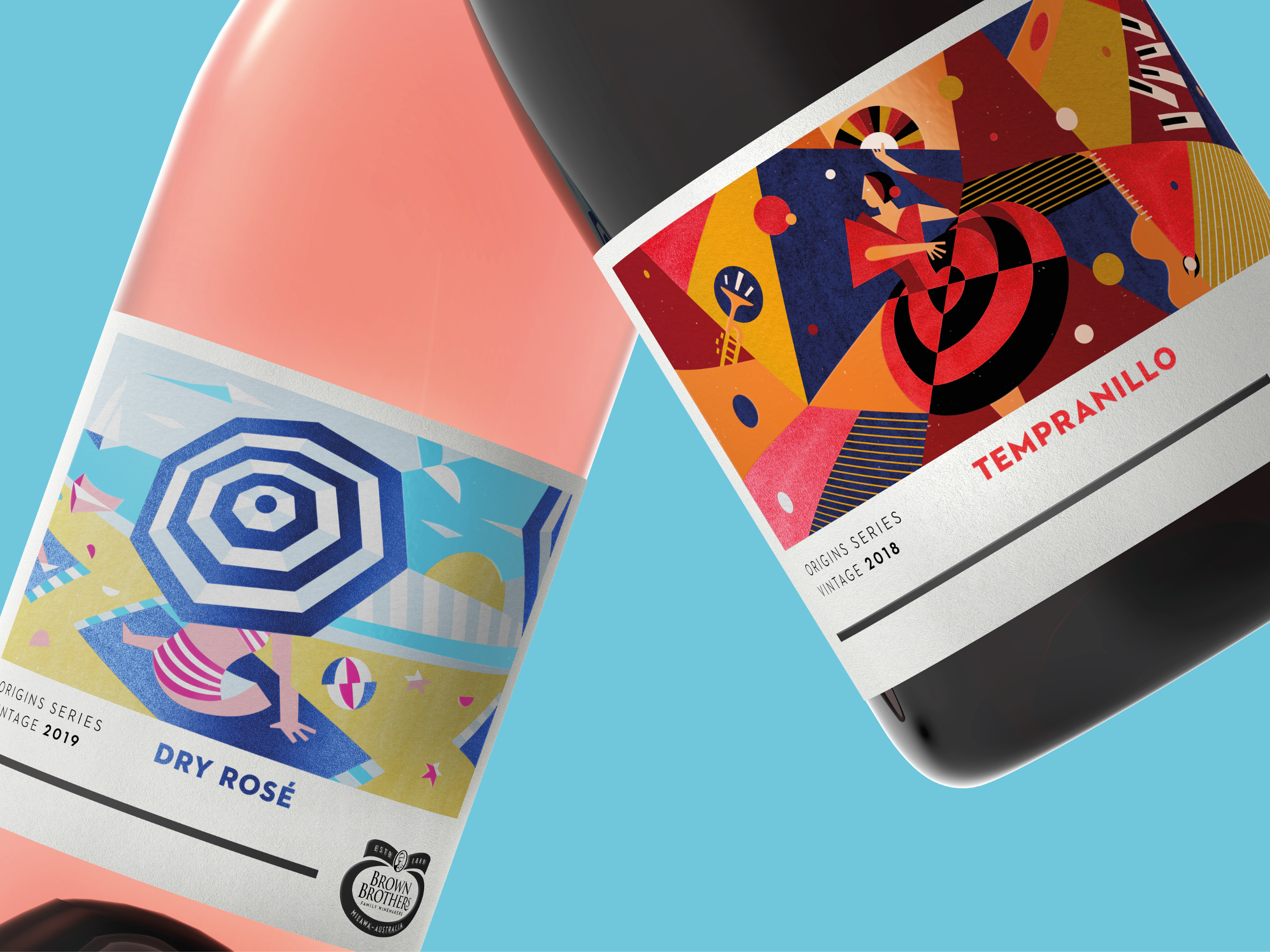 The vibrancy of the Origin country reflects the flavour profile of the wine and allows for an easy comprehension of these new varieties through known semiotics like the Mediterranean and Spanish Flamenco. The heavily foiled, high build label immediately draws the eye on shelf, with the modern, abstract illustration creating dynamism and energy. Our solution for Brown Brothers Origins has a unisex appeal, whilst re-establishing the range as an exciting, modern and proud range within the master portfolio – worthy of recognition.