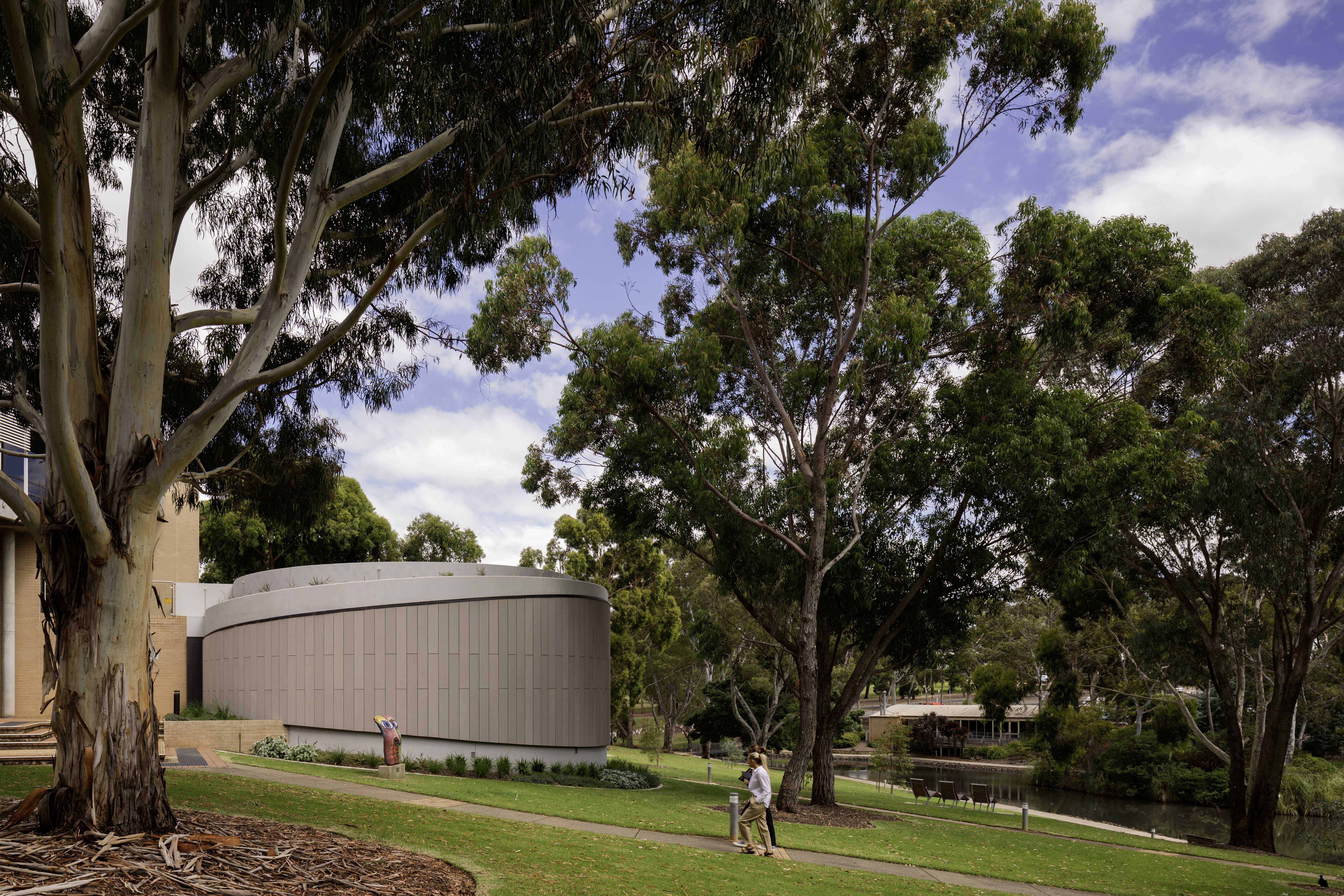 Positioned within a natural setting overlooking a tree lined lake, Nyaal - a world-class interactive learning precinct, steps back into the nature-laden landscape of Deakin University’s Waurn Ponds campus. Proposing a facilities refreshment program in 2019, the University sought to re-engage the Arts and Education faculty and students and provide them with a ‘home’.Utilising the existing building’s strengths, we created a light-filled break out space, a double cylindrical extension housing the 360-degree projection space for specialist teaching, a Think Tank, a digital editing suite and communal rooftop garden. Recognising the symbiosis between technology, education and the impact digital tools can have on transforming pedagogy, the Faculty of Arts and Education developed a new teaching methodology called ‘iSee’ consisting of three core phases: ‘I feel’ ‘I think’ ‘I act’. Nyaal meaning to ‘open your eyes’ in the language of the Wadawurrung people, traditional owners of Djilang (Geelong), is designed to balance a program of formal and informal learning spaces and is aligned to that support the three core phases. The 360-degree projection space immerses users in an experience they see and feel through a sensory journey using light, colour, motion and acoustics. In the Think Tank, students take their shared experiences into the ‘I think’ phase through discussions in a round table environment, and finally transition to the ‘I act’ phase, where students plan their next course.These remarkable spaces are flexible and cater to various uses and diverse pedagogical approaches, made possible by their interactive and multipurpose nature.
