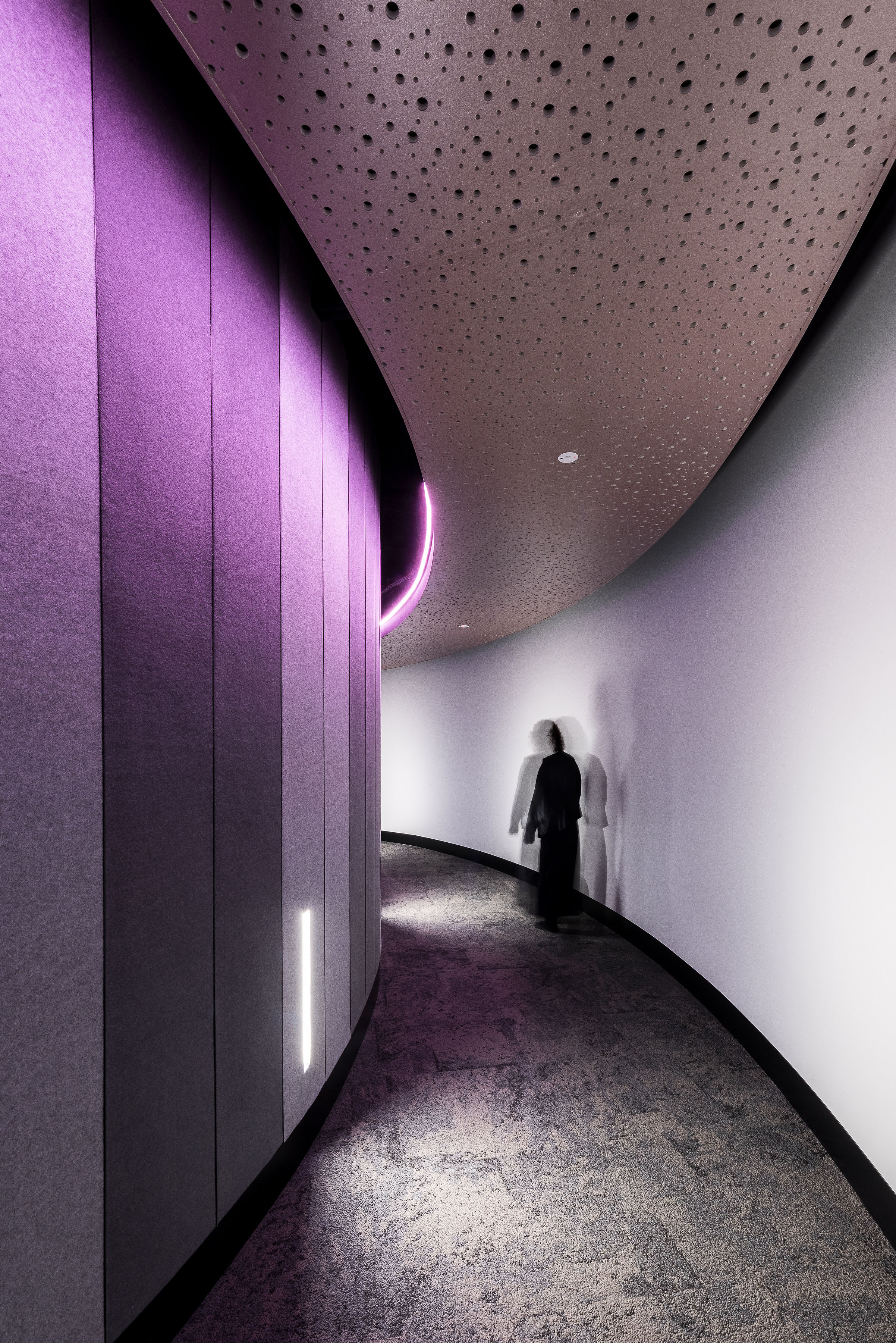 Located in a natural setting overlooking a tree lined lake, Nyaal relates to its surroundings through a tactile material palette and organic building arrangement. Consisting of two north facing cylindrical forms, the seamless extension complements the existing sandy masonry building with shades of grey and taupe textured façade panels. These wrap around the exterior, inviting users to interact with the tactile striation as they make their way to the entrance.