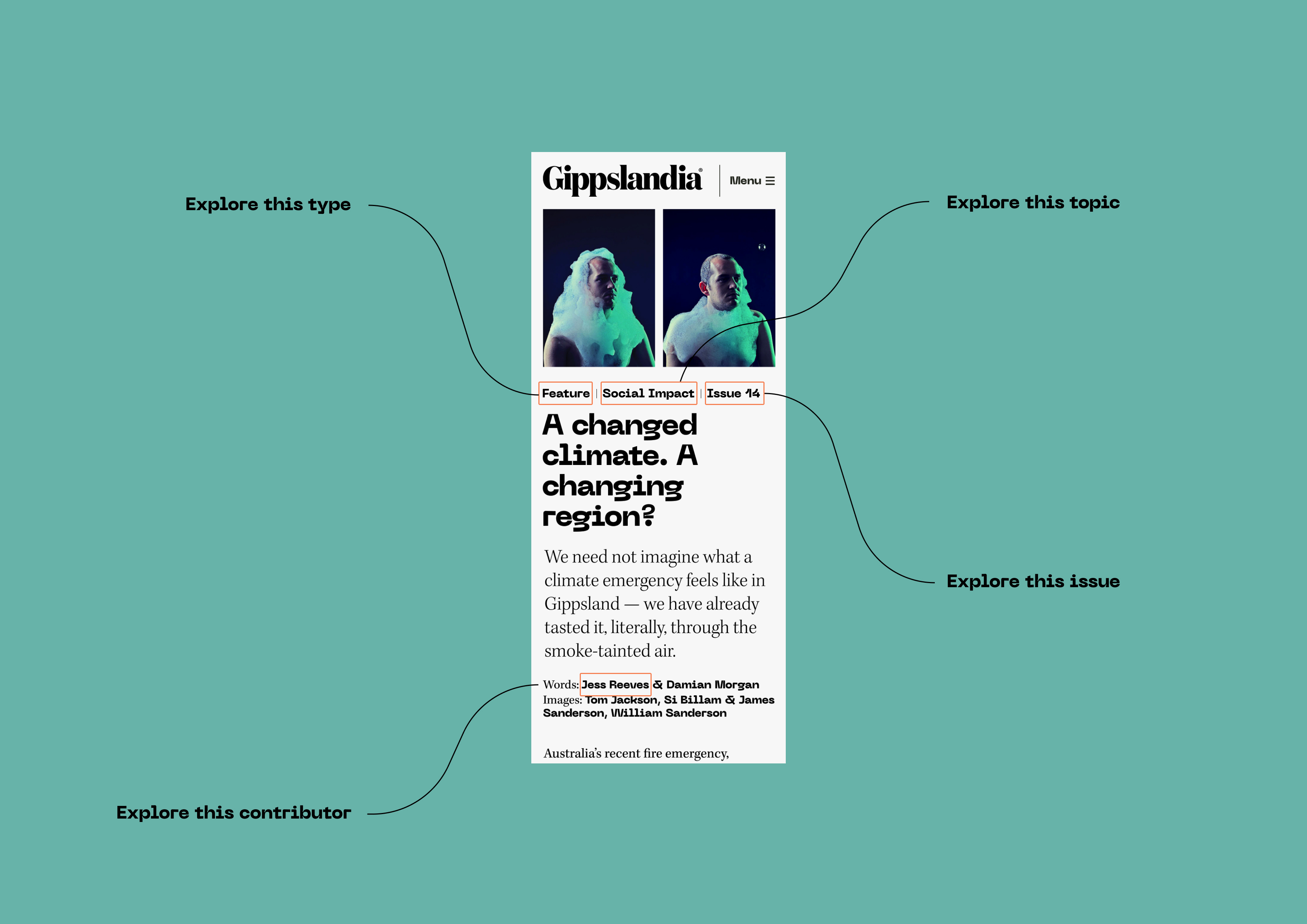 We completed an audit on the existing site to define different ways into content. Identifying a refined set of topics, content types, and regions enabled us to anchor content to consistent themes, while allowing users to discover the diverse stories created by Gippslandia’s community of writers, makers and creatives.