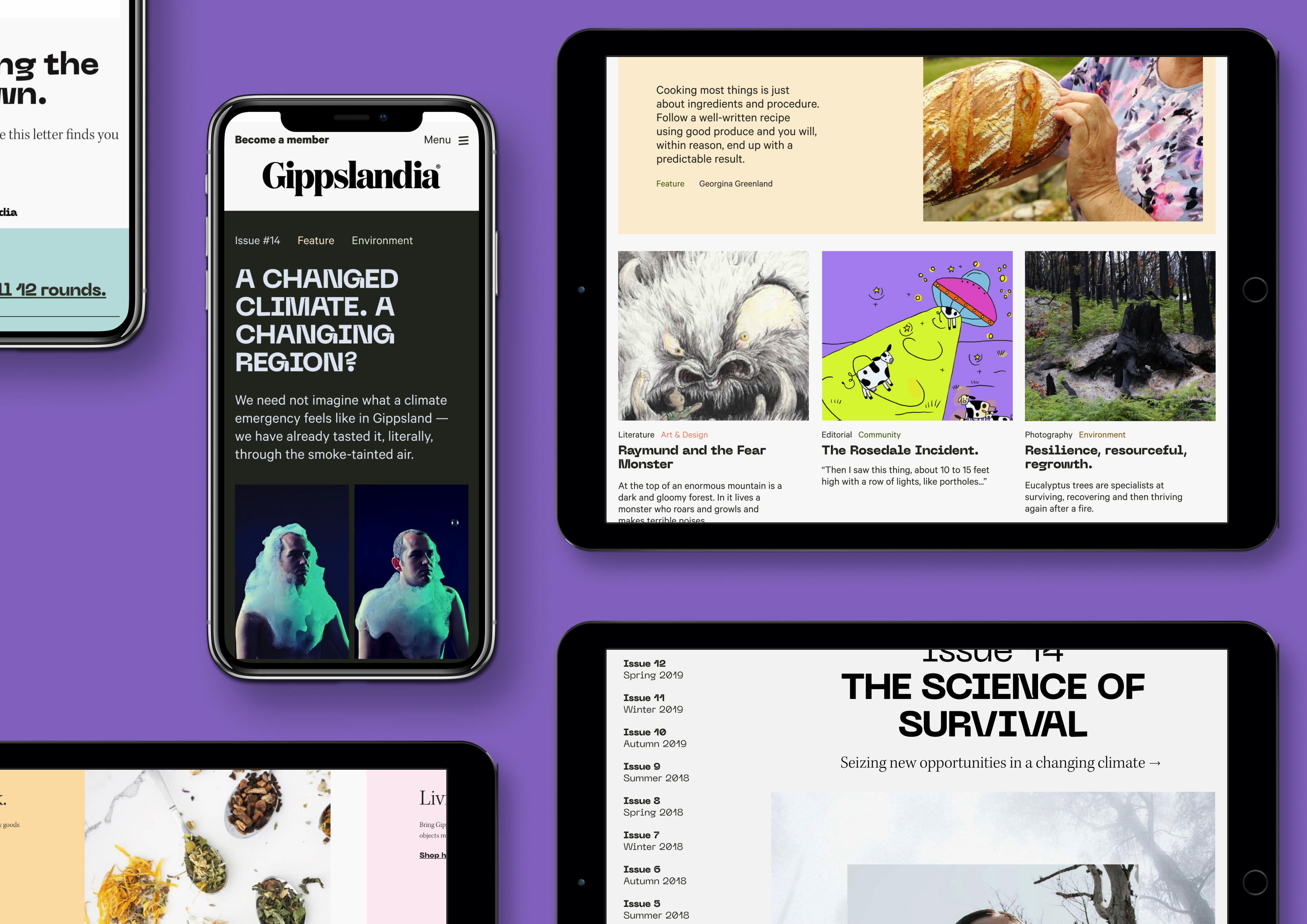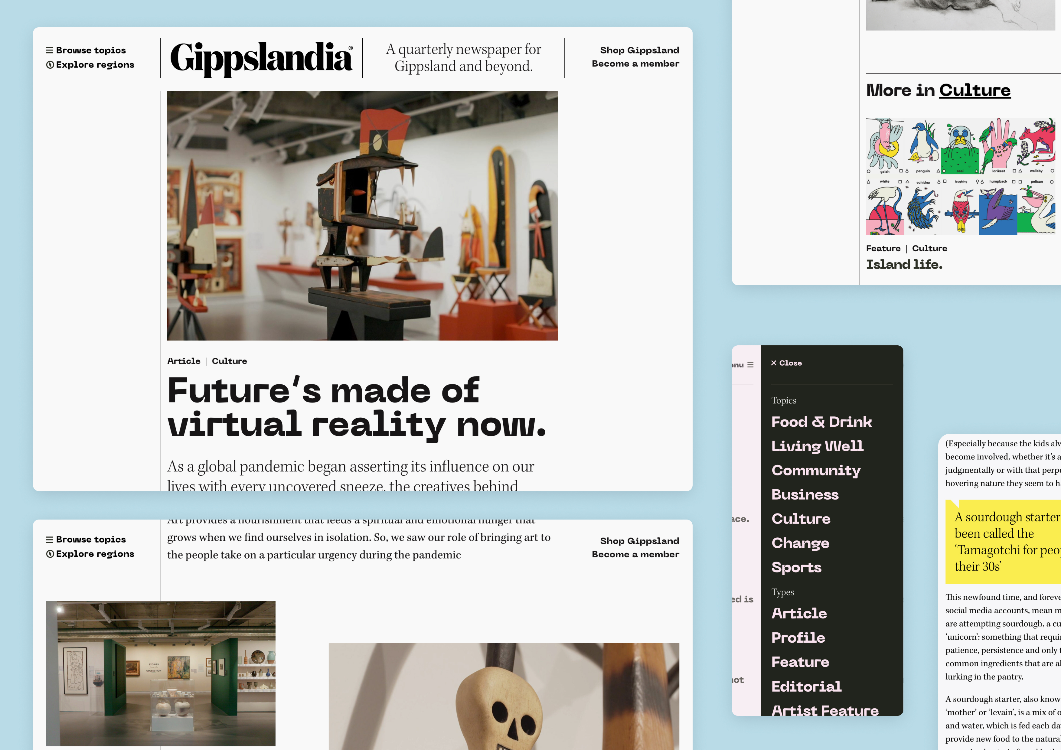 The visual design of Gippslandia takes cues from the print publication and elevates them for the digital context. Bold typography paired with a grid-bending layout creates an engaging experience across all devices and screen sizes—bringing the eccentricity, artfulness and liveliness of the Gippsland region to life online.