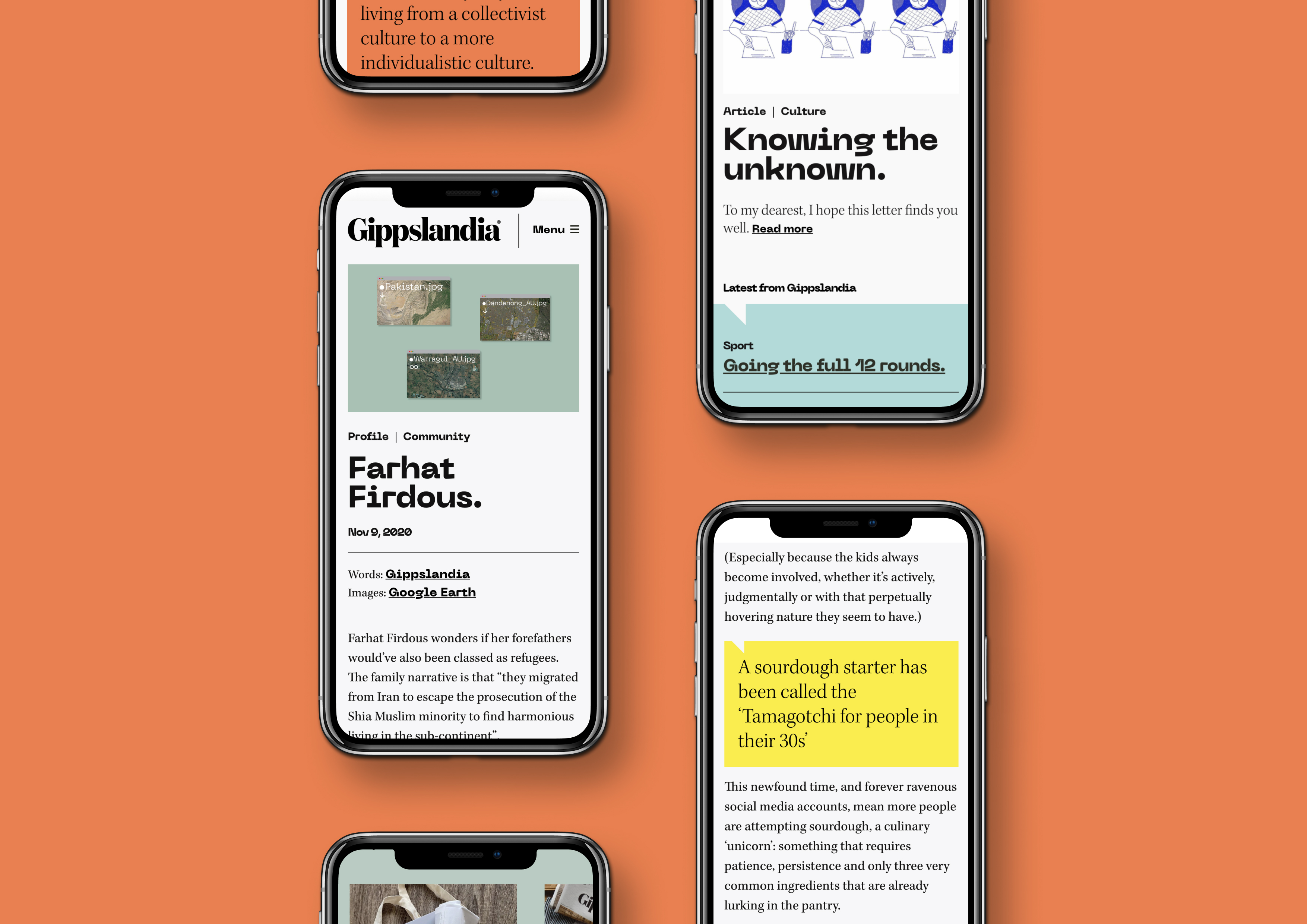 The visual design of Gippslandia takes cues from the print publication and elevates them for the digital context. Bold typography paired with a grid-bending layout creates an engaging experience across all devices and screen sizes. Bringing the eccentricity, artfulness and liveliness of the Gippsland region to life online.