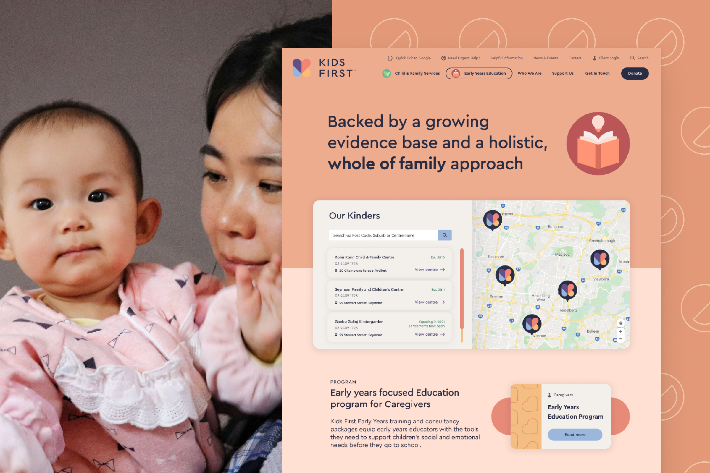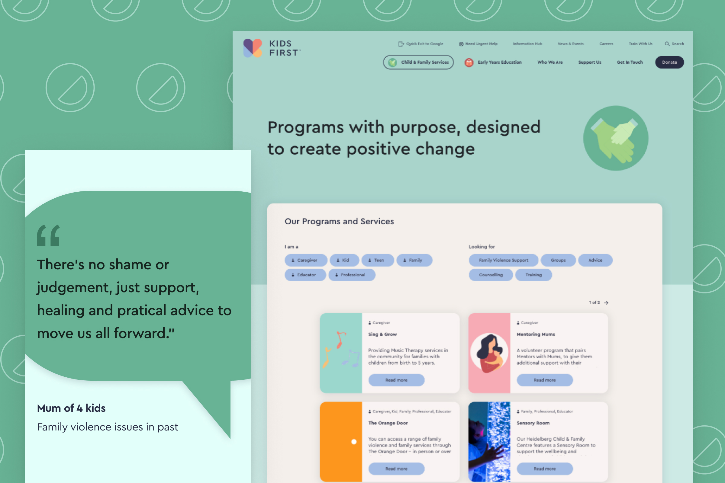 Informed by a comprehensive customer and stakeholder research period, it was essential that the rebuilt site would make accessing Kids First’s programs quick and easy, whether the user is a parent looking for a school to send their child to, or someone in urgent need of a support service.