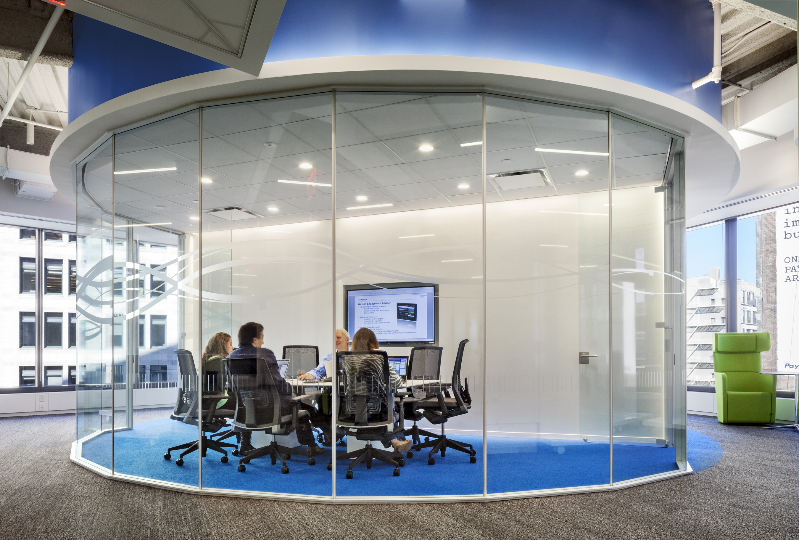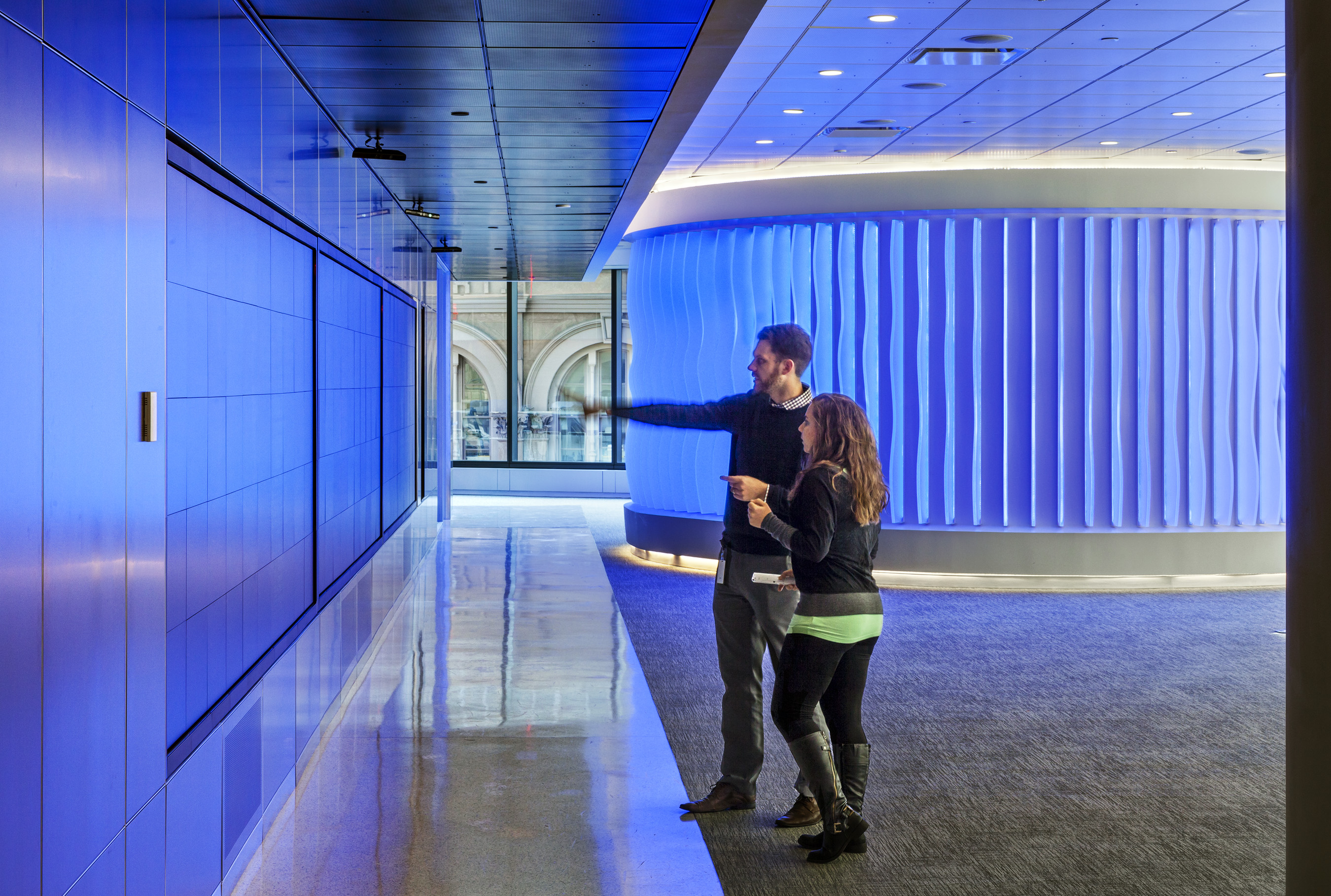 The Design approach was to create a blank canvas from which IBM could operate in an ever-changing environment, one that is fluid and expansive rather than static and fixed. To represent Watson’s capabilities, The Switzer Group designed a total sensory experience on the office’s fifth floor. Architectural fins that change color with the voice of Watson surround the circumference of the immersion room, where clients can interact directly with the technology. A 40 ft. video wall equipped with Oblong Industries’ futuristic Mezzanine ™ system allows visitors to move data from one screen to another with a wave of their hand. The enclosed experience is an "Immersion Room" where people can enter and be immersed in a three dimensional environment where clients can further explore the details of Watson's capabilities - again utilizing Oblong technology for gesture and voice control.