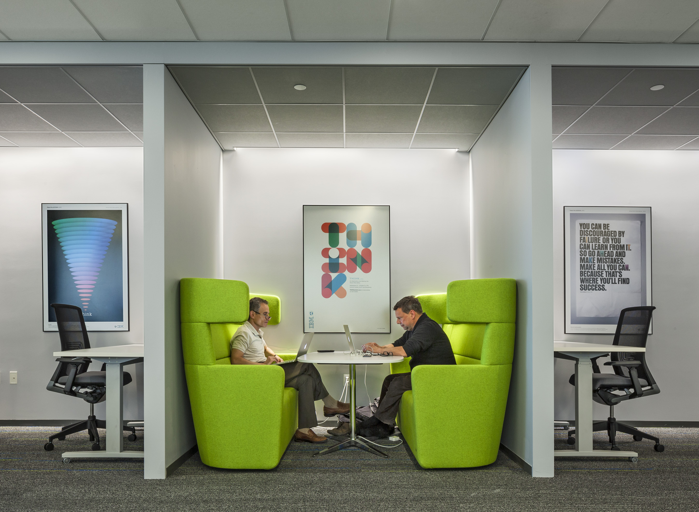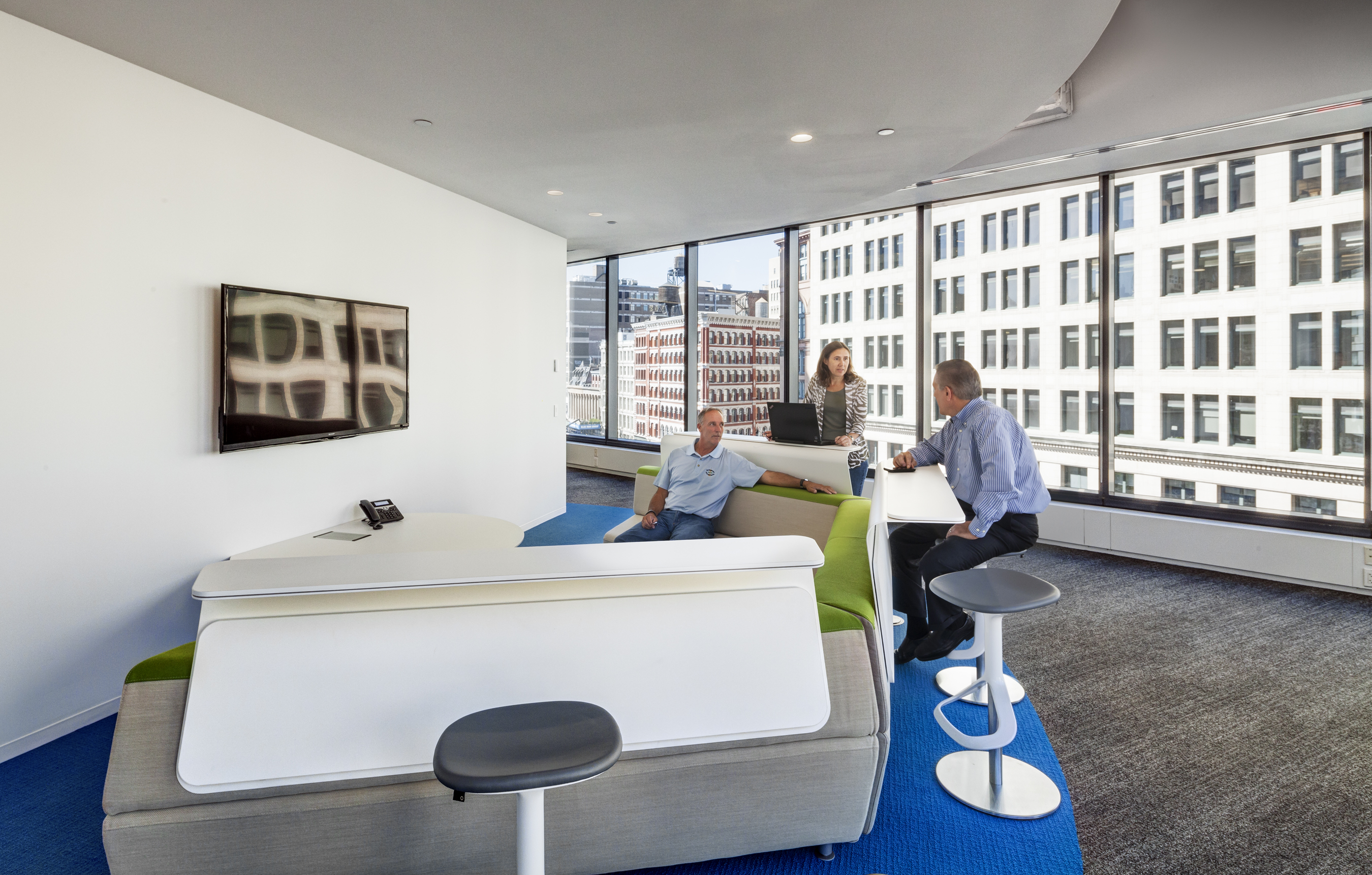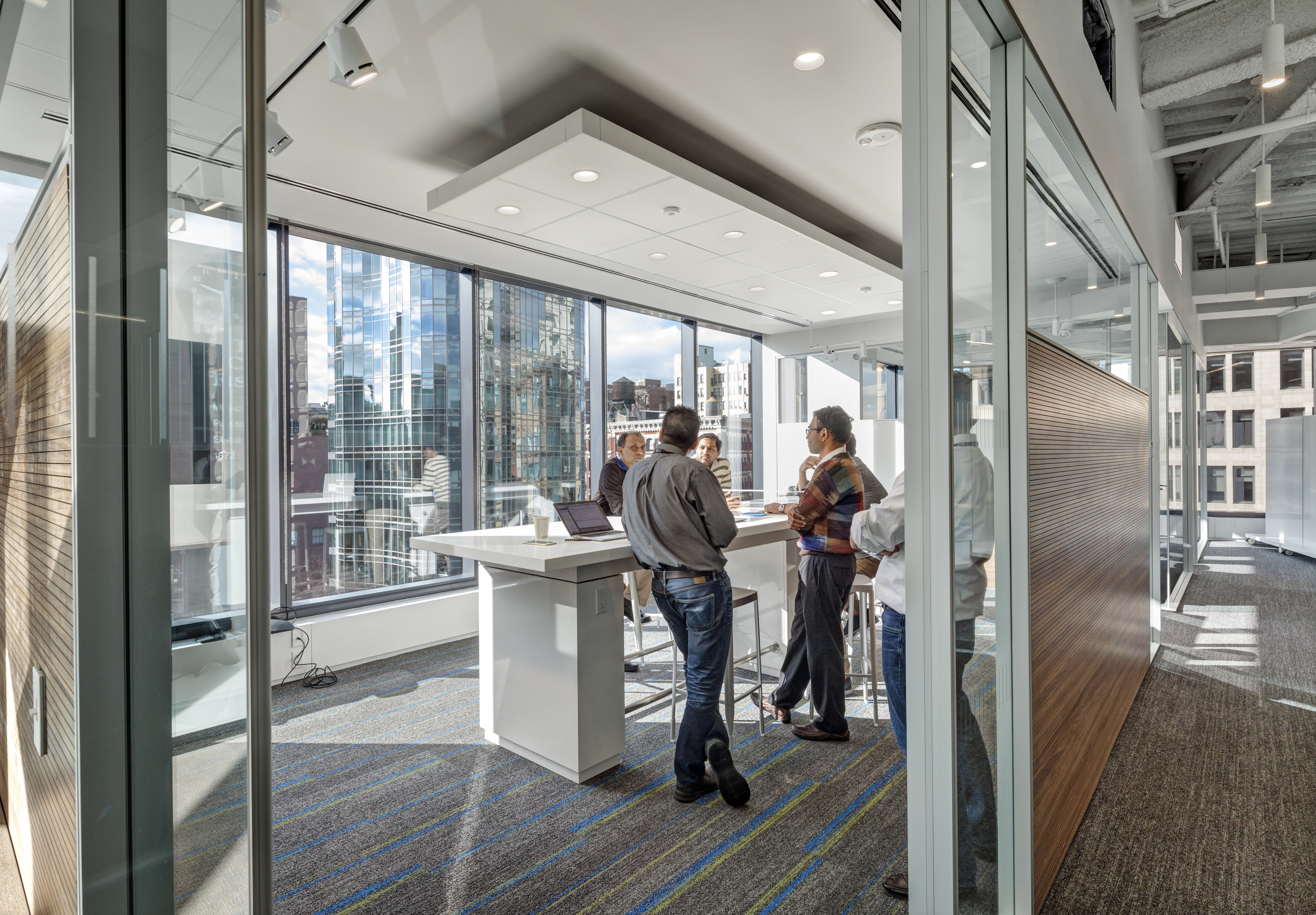 The design is open floor with perimeter glass offices permitting light penetration into the space. There is daylight harvesting, which lowers light levels, using less energy. Additionally, ceramic porcelain was used on the walls of the elevator lobbies, which has a thinner veneer and therefore less material is used. The design also incorporates LED lighting throughout the project. This project was site driven to attain a target impression and therefore design played the leading role. IBM had existing resources, which had gone through a vetting process with their vendors.