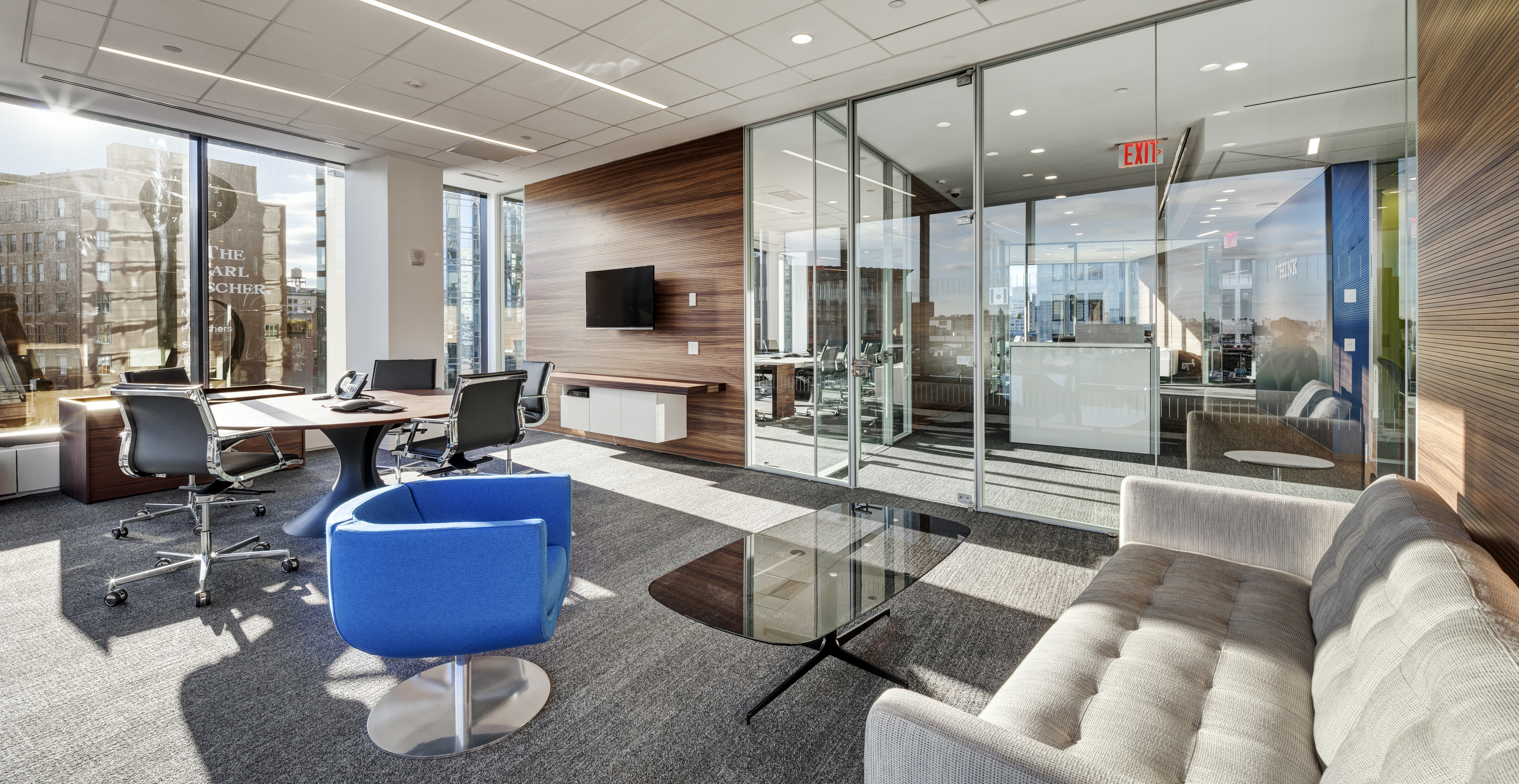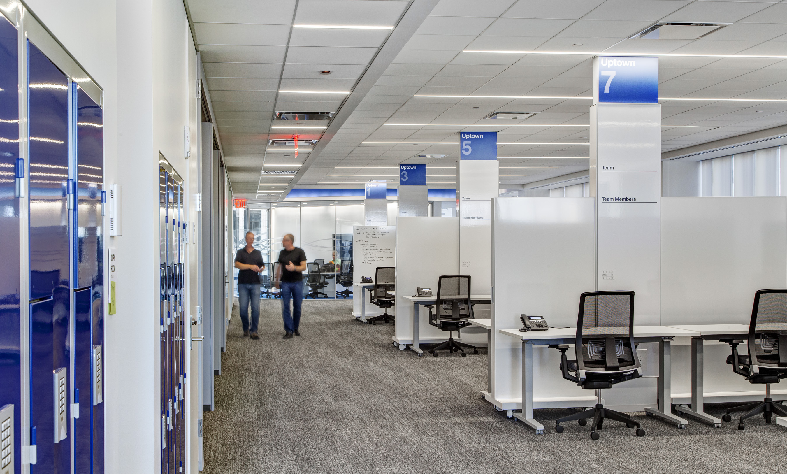 An environment was created which promotes collaboration and interaction. The Switzer Group designed a non-static, flexible space consisting of movable partitions, touch down desking and “bene” banquet quiet work areas, collaborative counters, POD workstations, phone booths, a maker’s space and study areas. Wayfinding is an essential element in the design and multi-purpose power poles were employed which are color coded and moveable to organize and change different groups and departments depending on need. The Switzer Group set the tone with a clean, timeless look for the interiors, combining terrazzo and textured metallic Laminam materials in the elevator banks, and lots of glass, acoustical wood with walnut veneers, European-inspired furnishings and LED lighting throughout. The fourth floor design studio is a totally flexible, open floor plan, divisible by hanging panels that double as marker boards. Desks with all white surfaces are moveable and can be raised and lowered for standing or sitting. To counterpoint the wide open spaces, seating areas and niches for small group gatherings, and glass enclosed “phone booths” for increased privacy, are strategically situated.